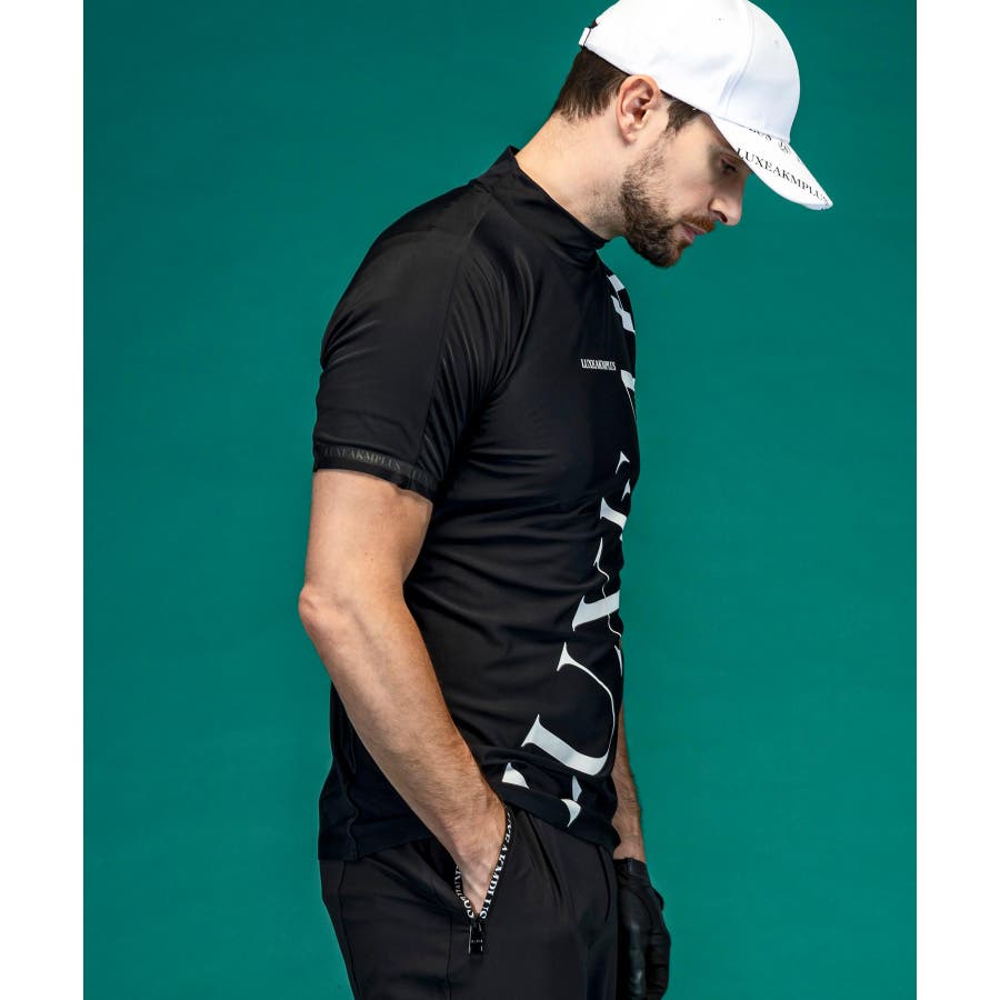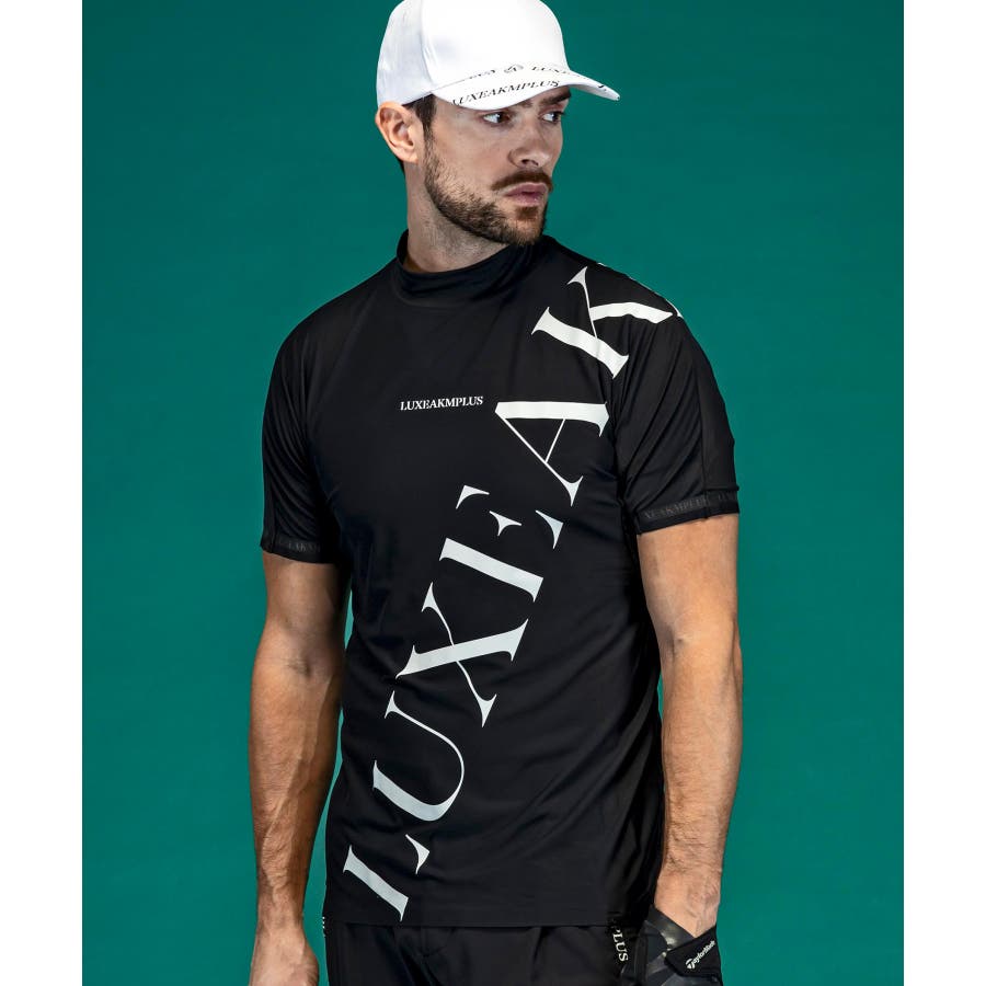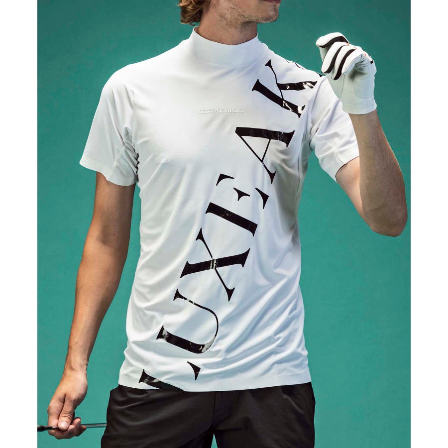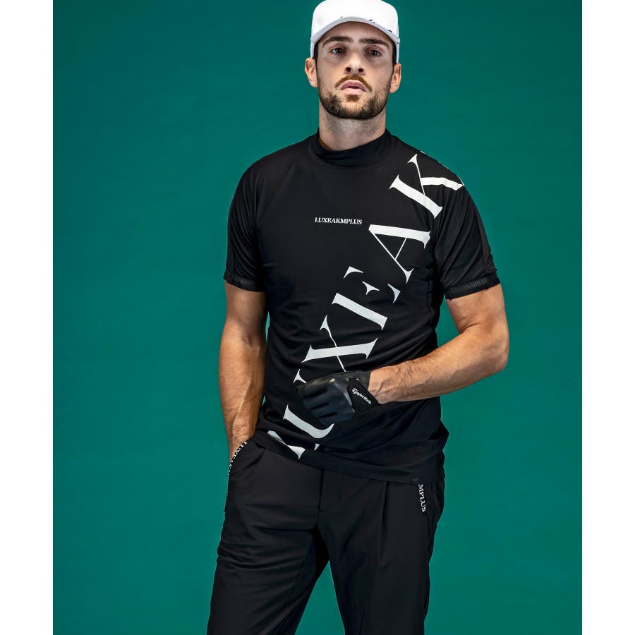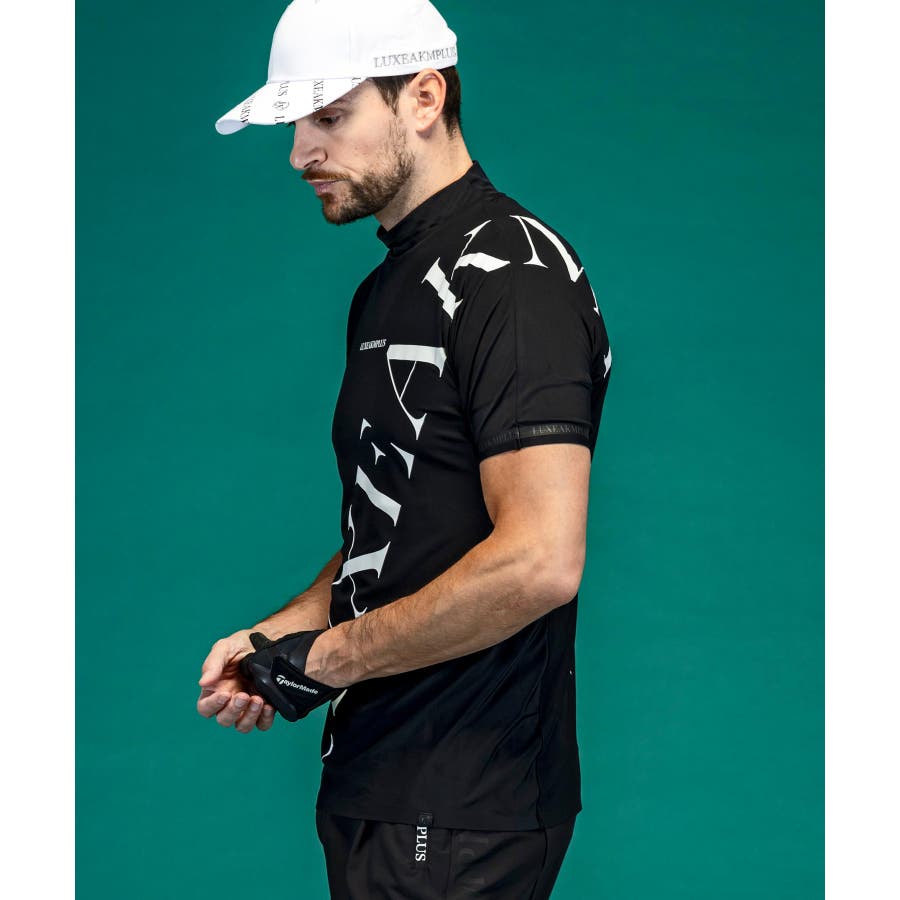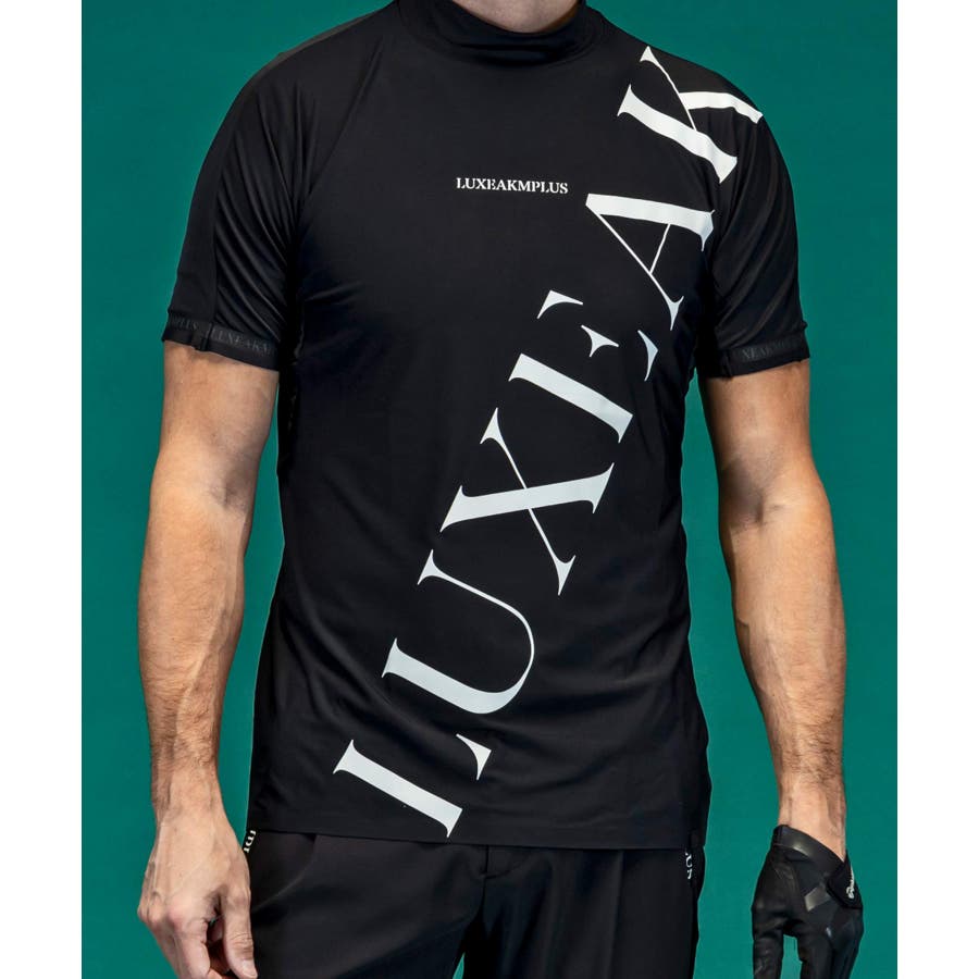 両面に入ったブランドロゴがインパクトのあるモックネックTシャツ。