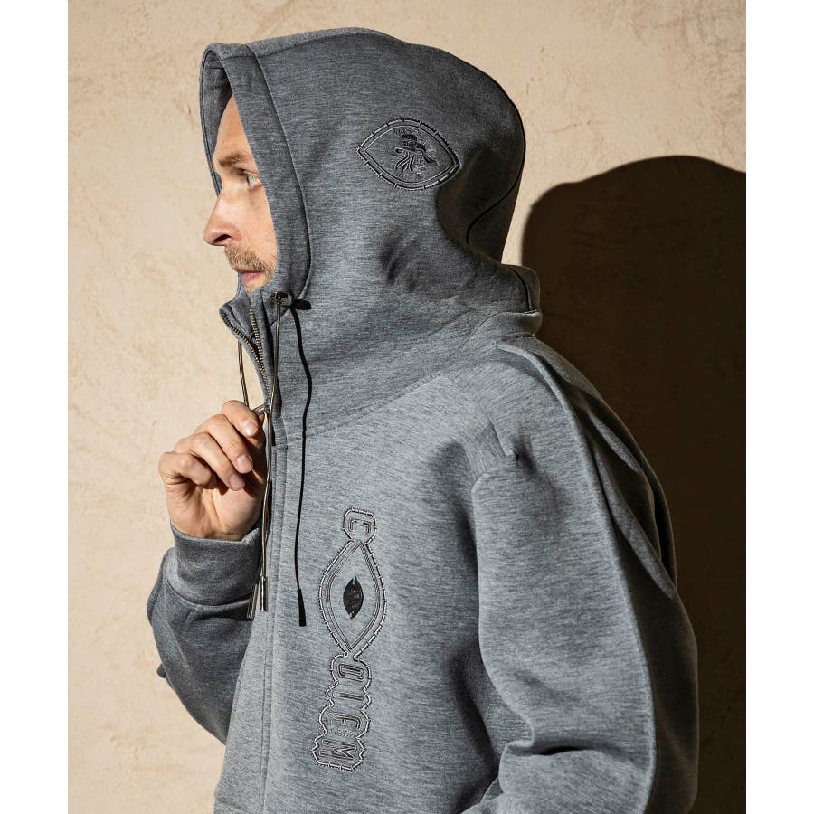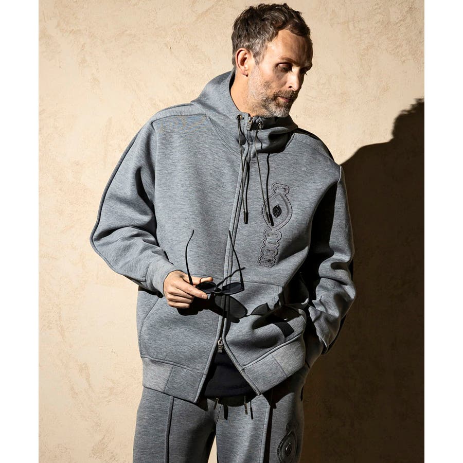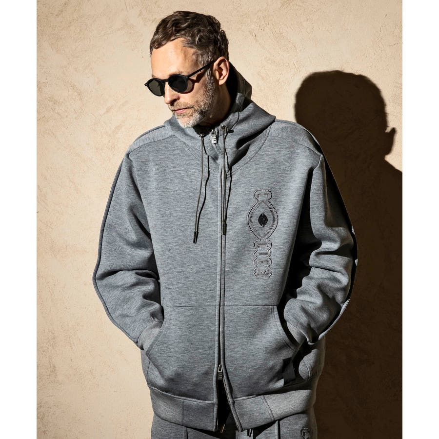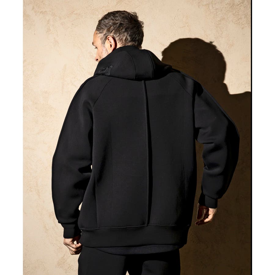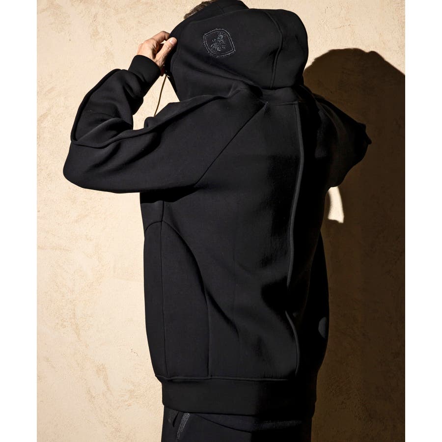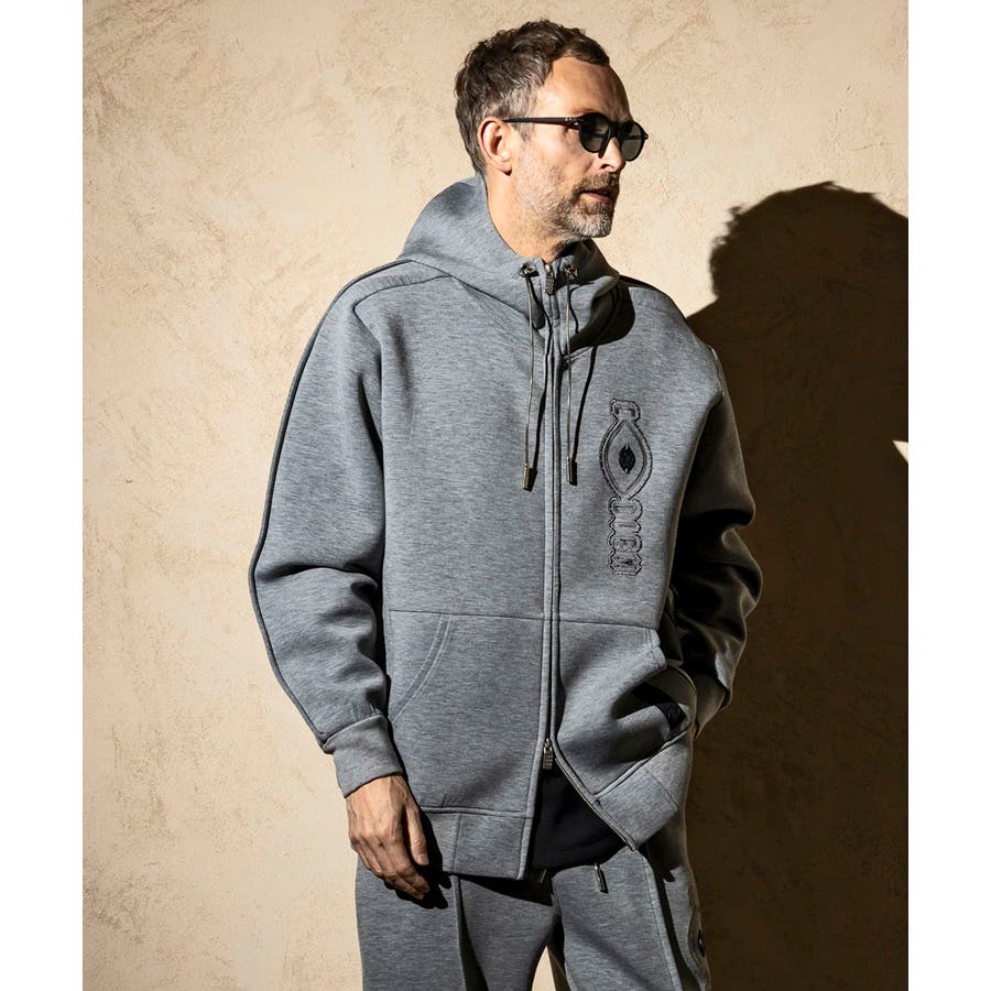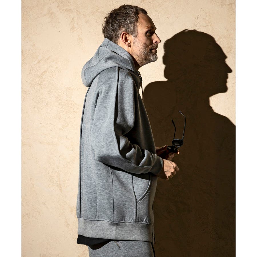 伸縮性の非常に高いダンボールニットを使用したジップアップパーカー。