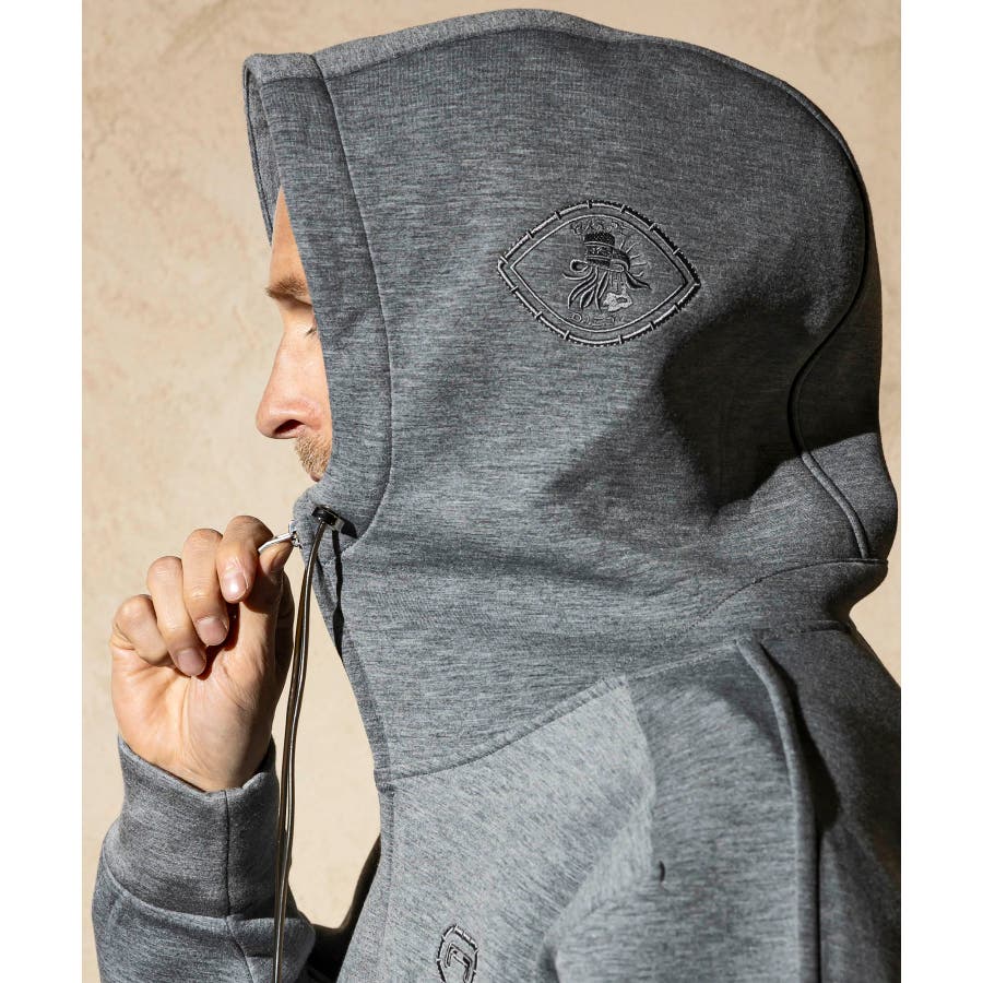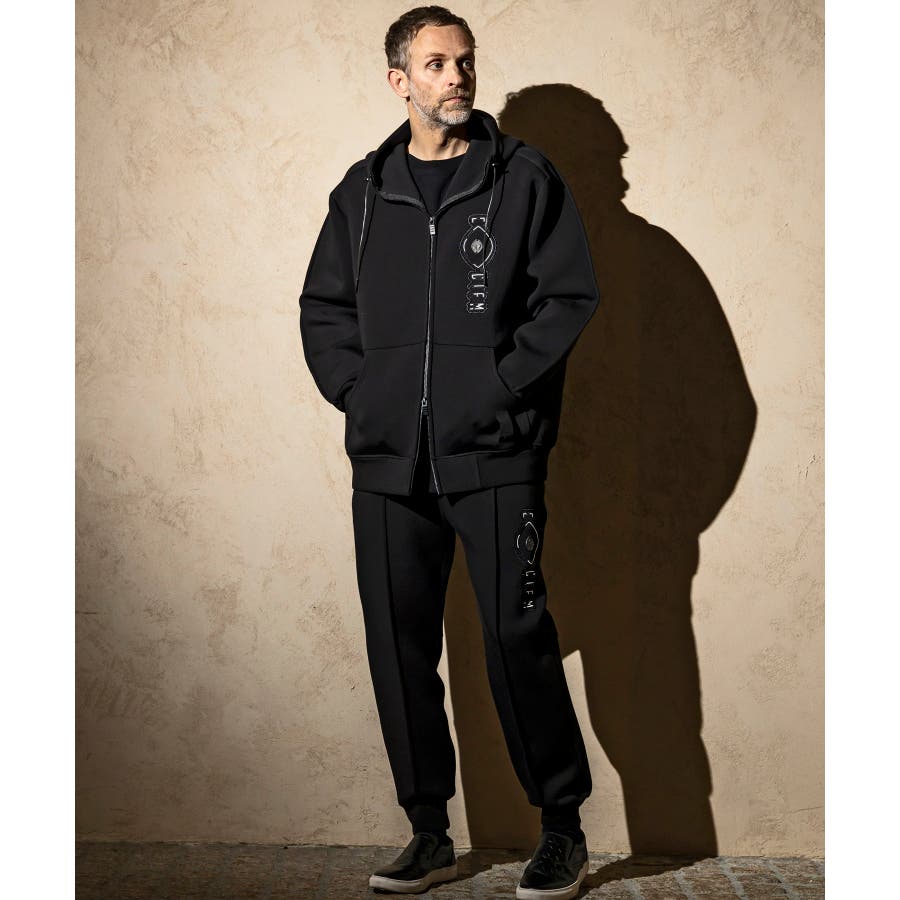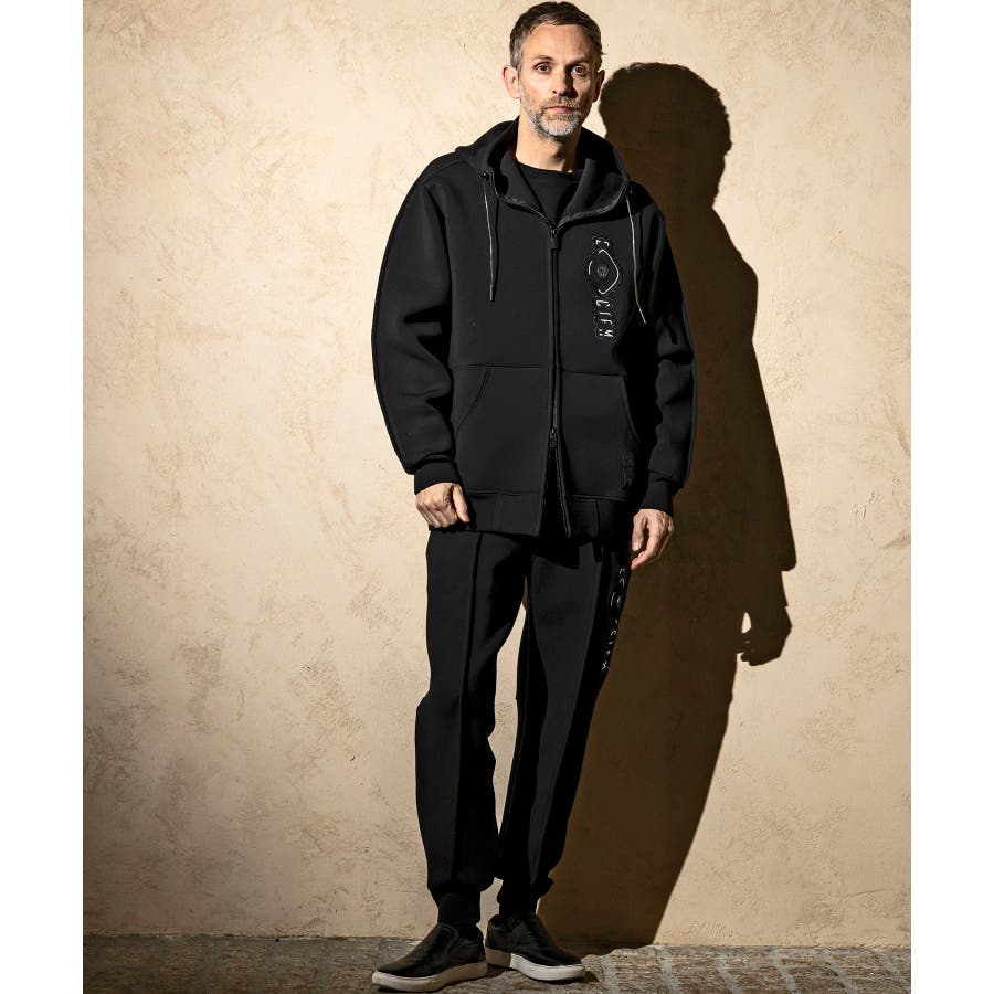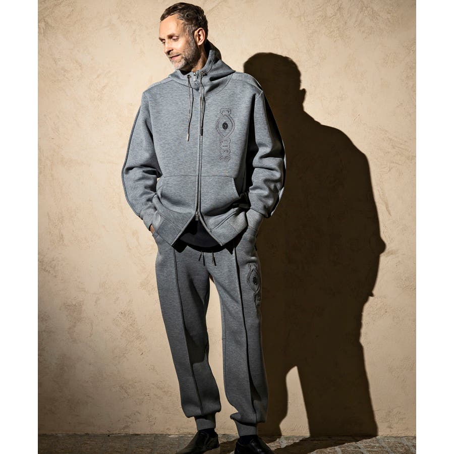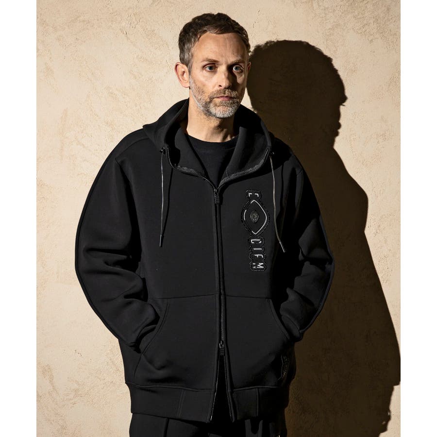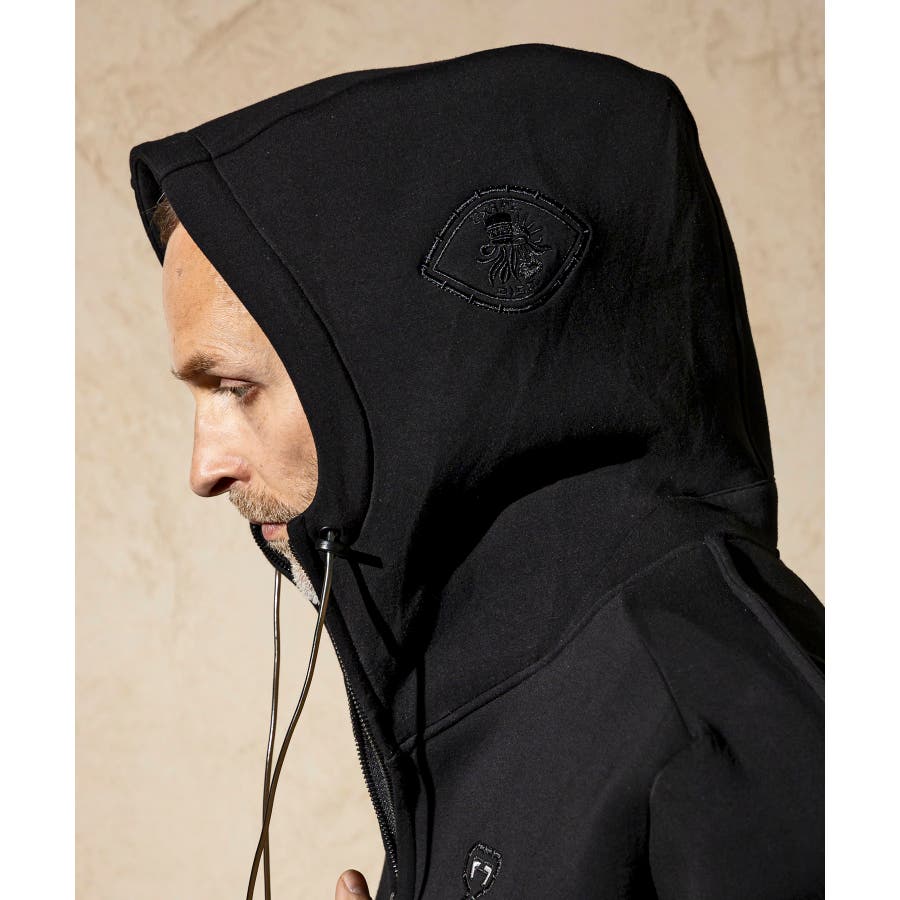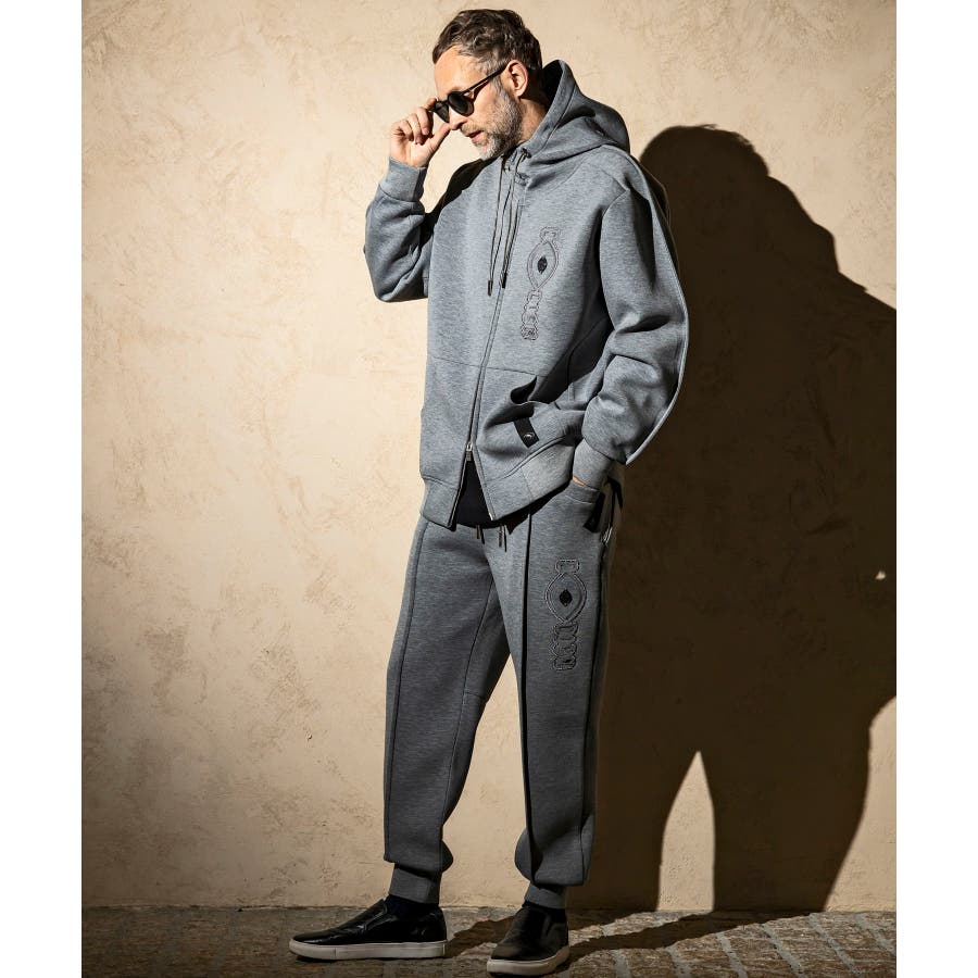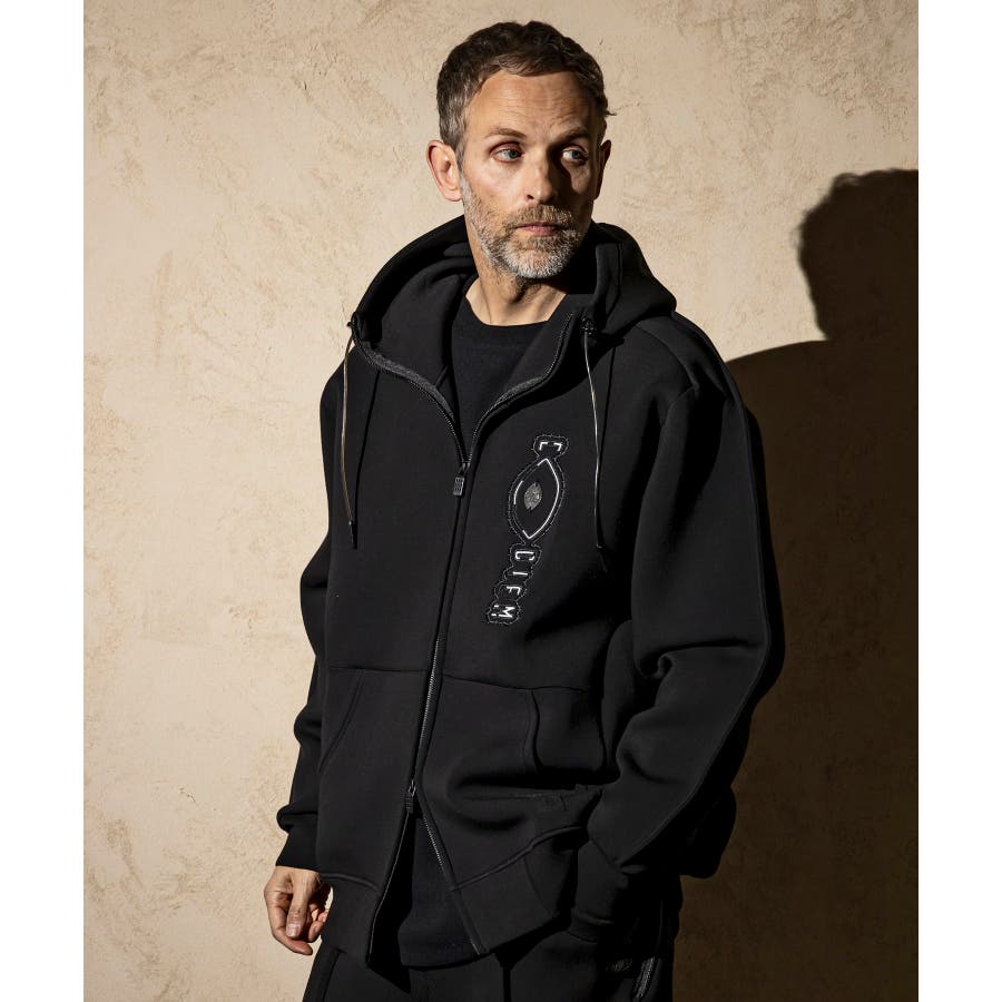 伸縮性の非常に高いダンボールニットを使用したジップアップパーカー。