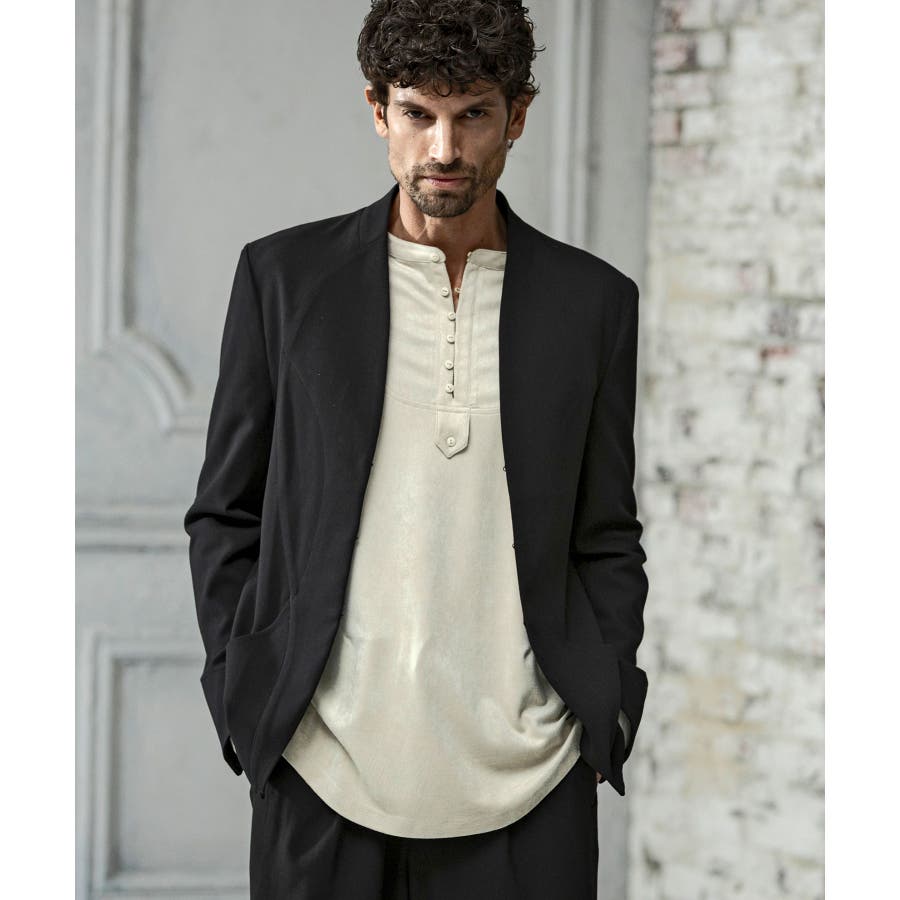 軽やかに仕立て上げ、かつミニマルなデザインを追求し裏地の無い一枚仕立て、フロントはフックを採用しています。