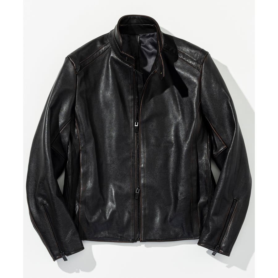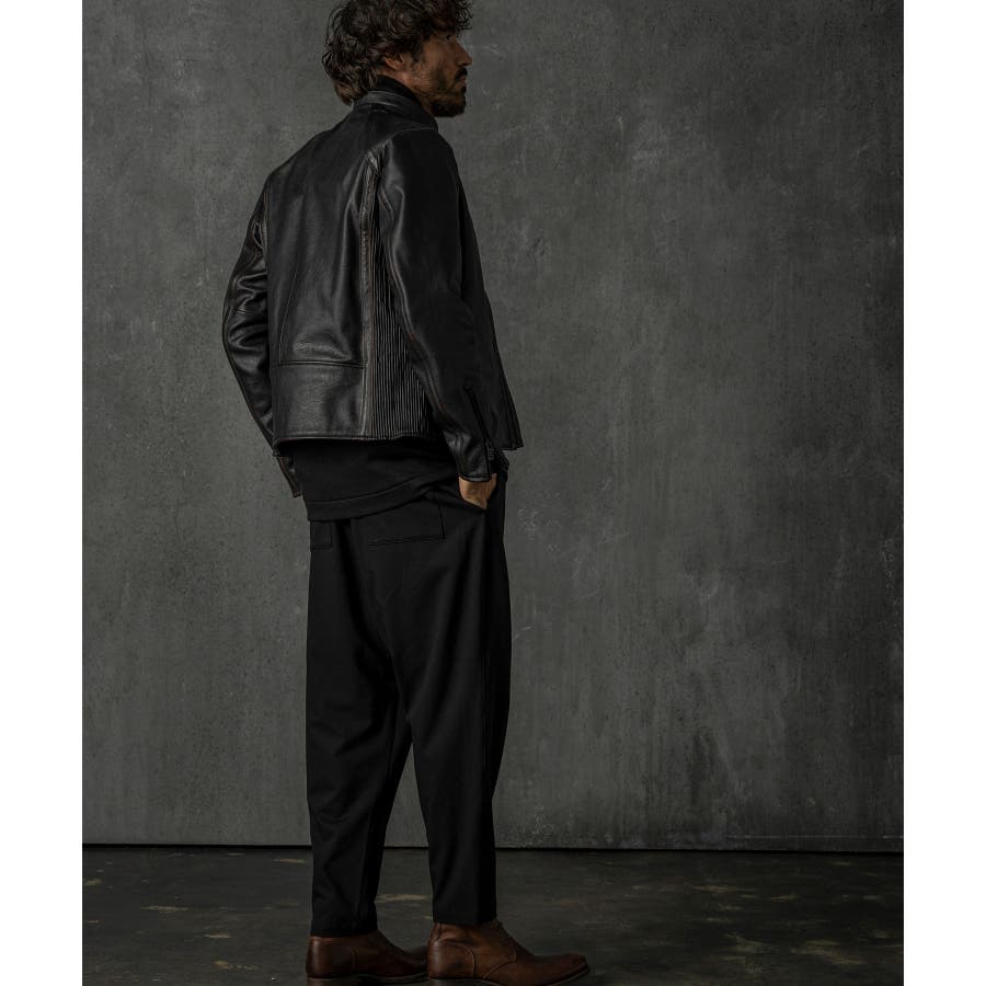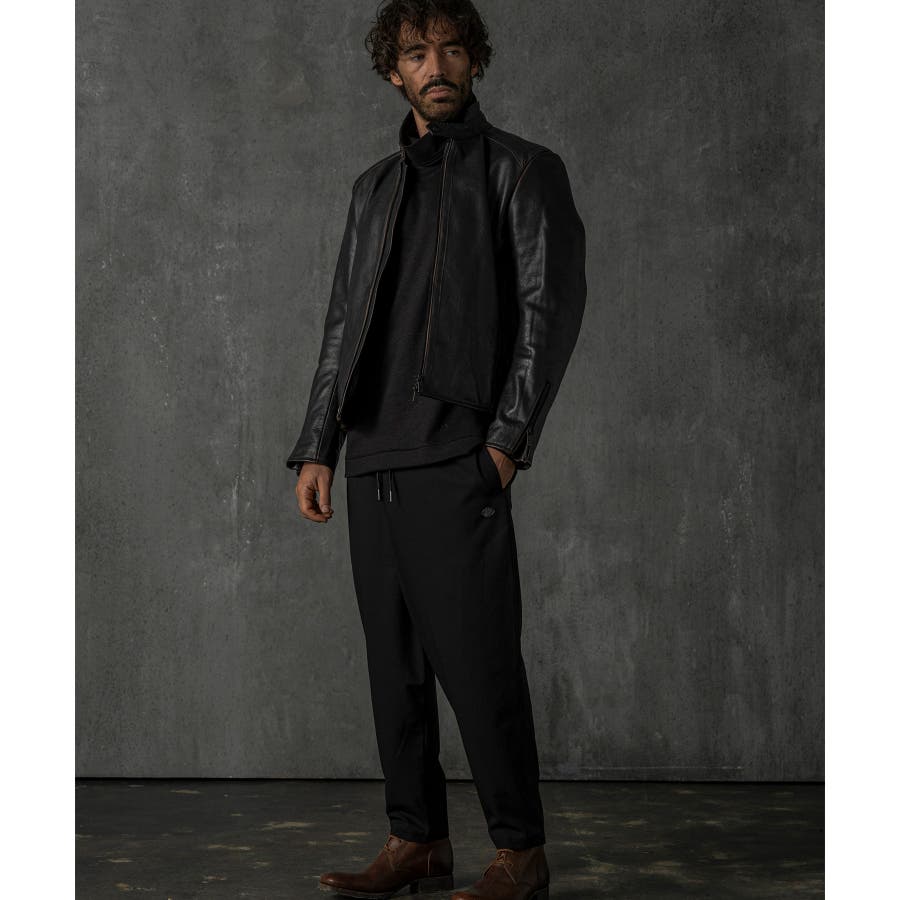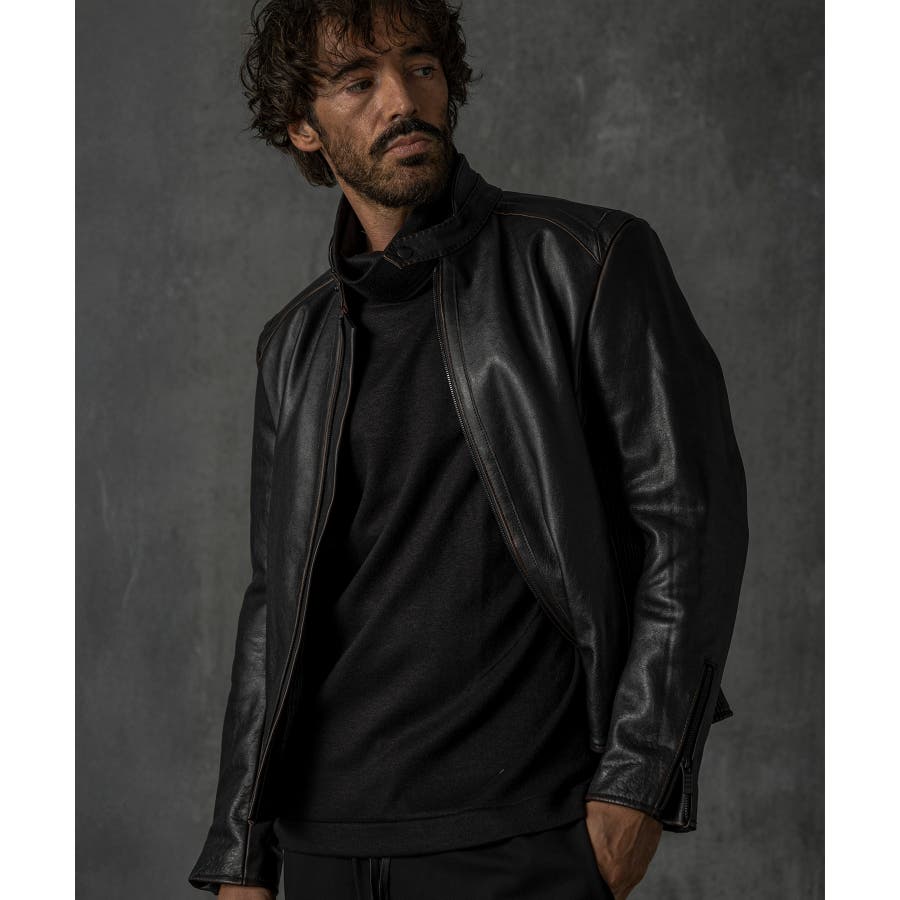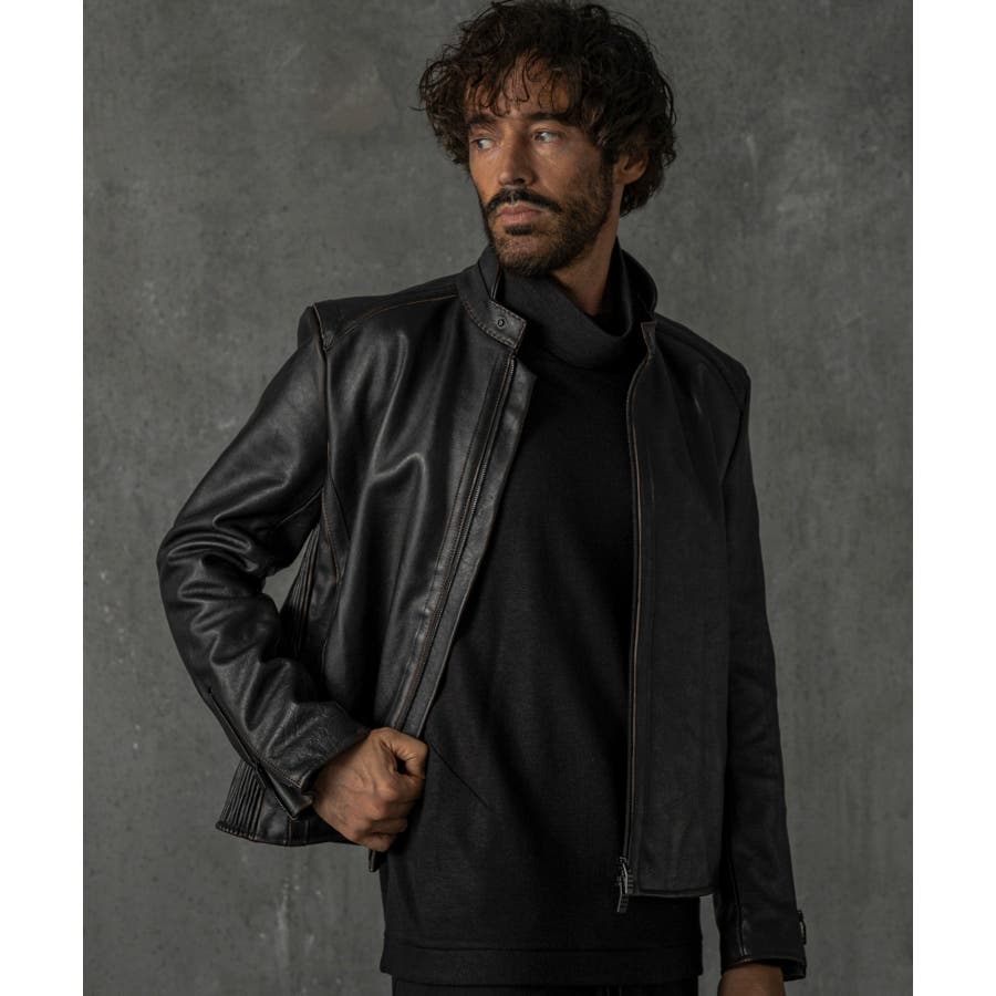 首に沿う形のダブルスタンドカラーや、運動量をもった脇の伸縮レザーリブなど、個性的・機能的なディティールをアクセントにしています。
