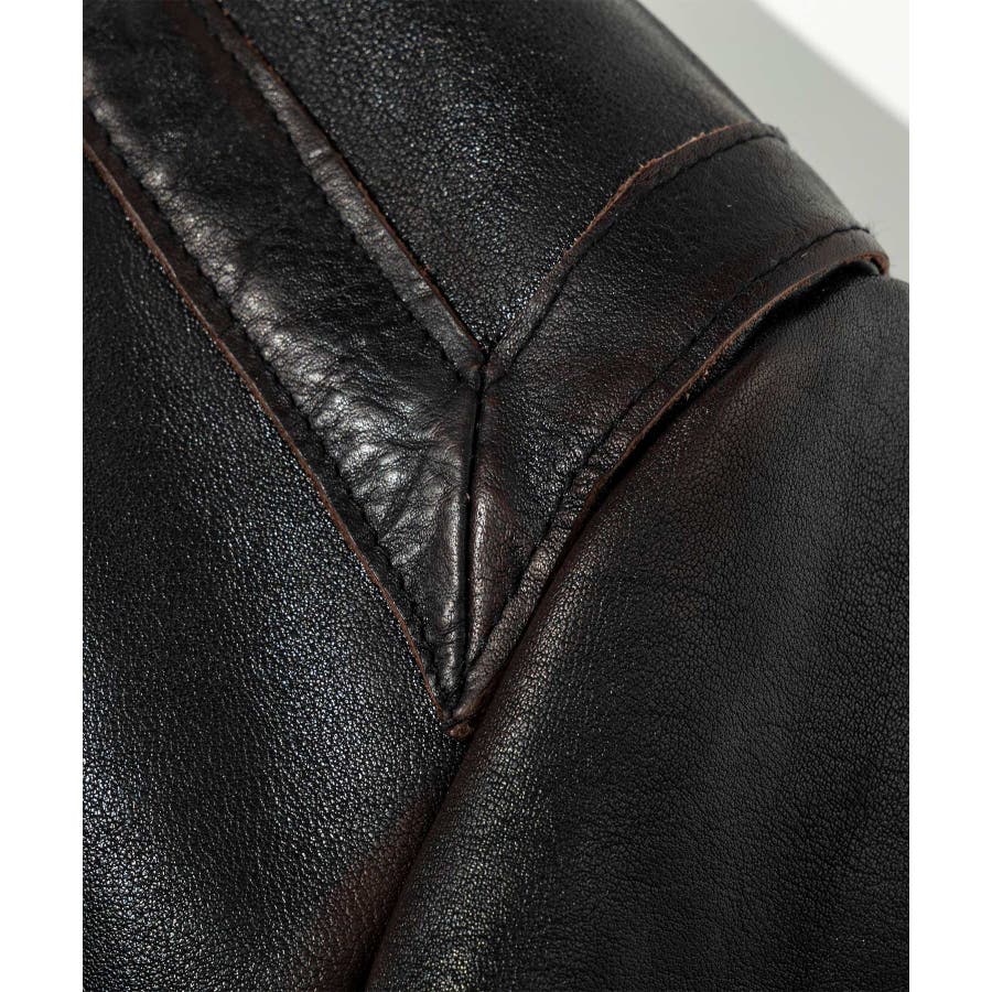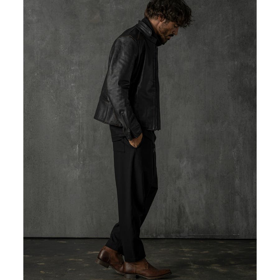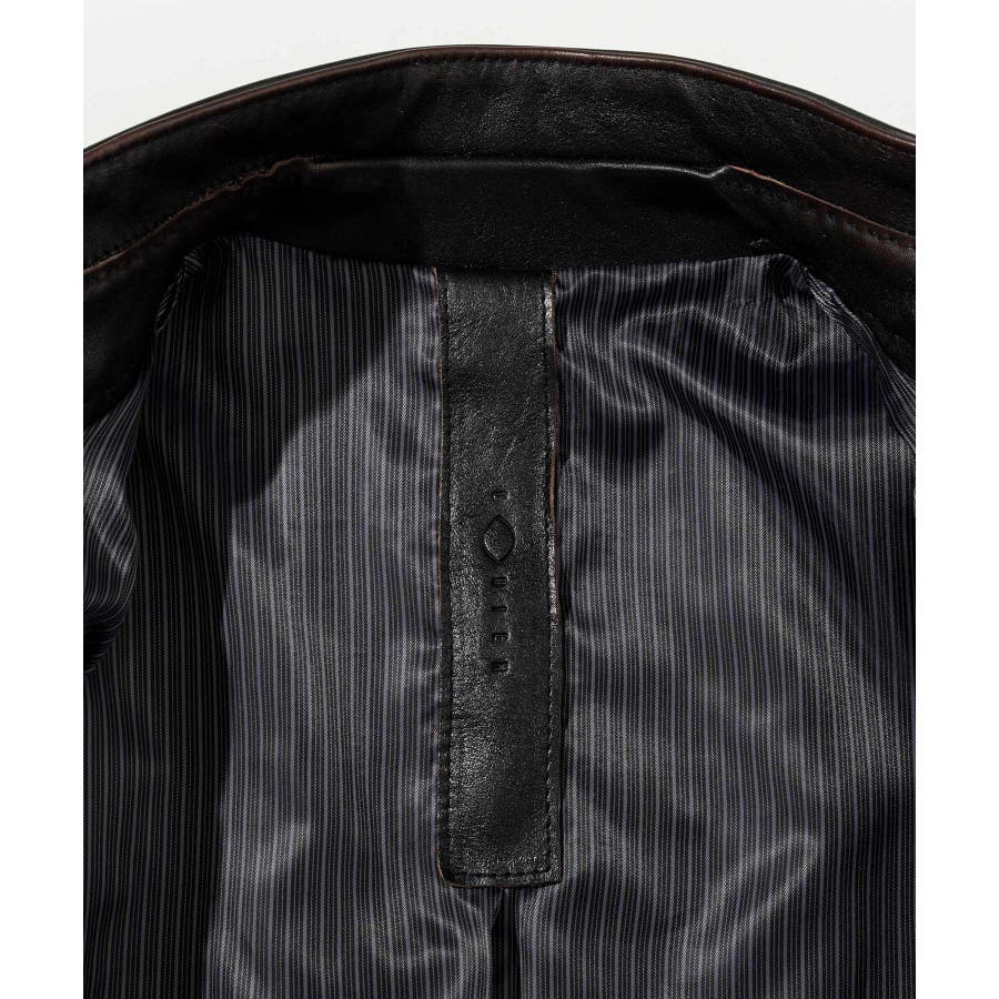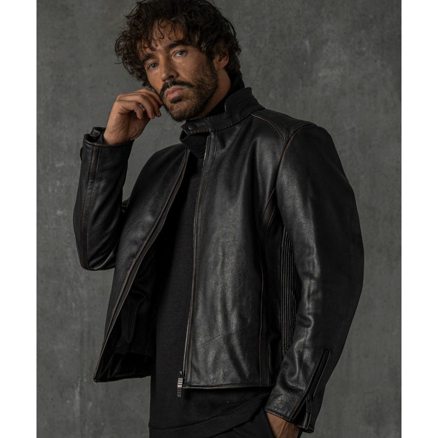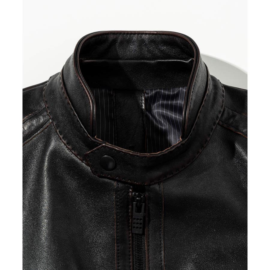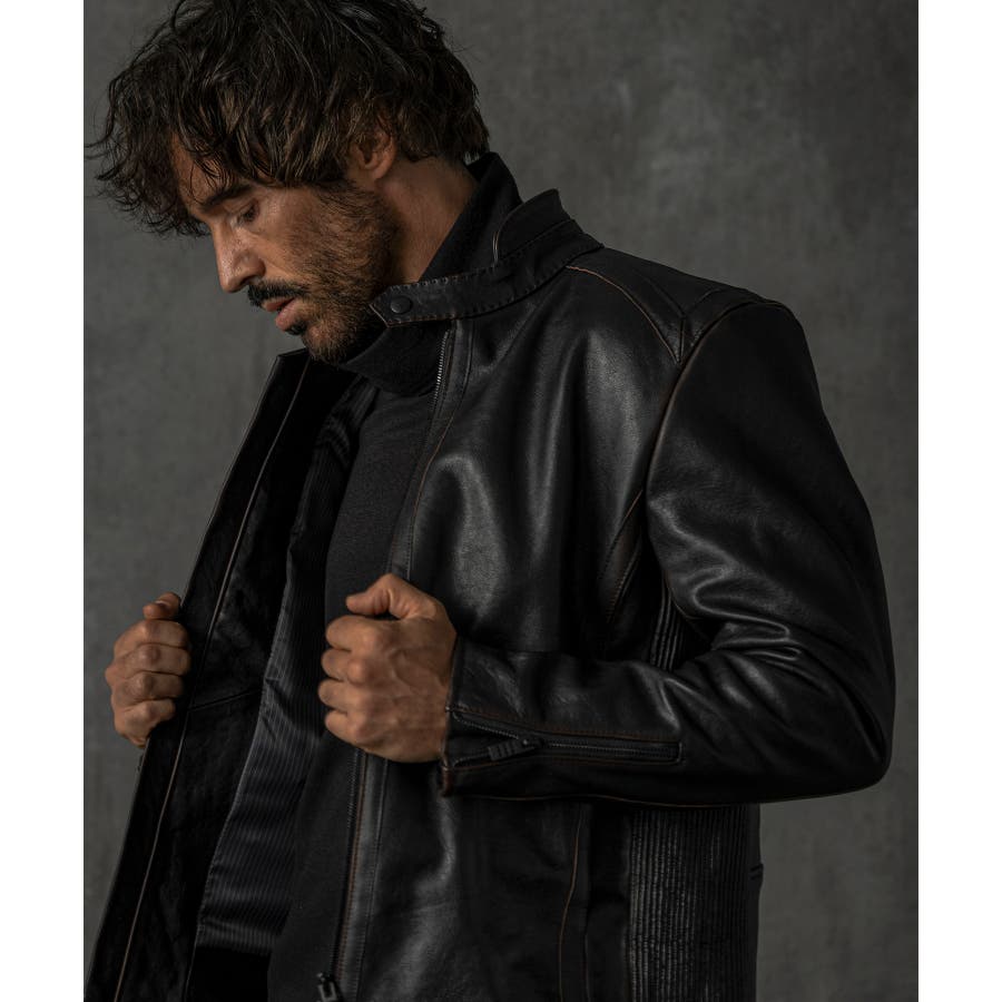 首に沿う形のダブルスタンドカラーや、運動量をもった脇の伸縮レザーリブなど、個性的・機能的なディティールをアクセントにしています。