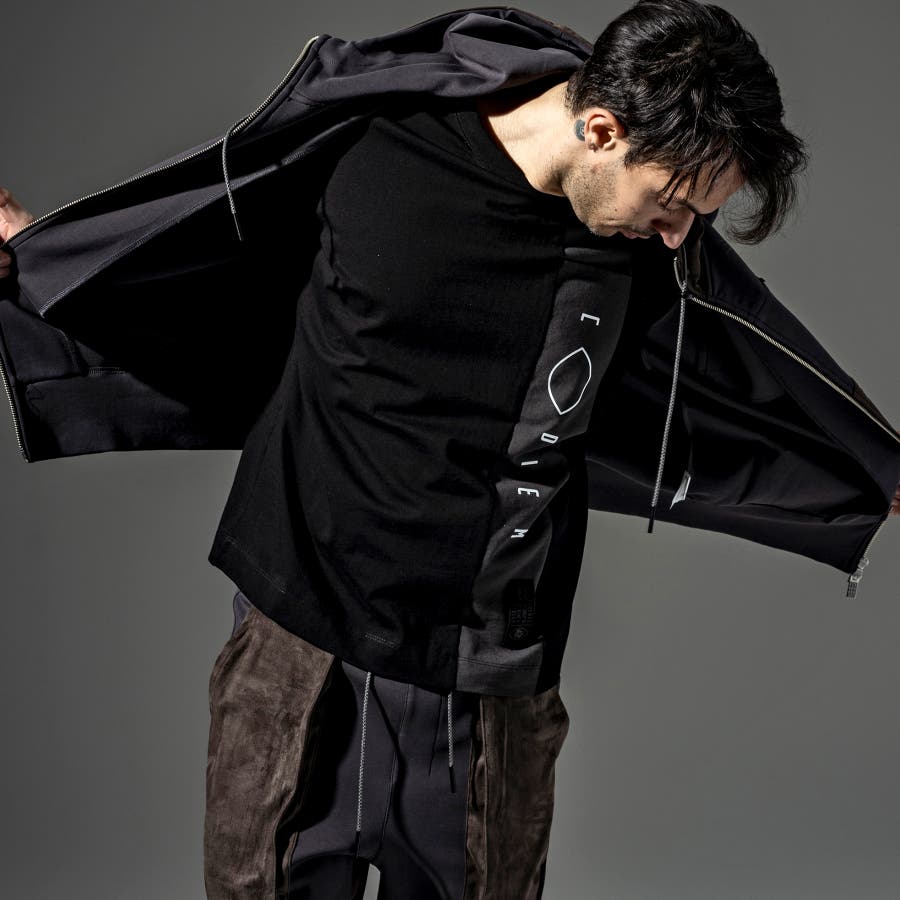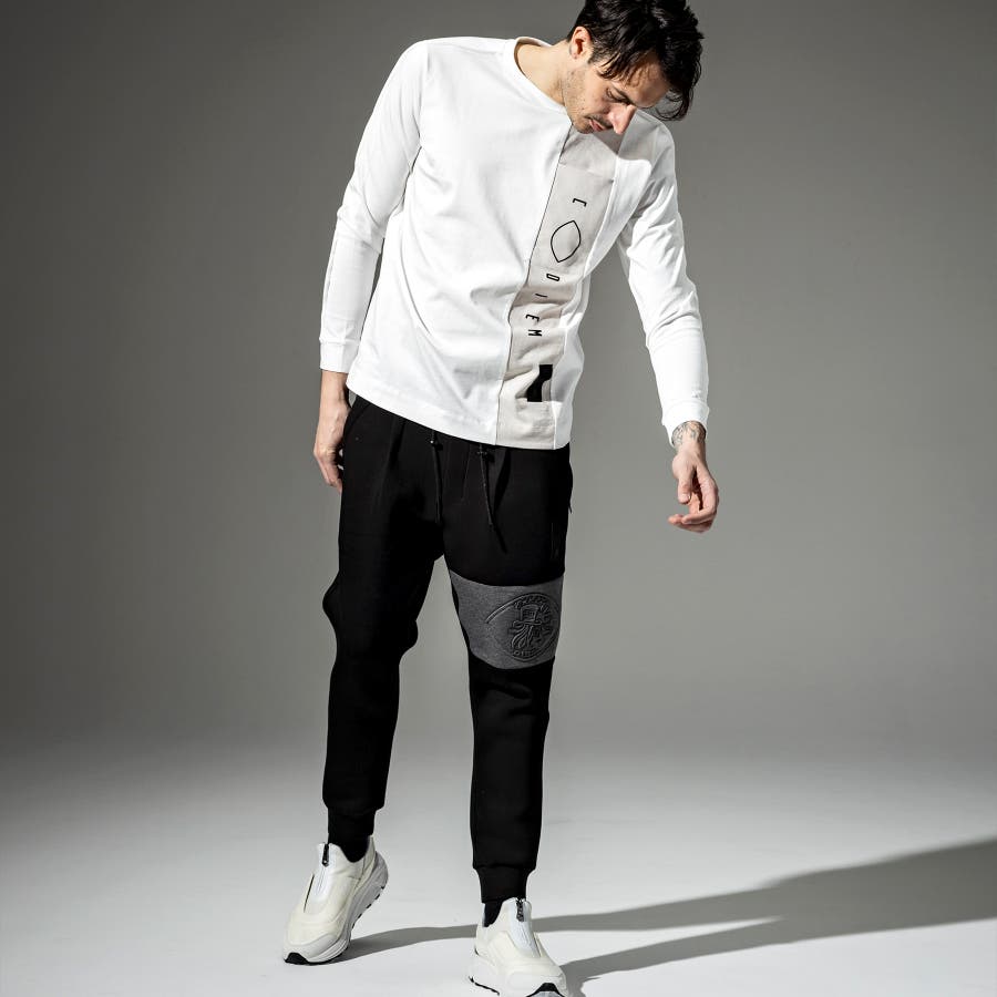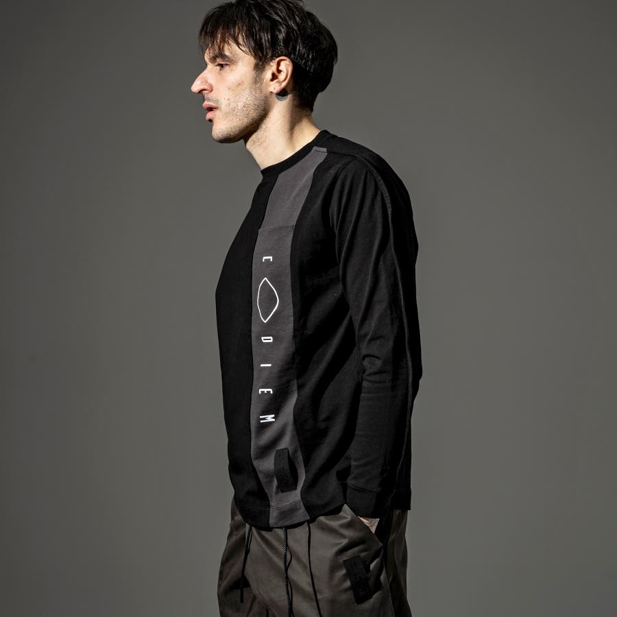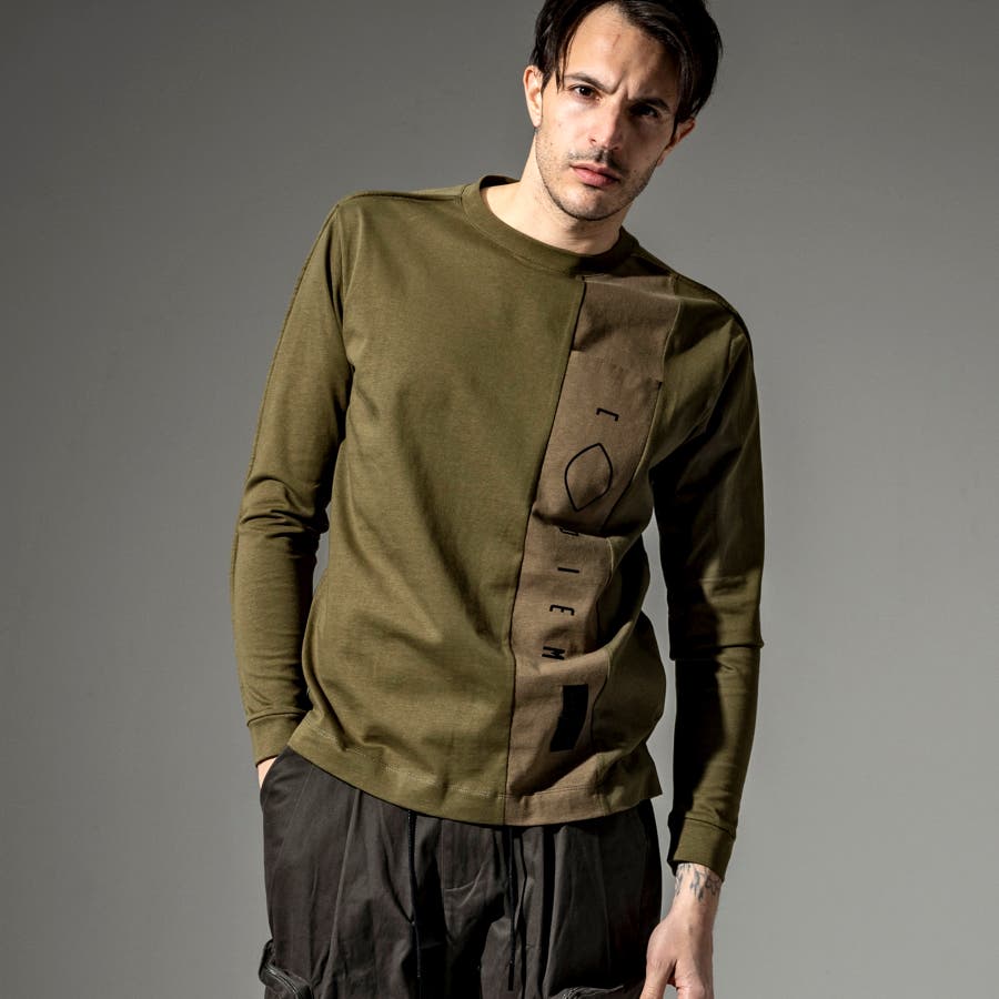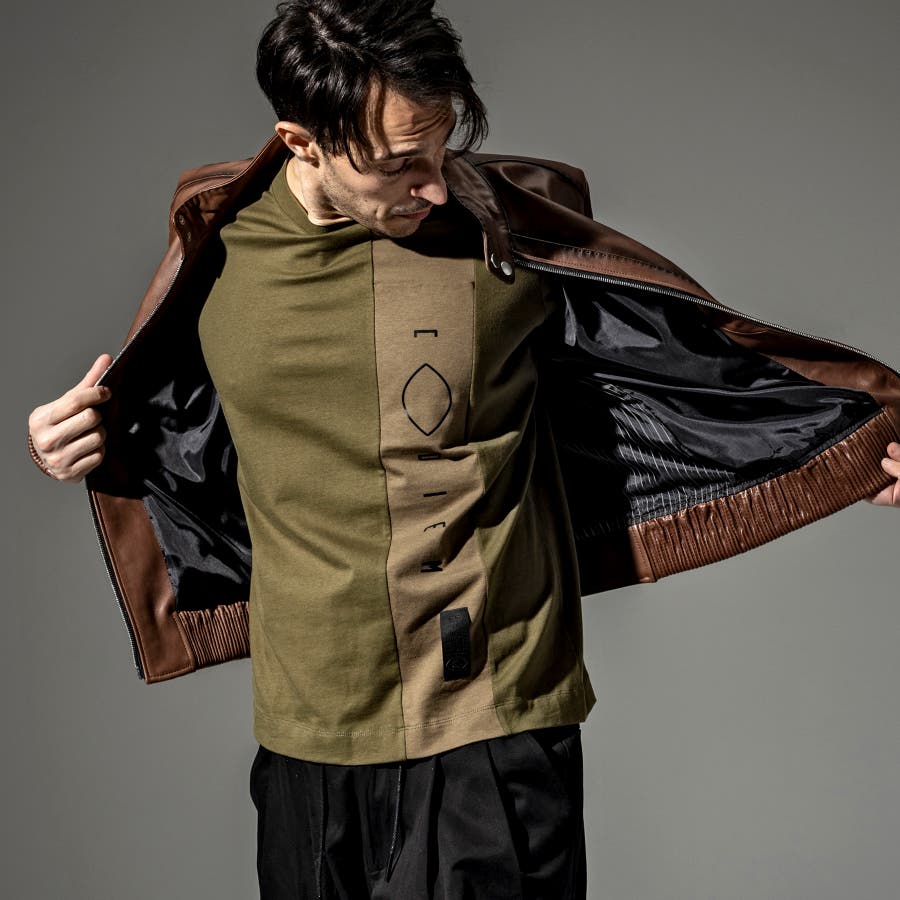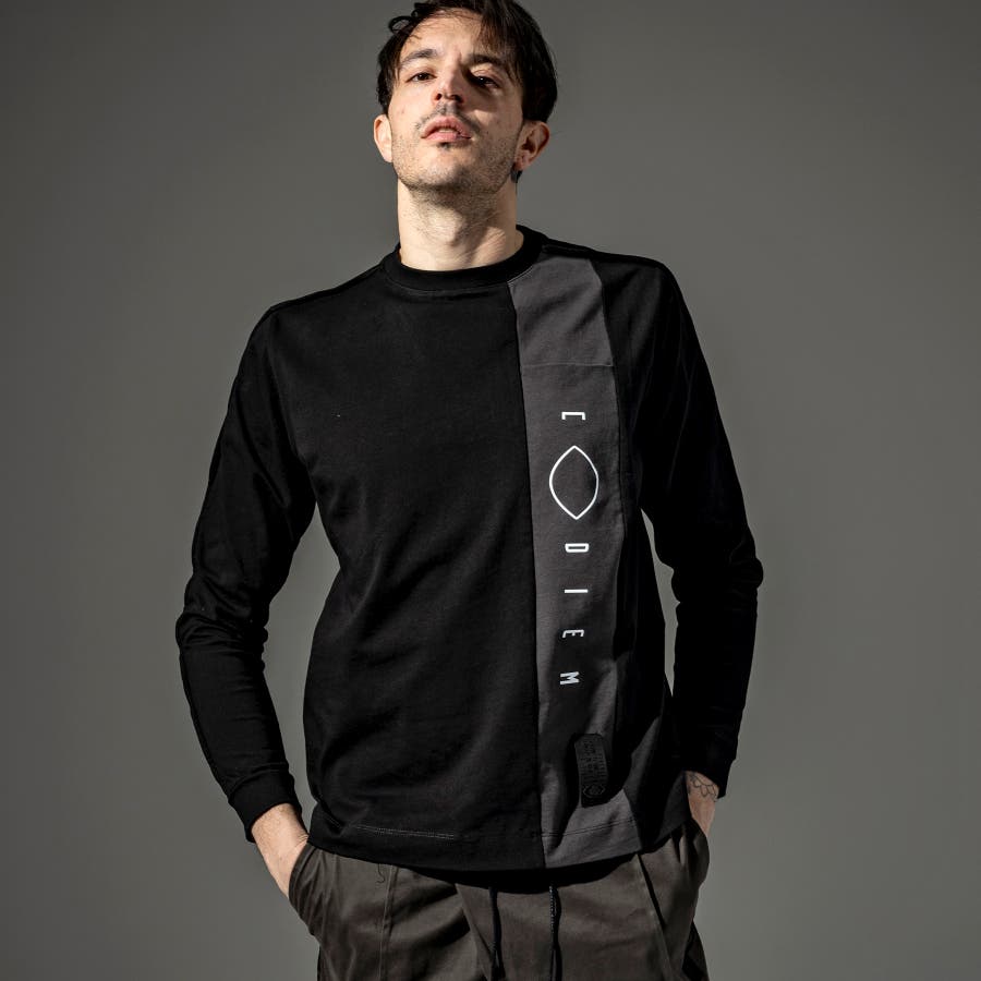 フロントにトーントーンで配色された生地で縦に切替がはいっており、そこにブランドロゴのプリントを立体プリントで配置。