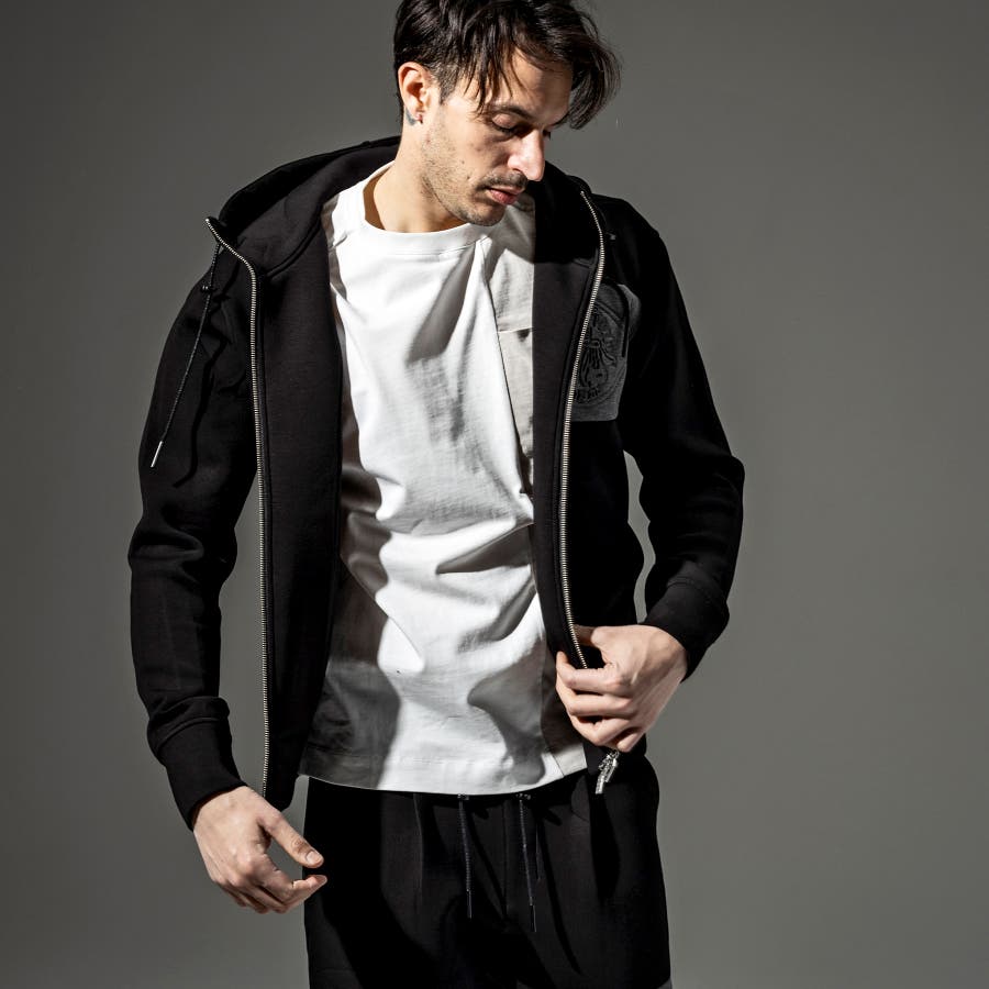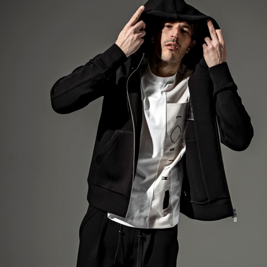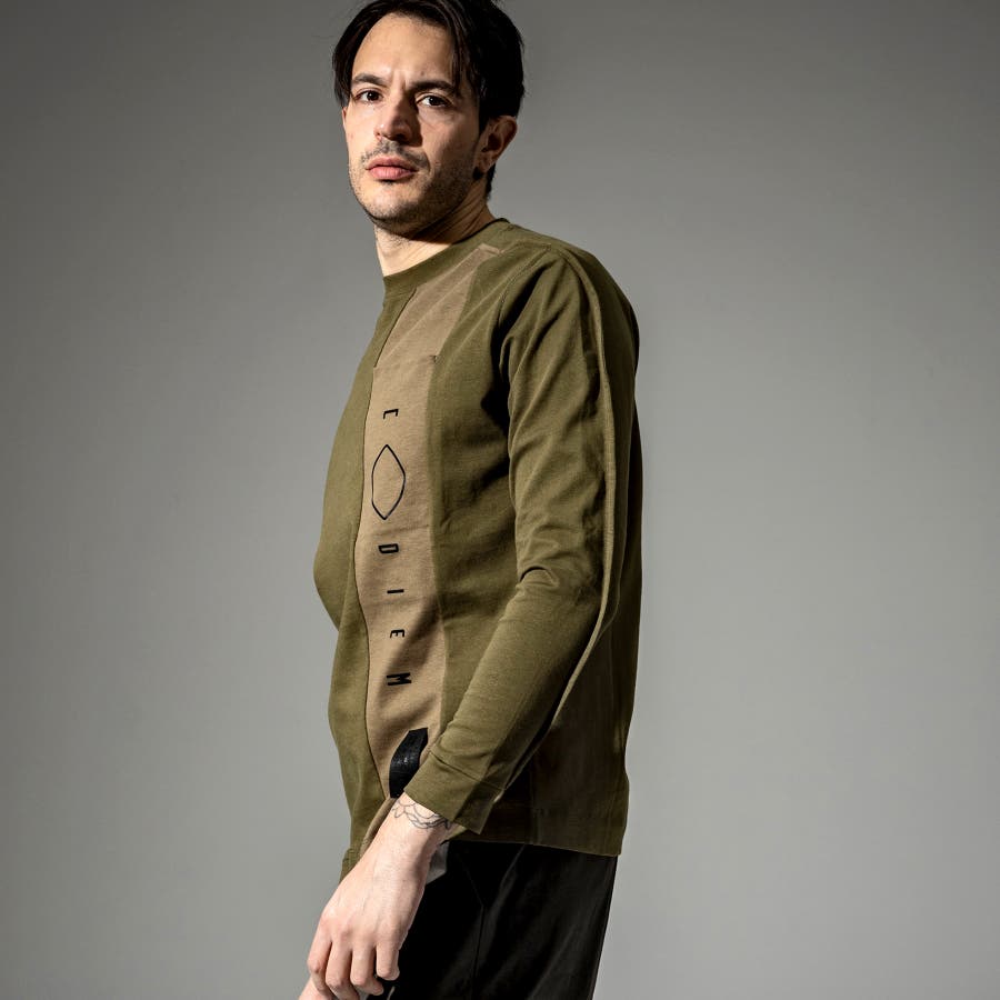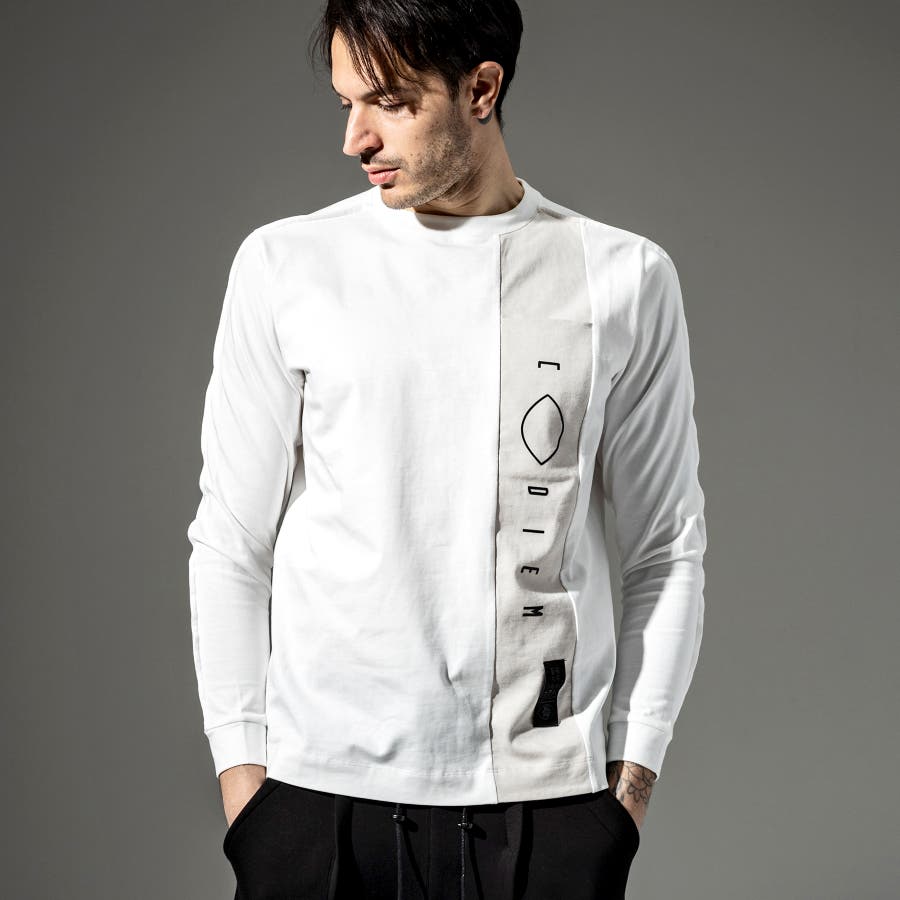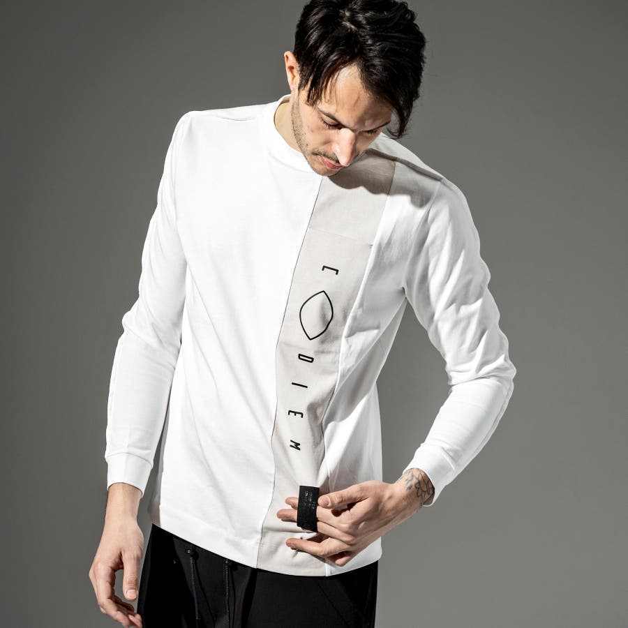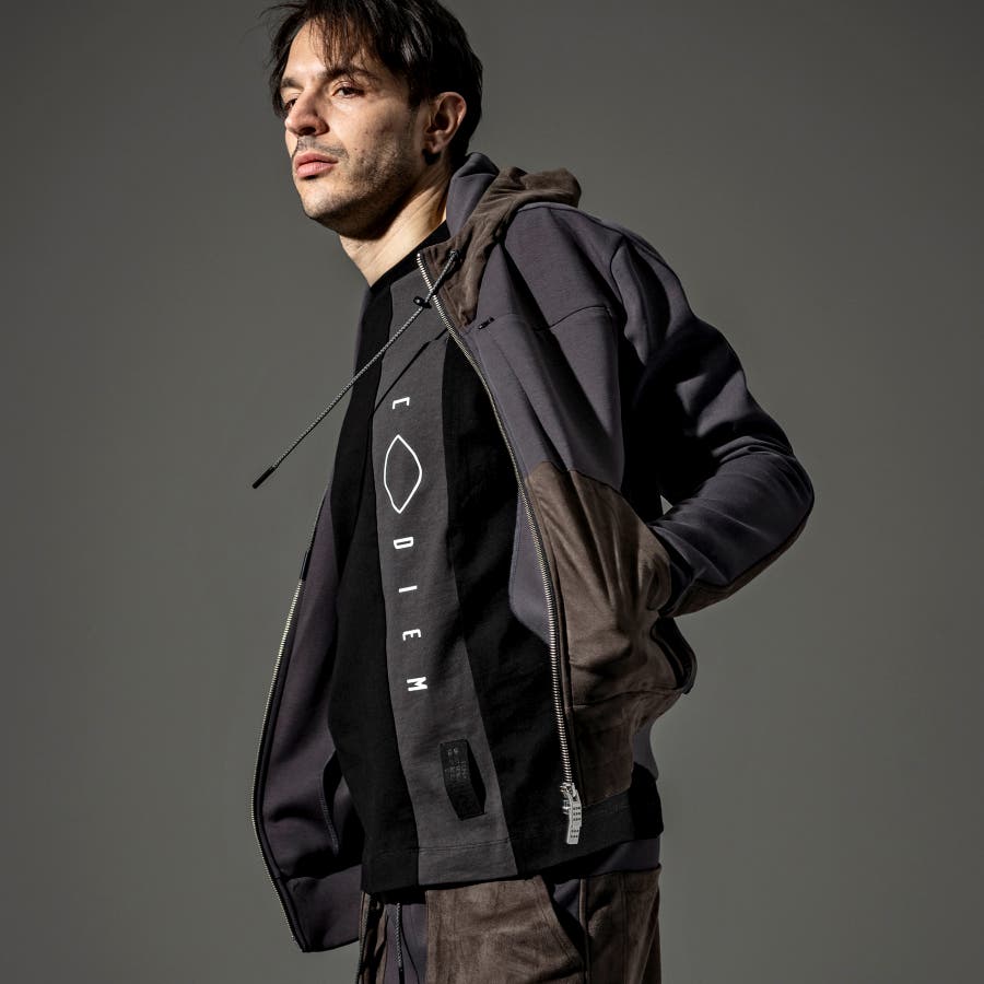 フロントにトーントーンで配色された生地で縦に切替がはいっており、そこにブランドロゴのプリントを立体プリントで配置。