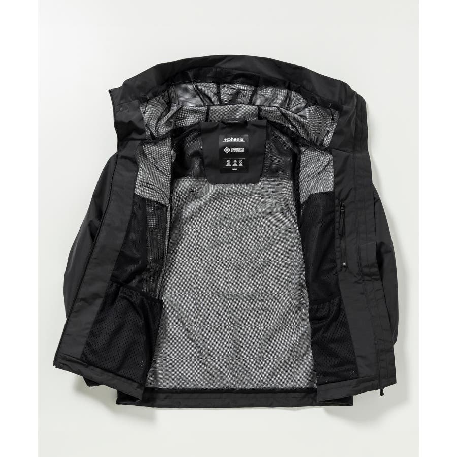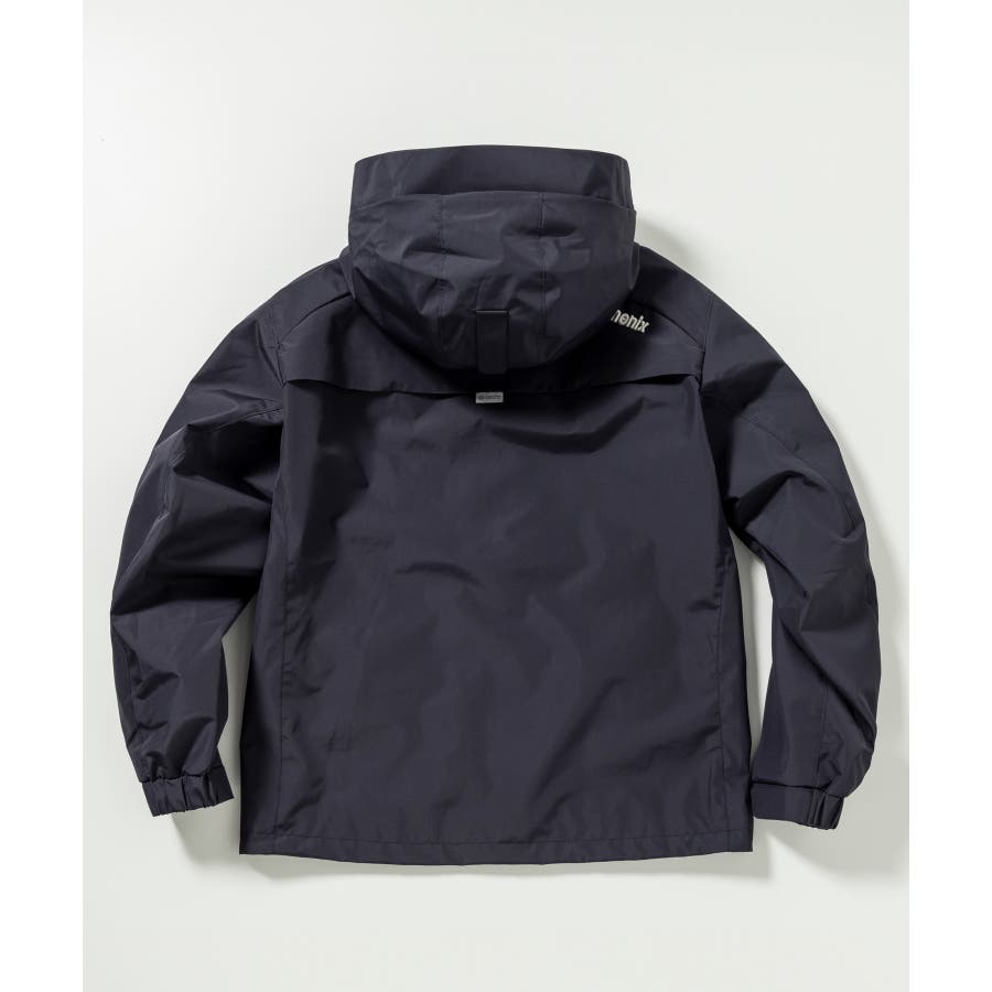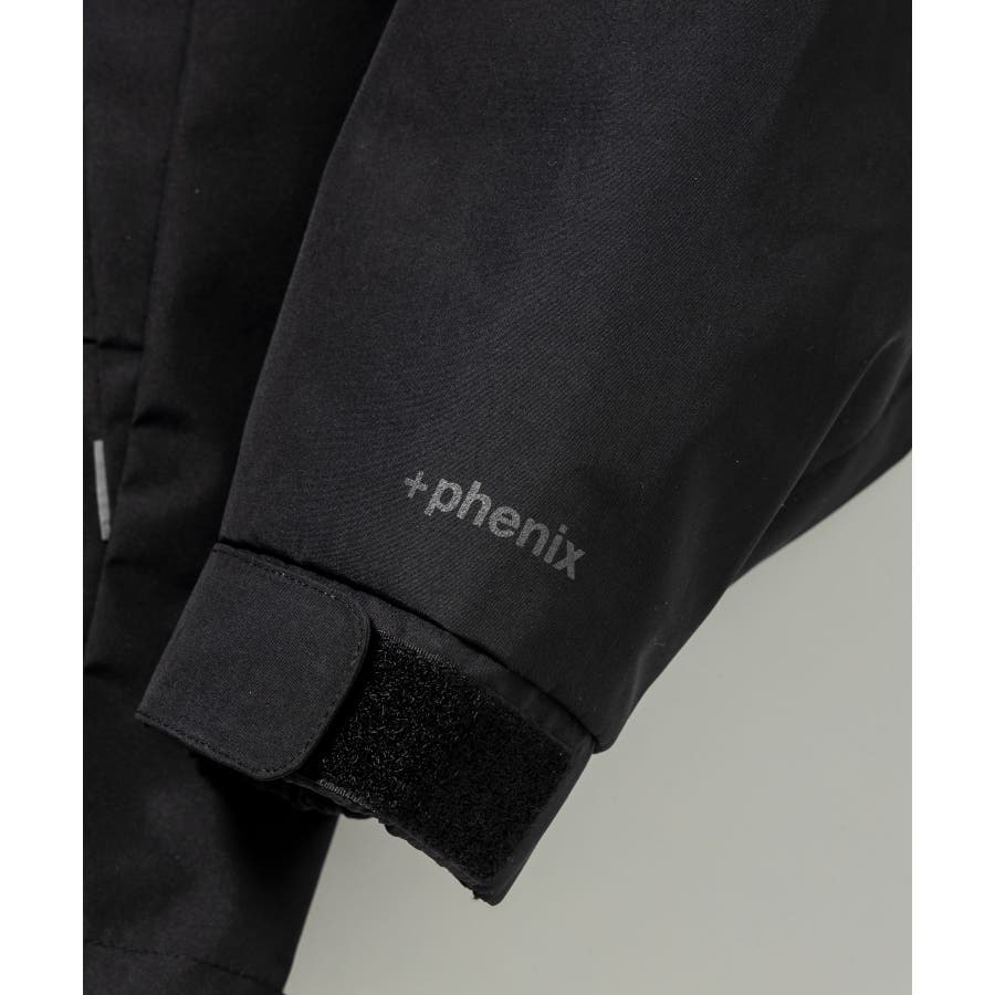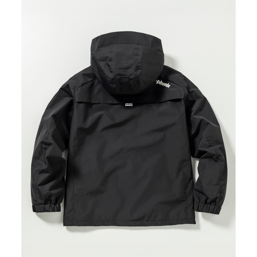 背中に施された「+phenix」の立体的な3D刺繍が印象的な、洗練されたデザインのマウンテンパーカー。