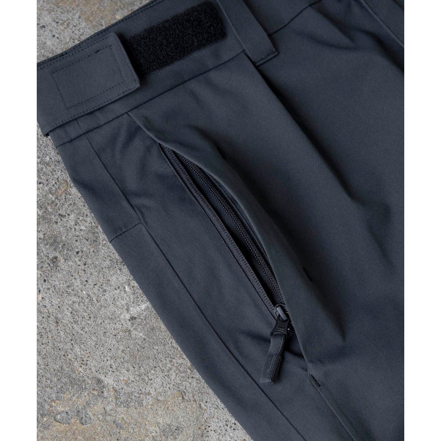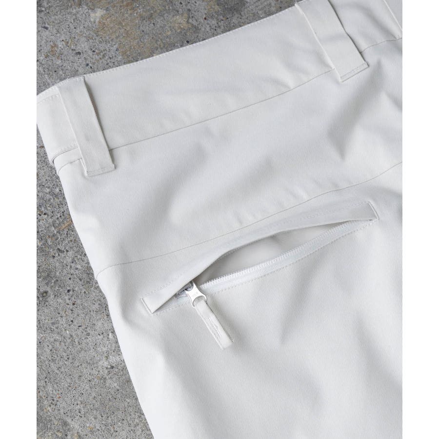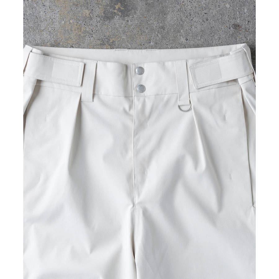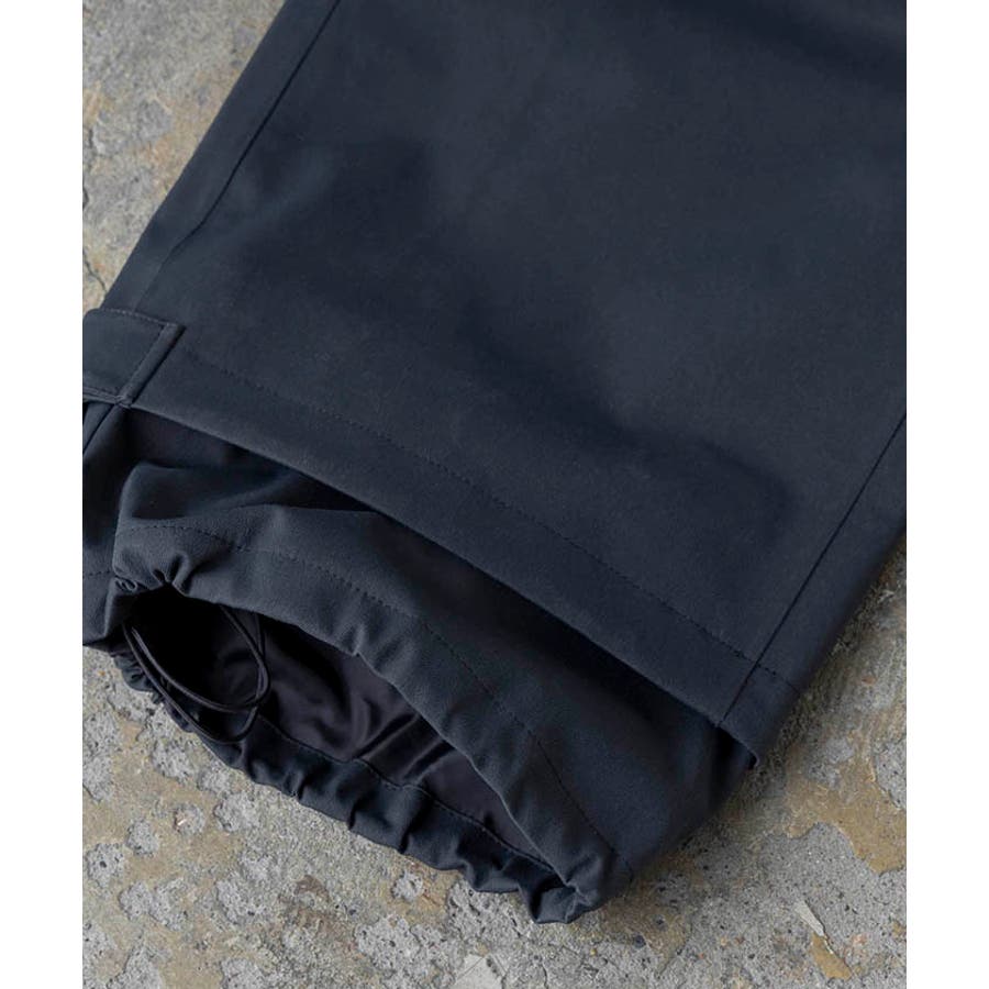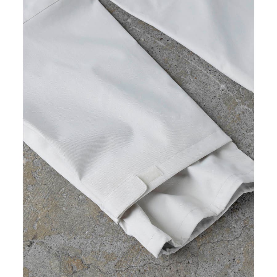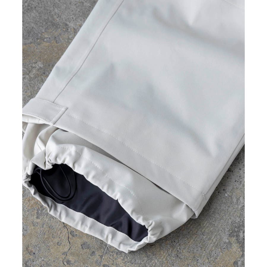 経糸に150Dのポリエステル加工糸、横糸に21番手のポリエステルスパンを交織することでコットンのような風合いを実現し、綾織りよりも畝の目立つカルゼ組織にすることでスキーウェアながらもデイリーユースとして使える綺麗目な仕上がりになっています。