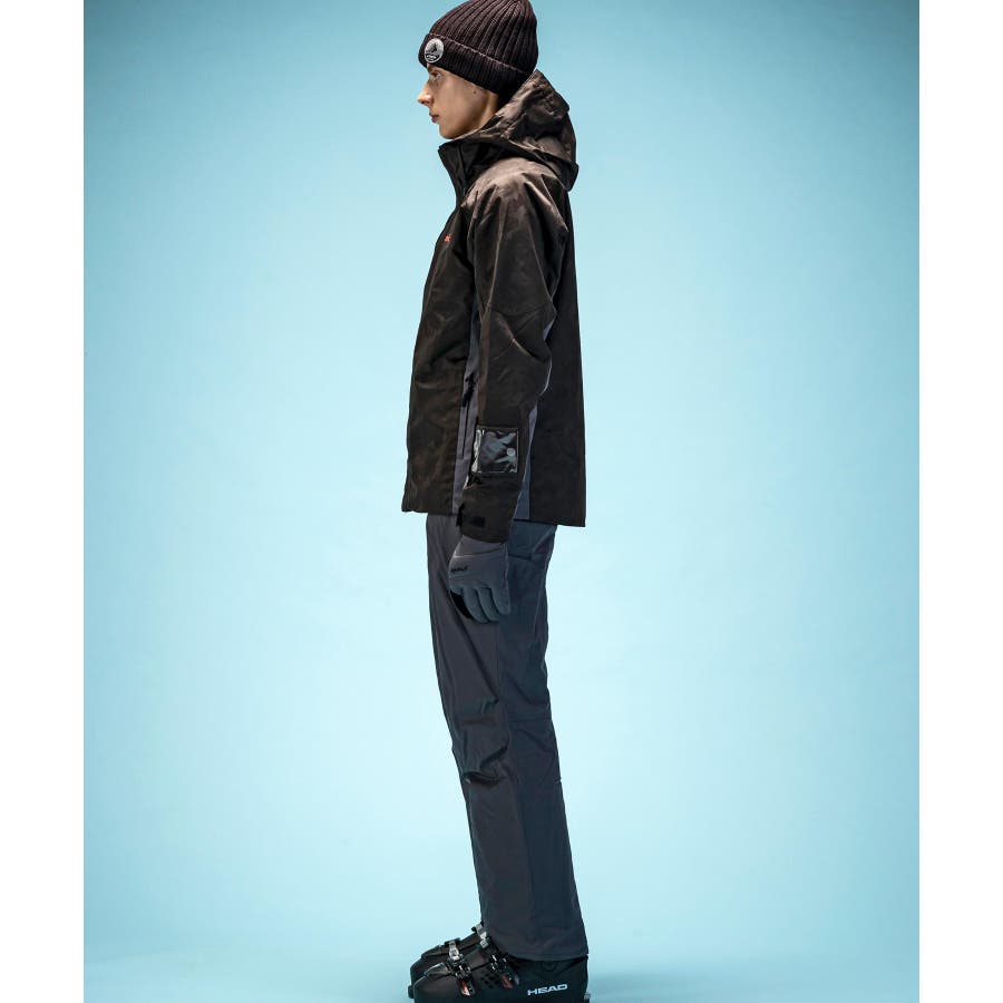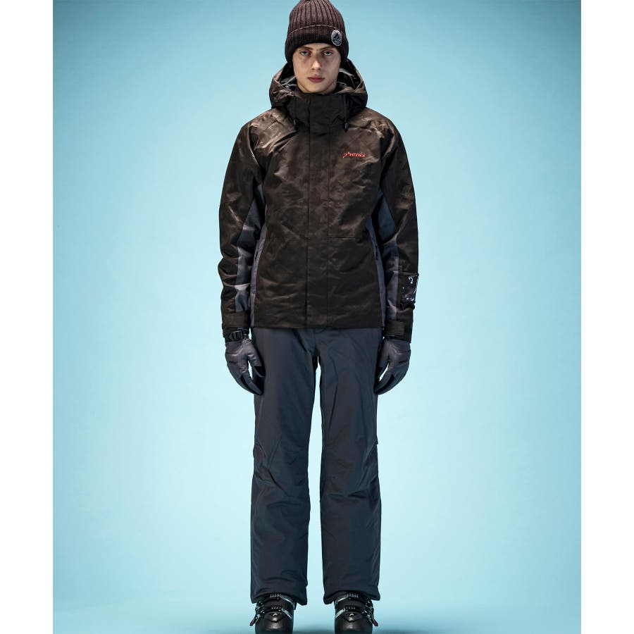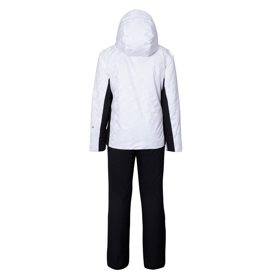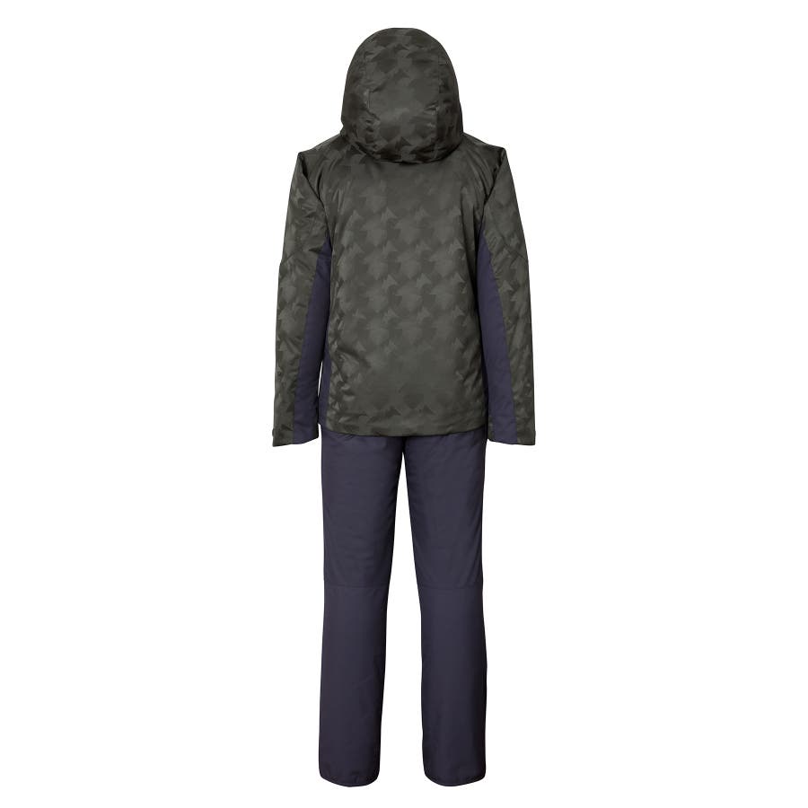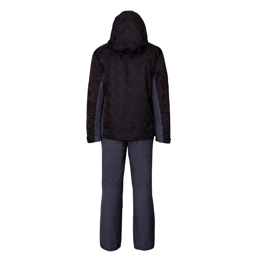 ジオメトリージャカード柄の2ピースウェアー。耐水圧10000mmの2WAYストレッチ生地を使用。取り外し可能なサスペンダーやウエスト脇のサイズ調整アジャスター付き。