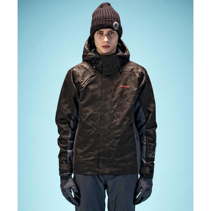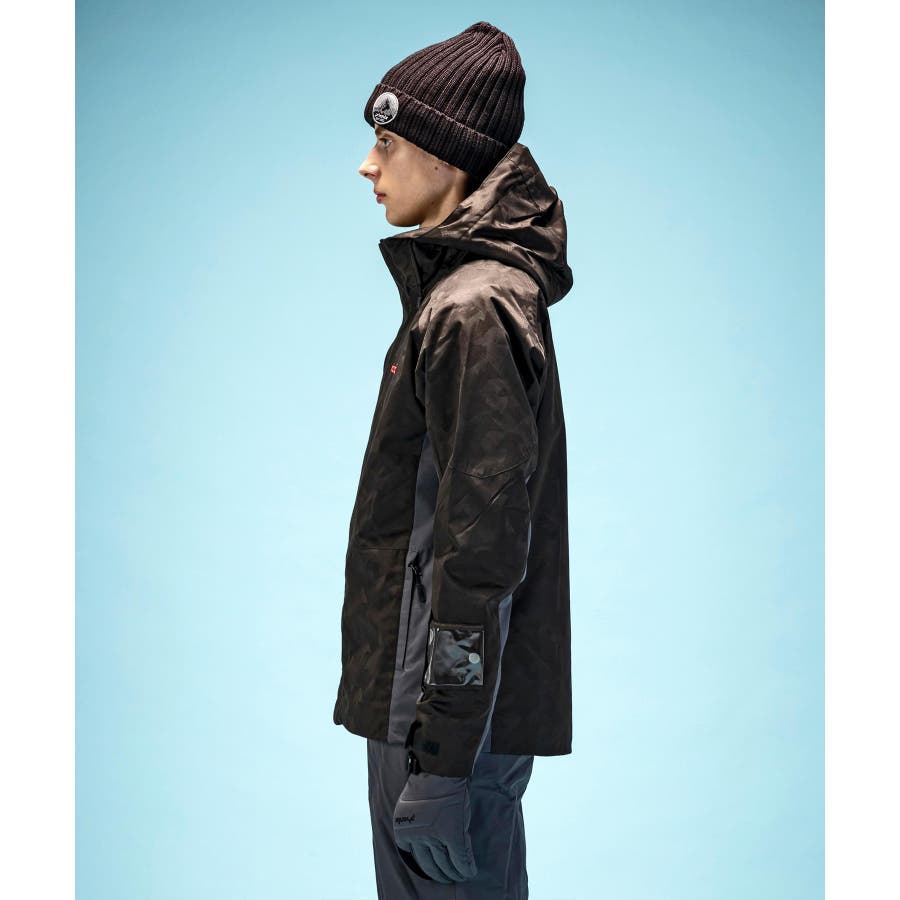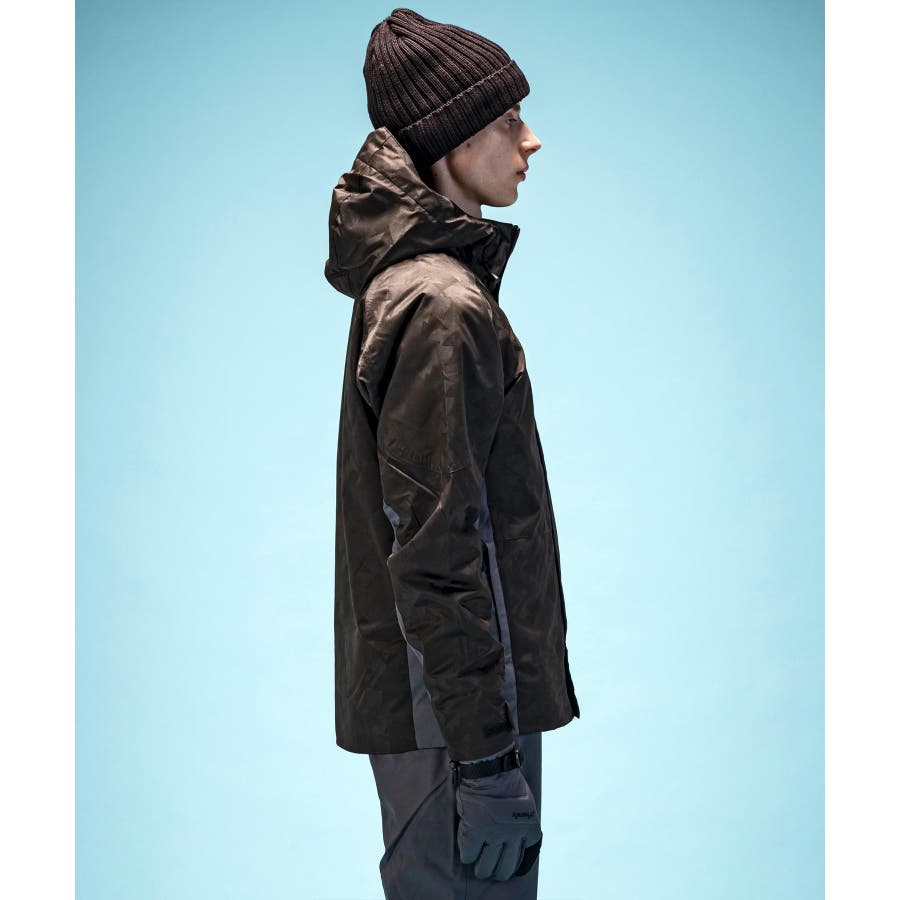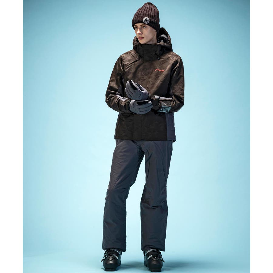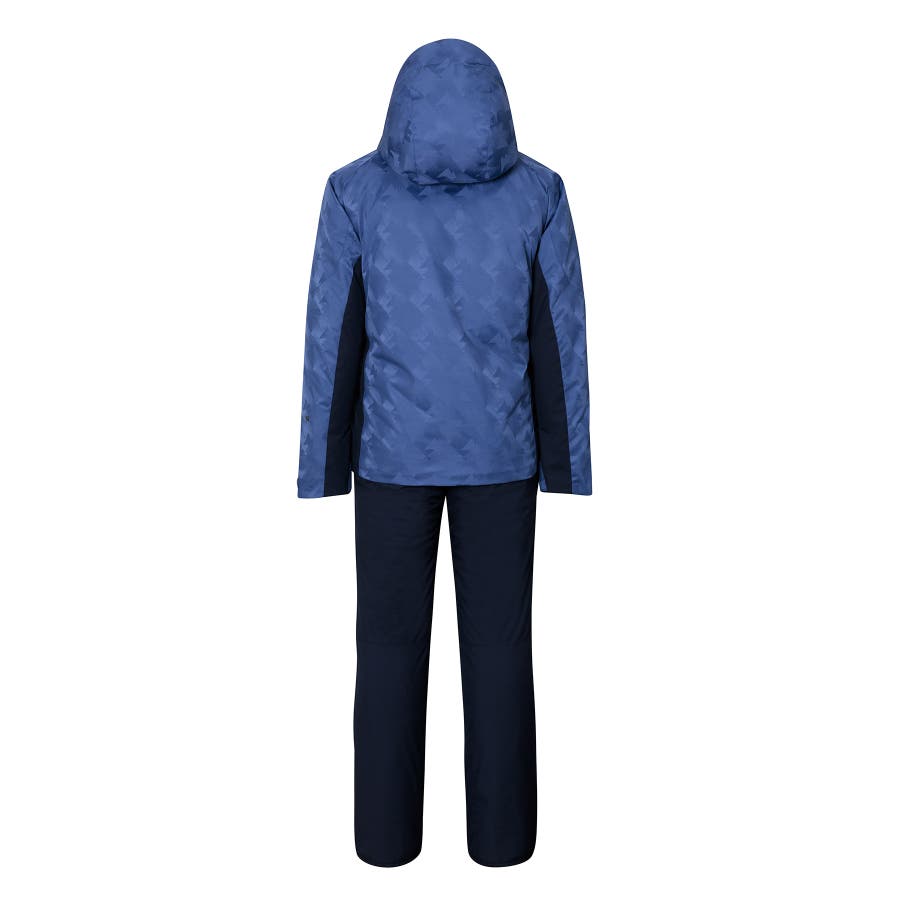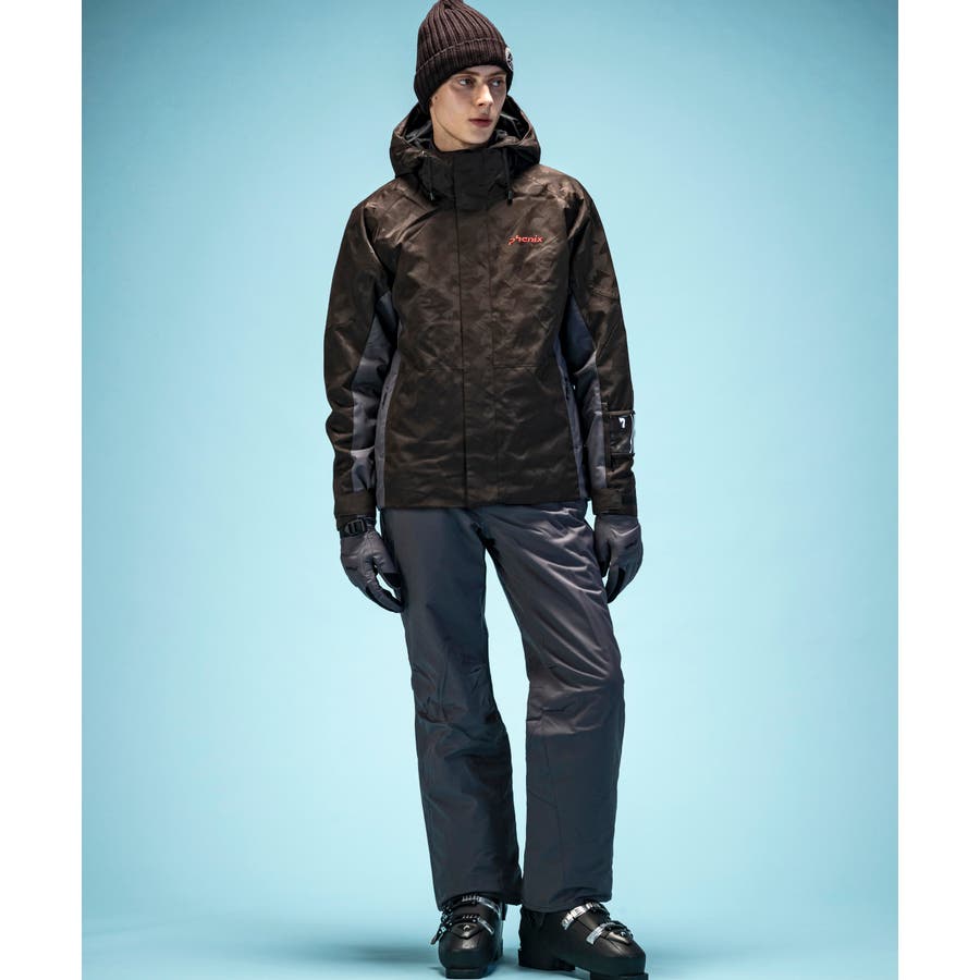ジオメトリージャカード柄の2ピースウェアー。耐水圧10000mmの2WAYストレッチ生地を使用。取り外し可能なサスペンダーやウエスト脇のサイズ調整アジャスター付き。