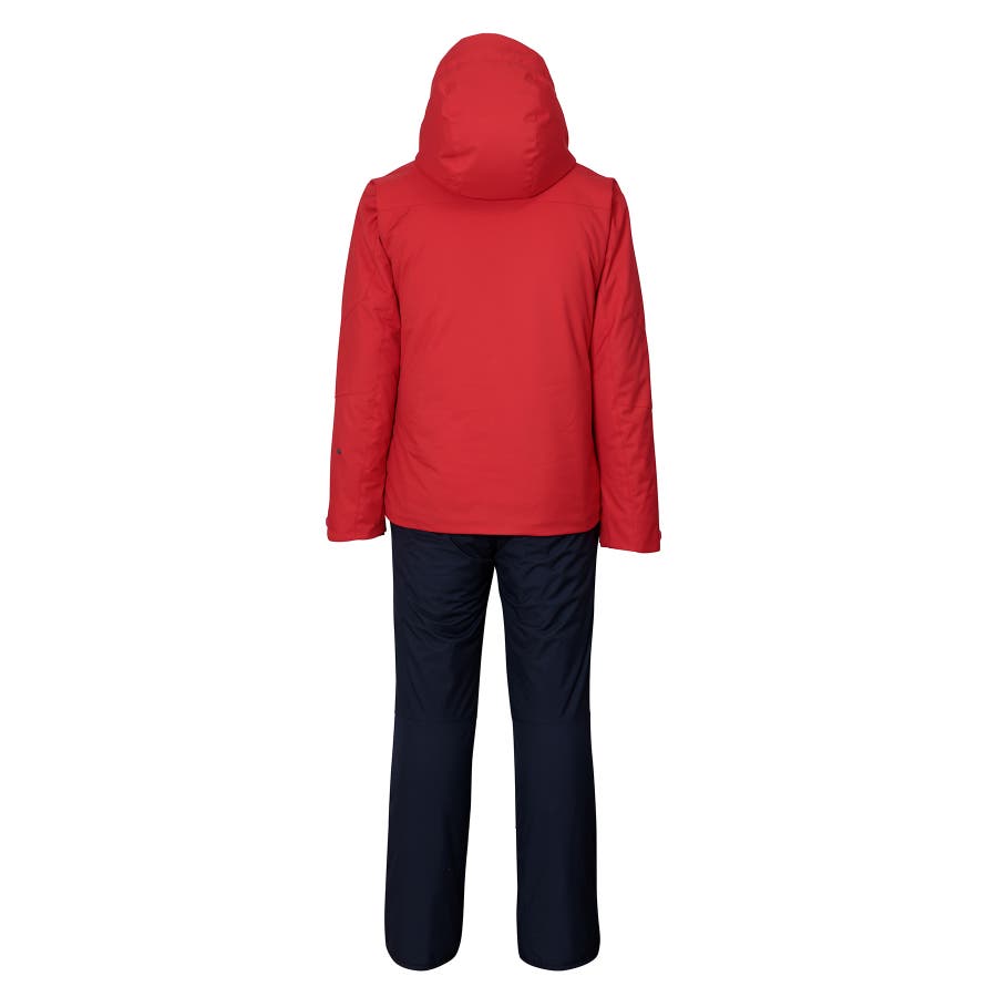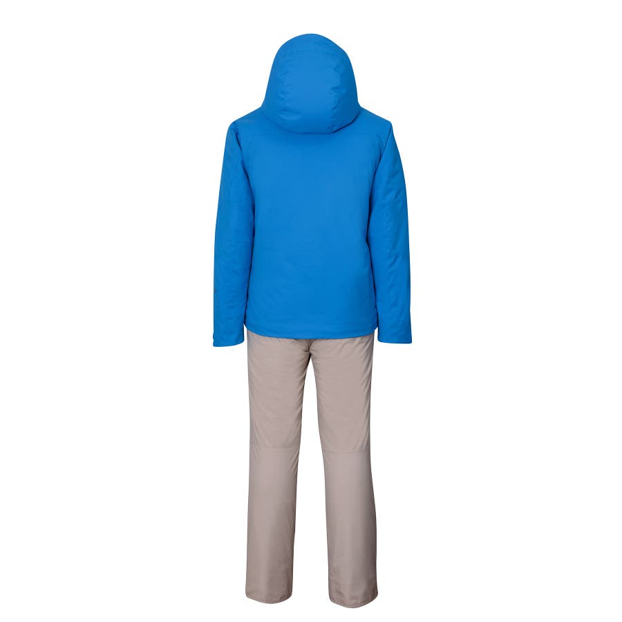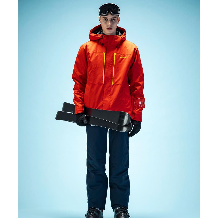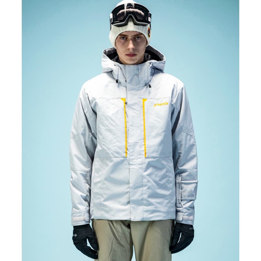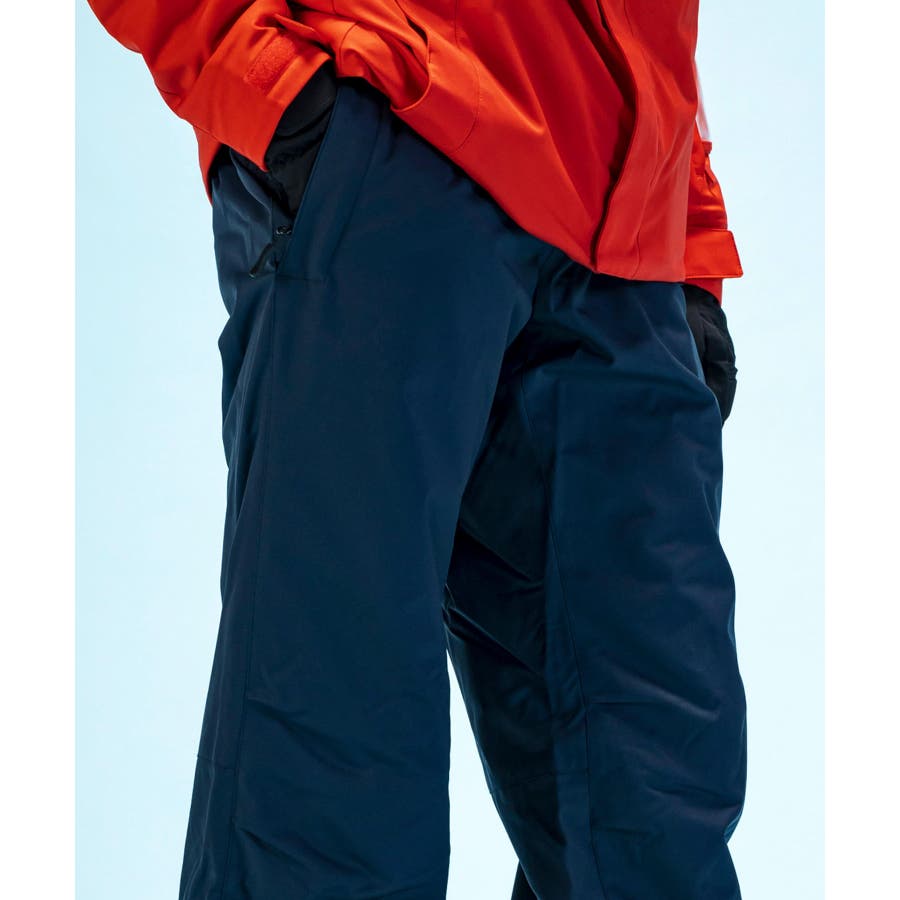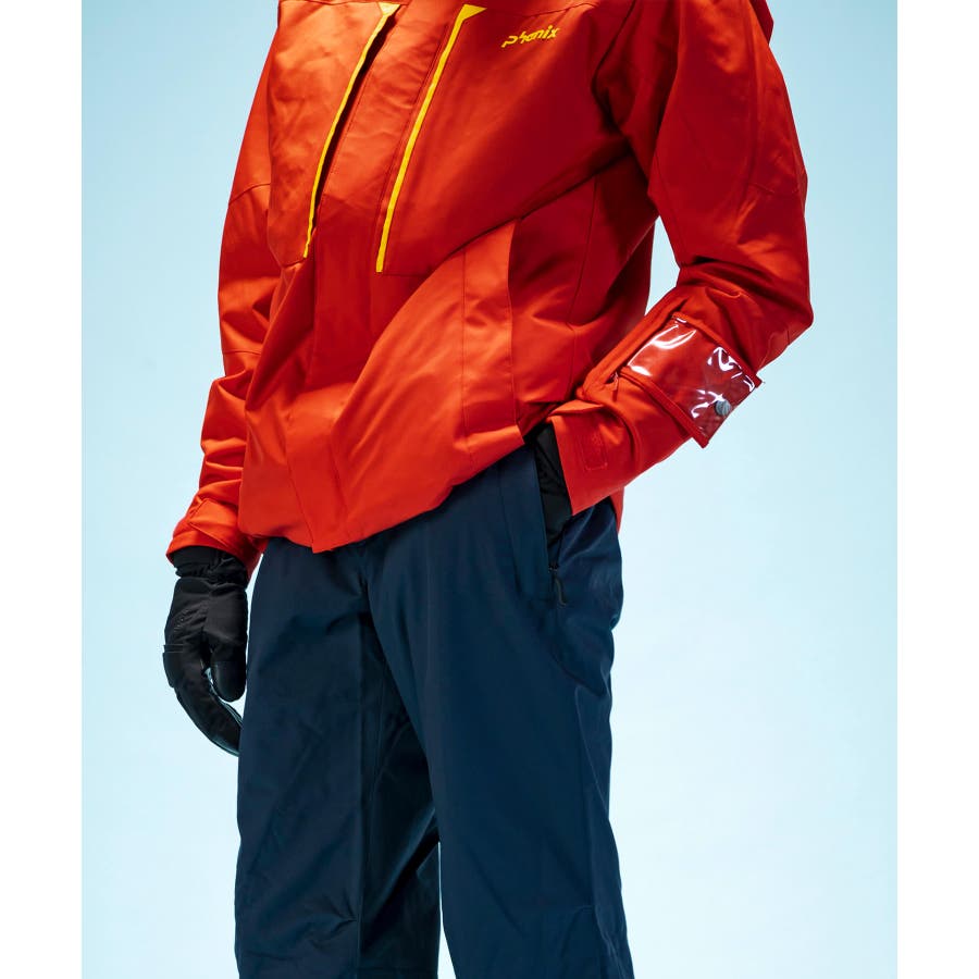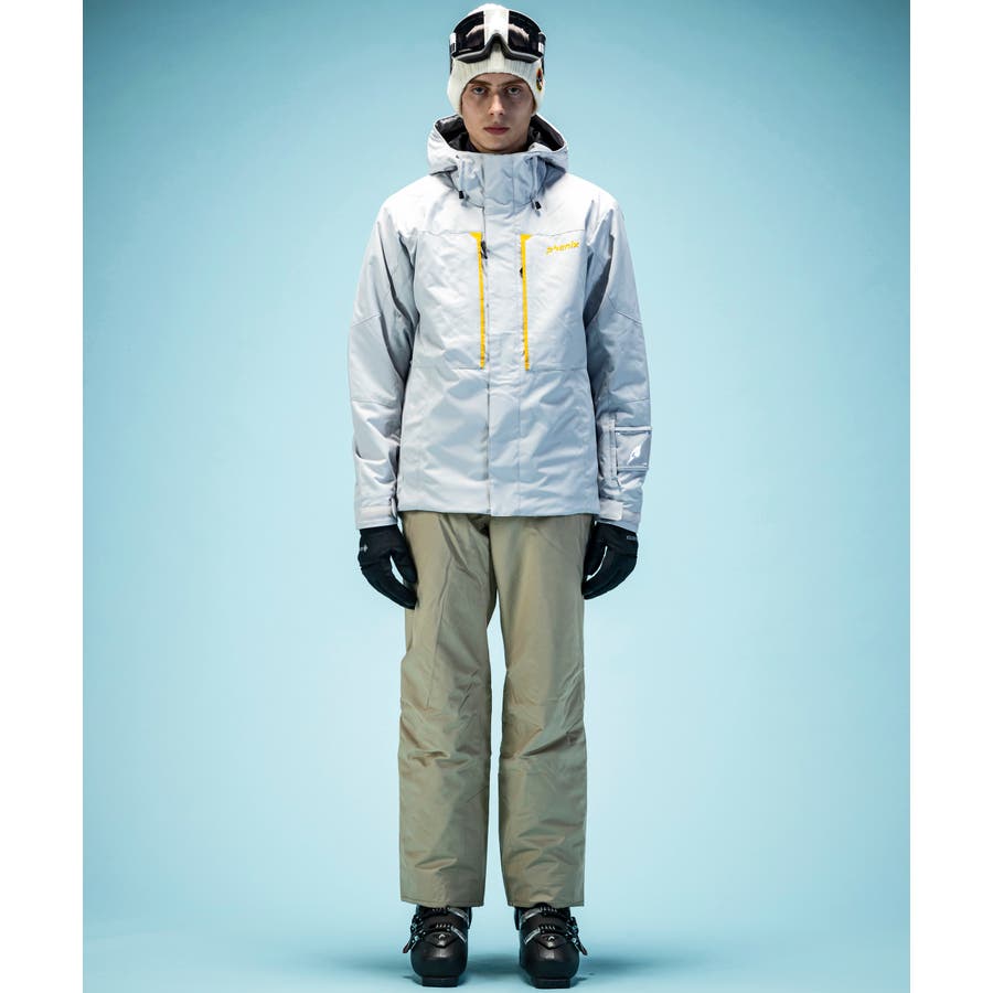 配色ラインが特徴の2ピースウェアー。両胸にポケット付き。耐水圧10000mmの2WAYストレッチ生地を使用。取り外し可能なサスペンダーやウエスト脇のサイズ調整アジャスター付き。