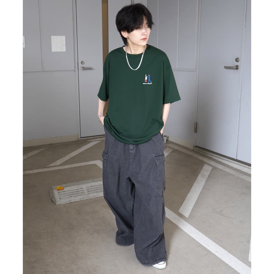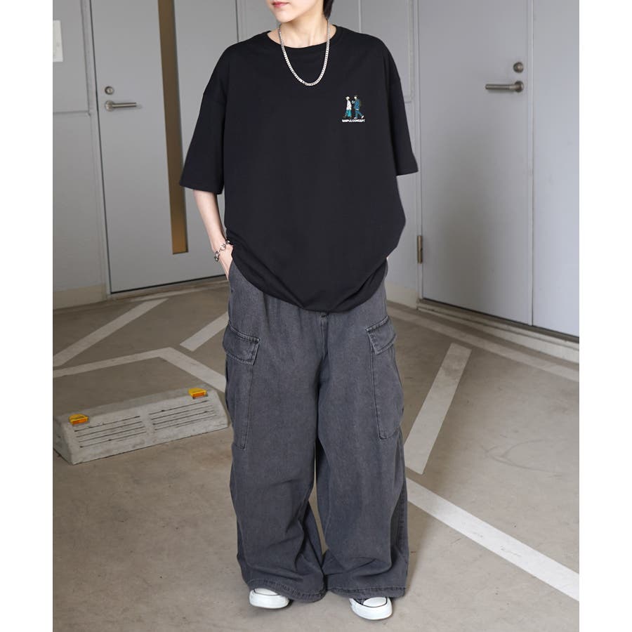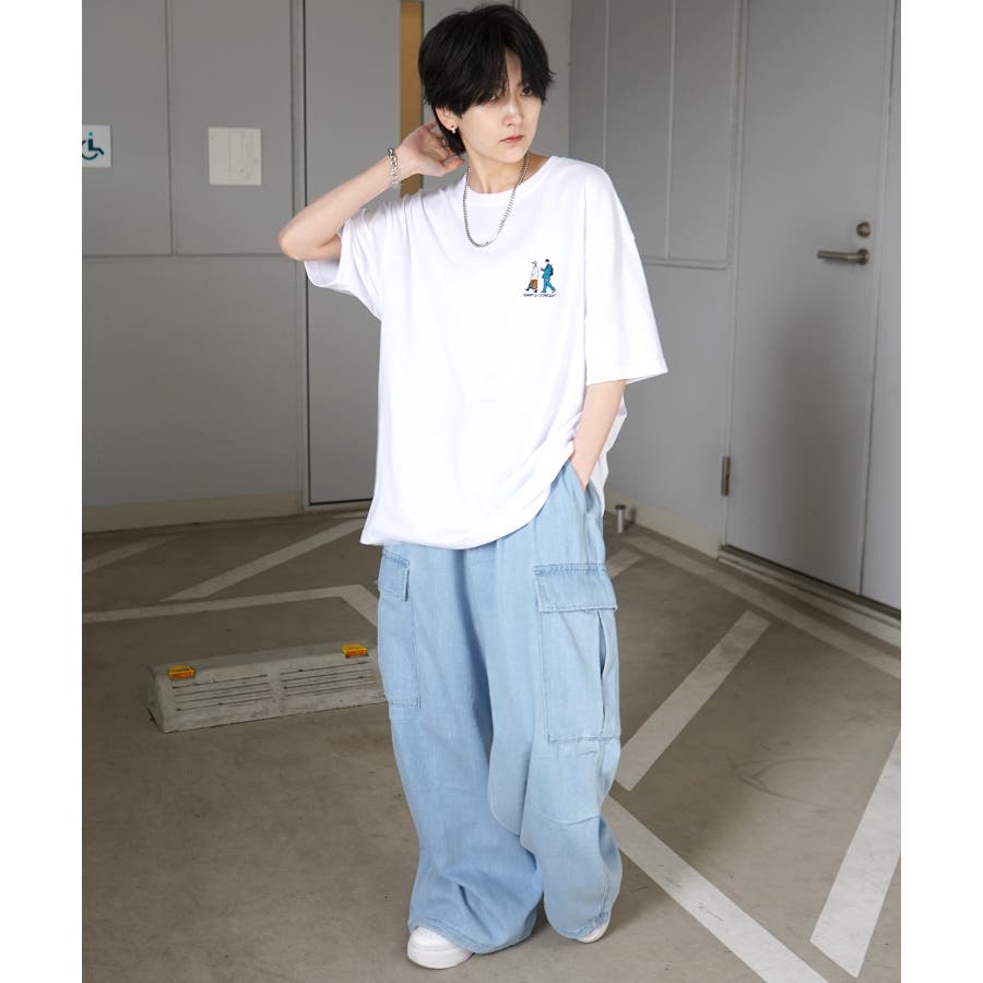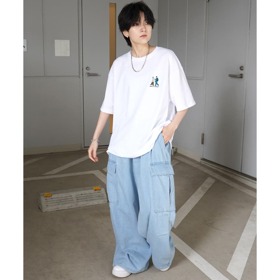 ワイドデニムパンツやパラシュートパンツ、カーゴパンツ、スウェットパンツ、ショートパンツを合わせたカジュアルなストリートスタイル。