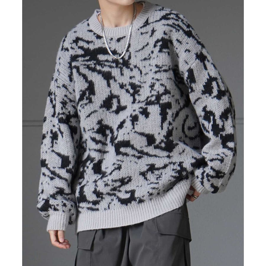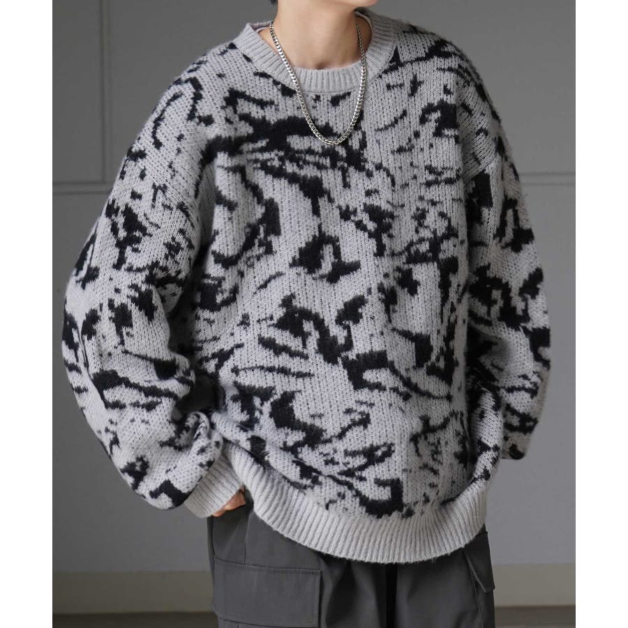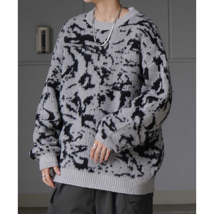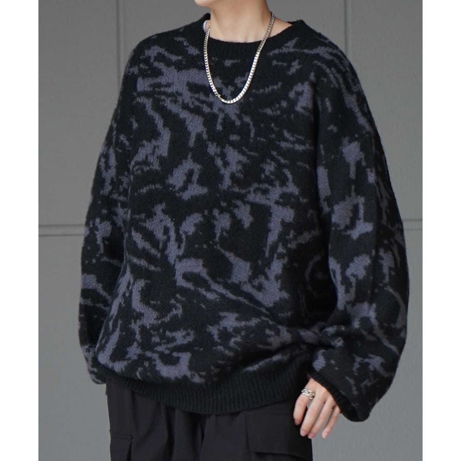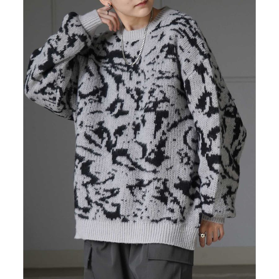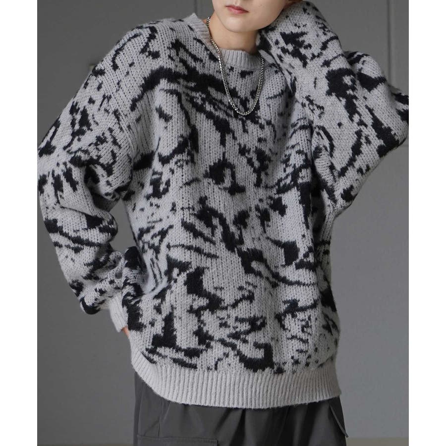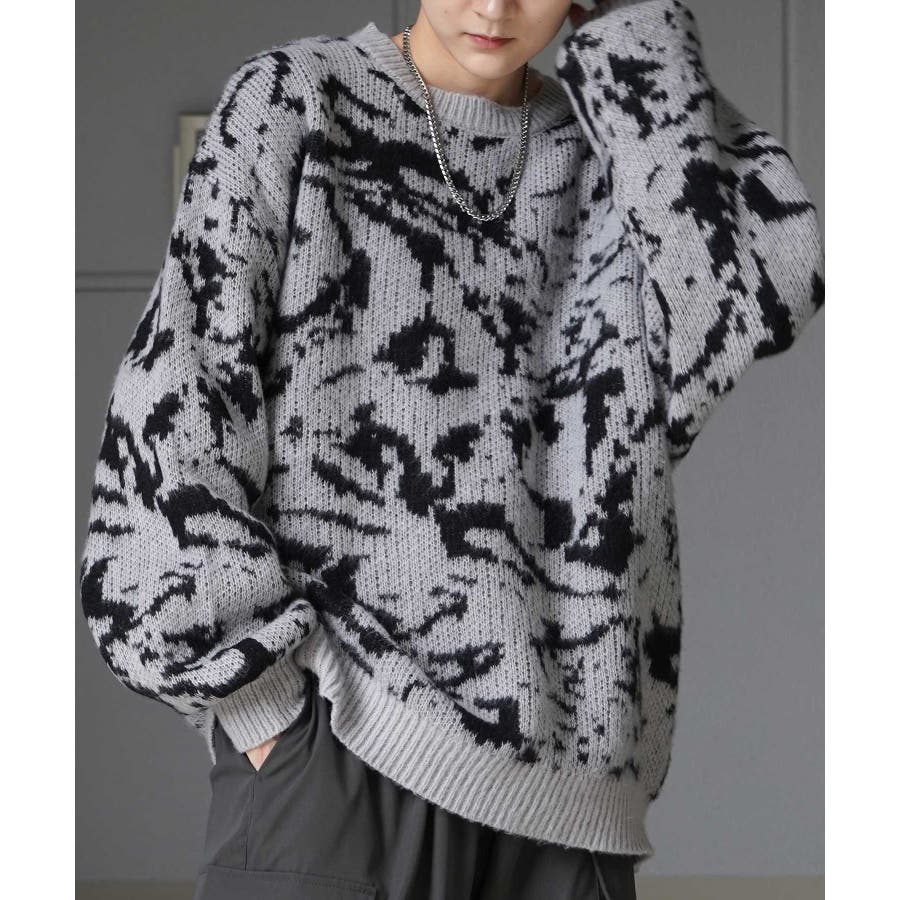 1枚切るだけでさまになる総柄クルーネックプルオーバーニット。