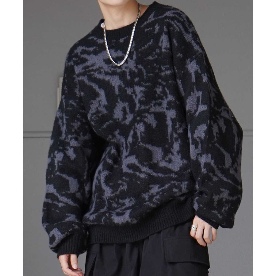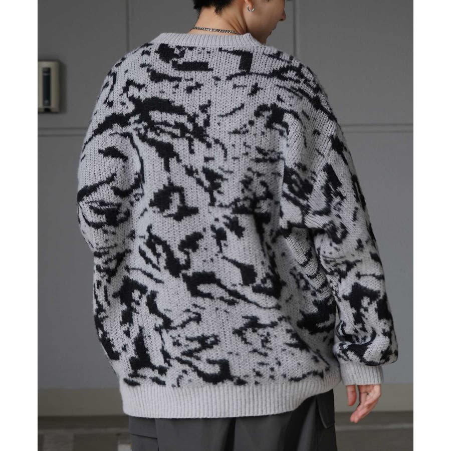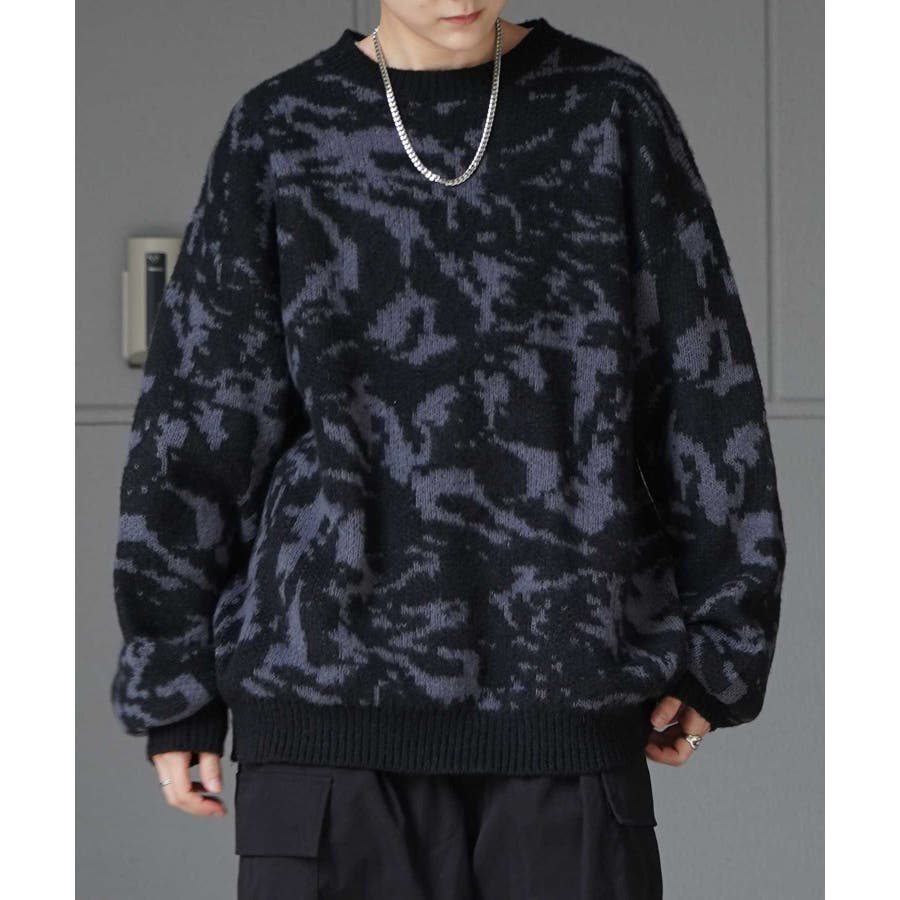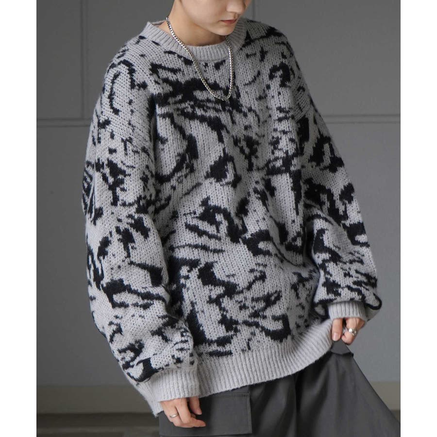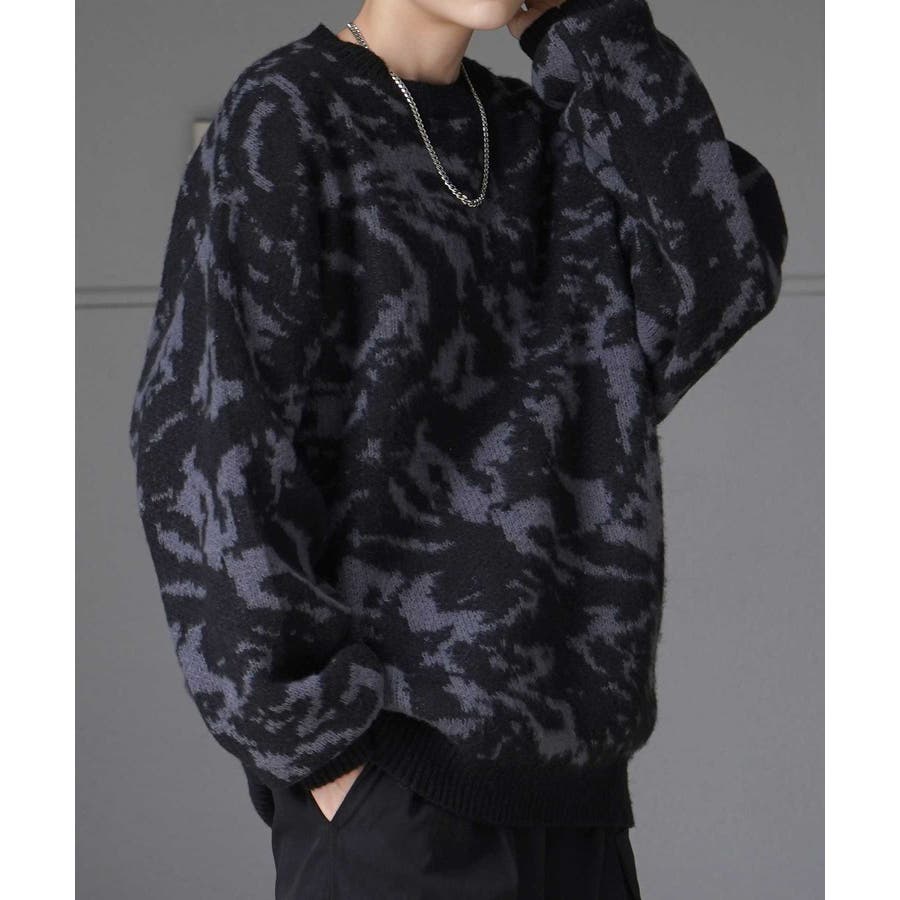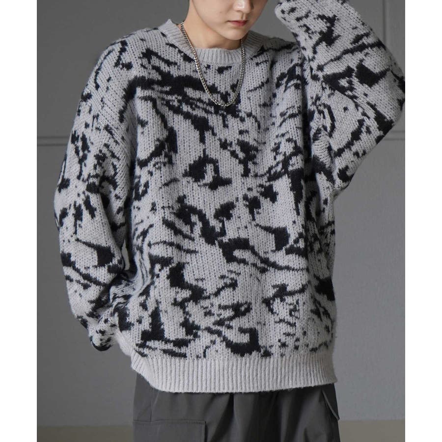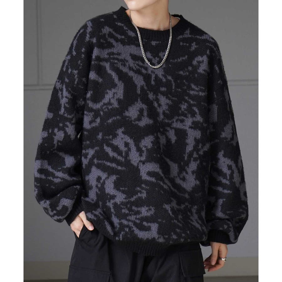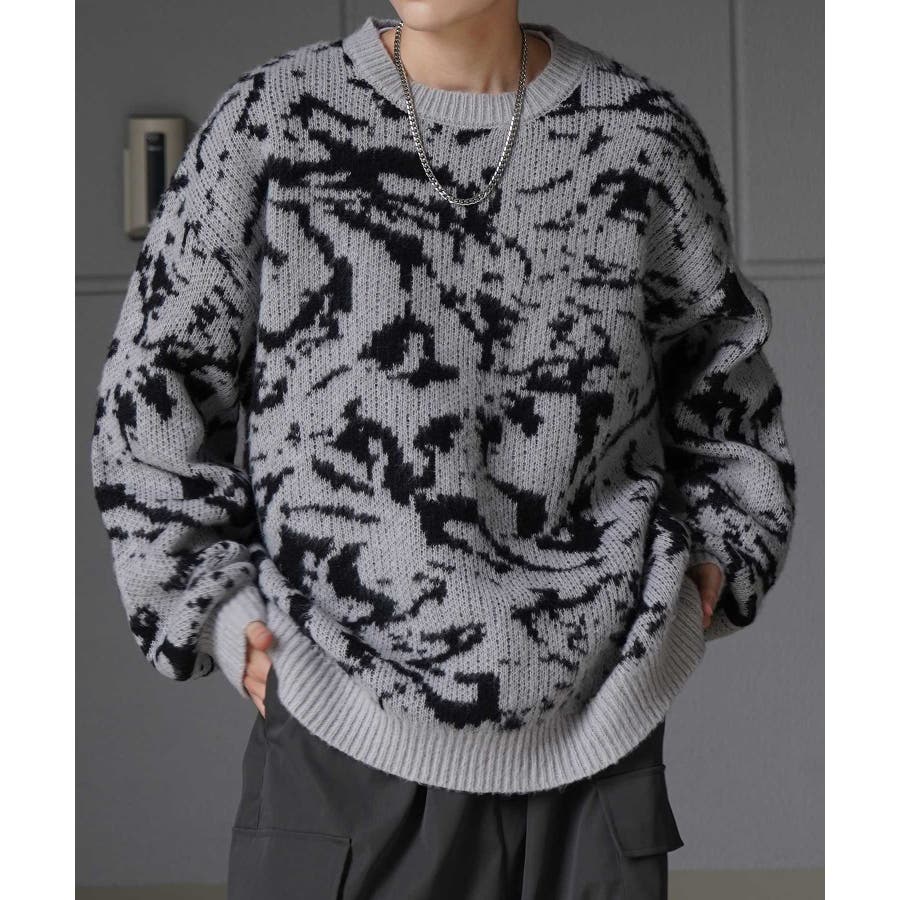 1枚切るだけでさまになる総柄クルーネックプルオーバーニット。