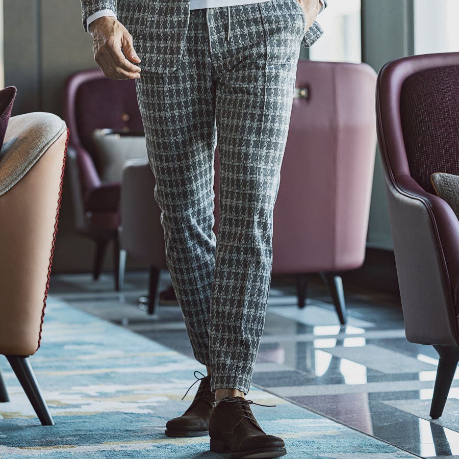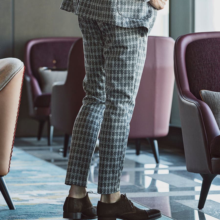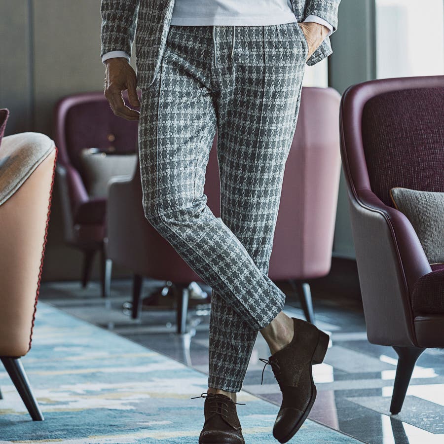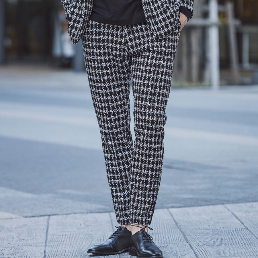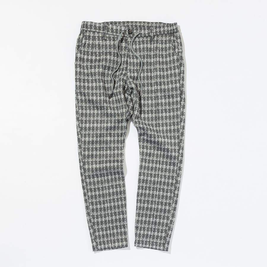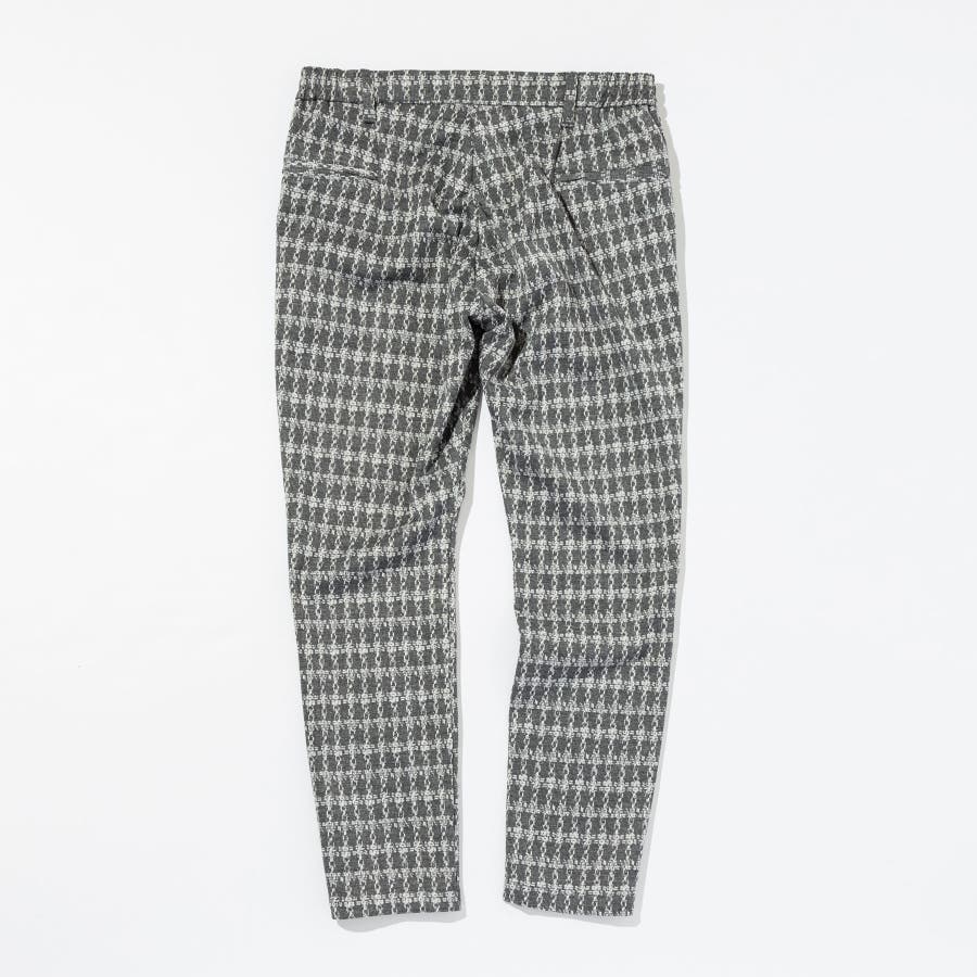 かっちりしたフォーマルなデザインに見せつつウエストはドローコードで調節可能。また、リラックスラインならではのストレッチの利いたジャガード素材で着心地は抜群。ふくらはぎは少しだけ膨らませつつシルエットを細く見せるオリジナルパターンワーク。