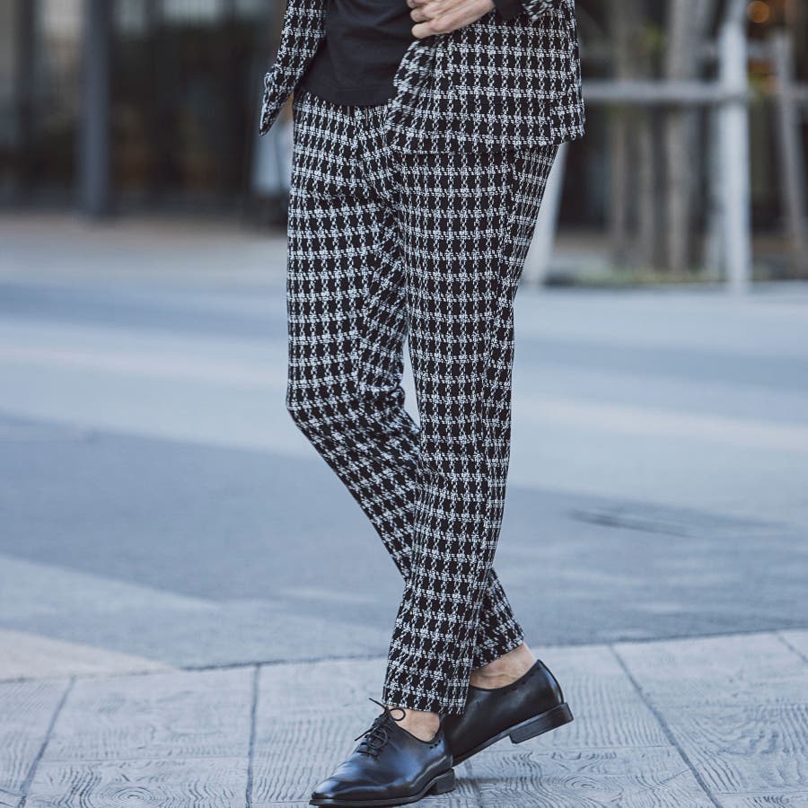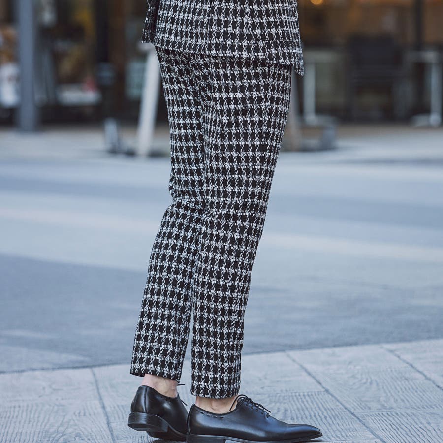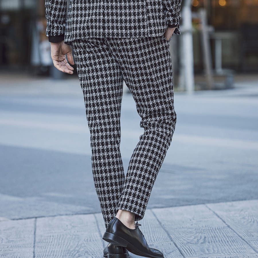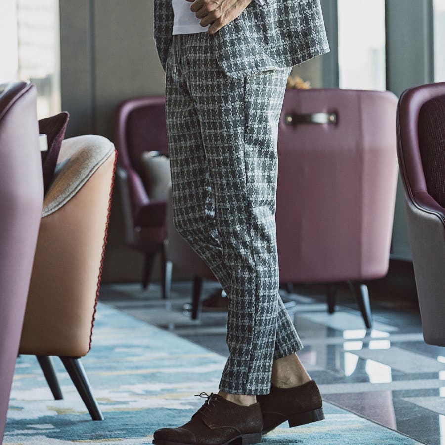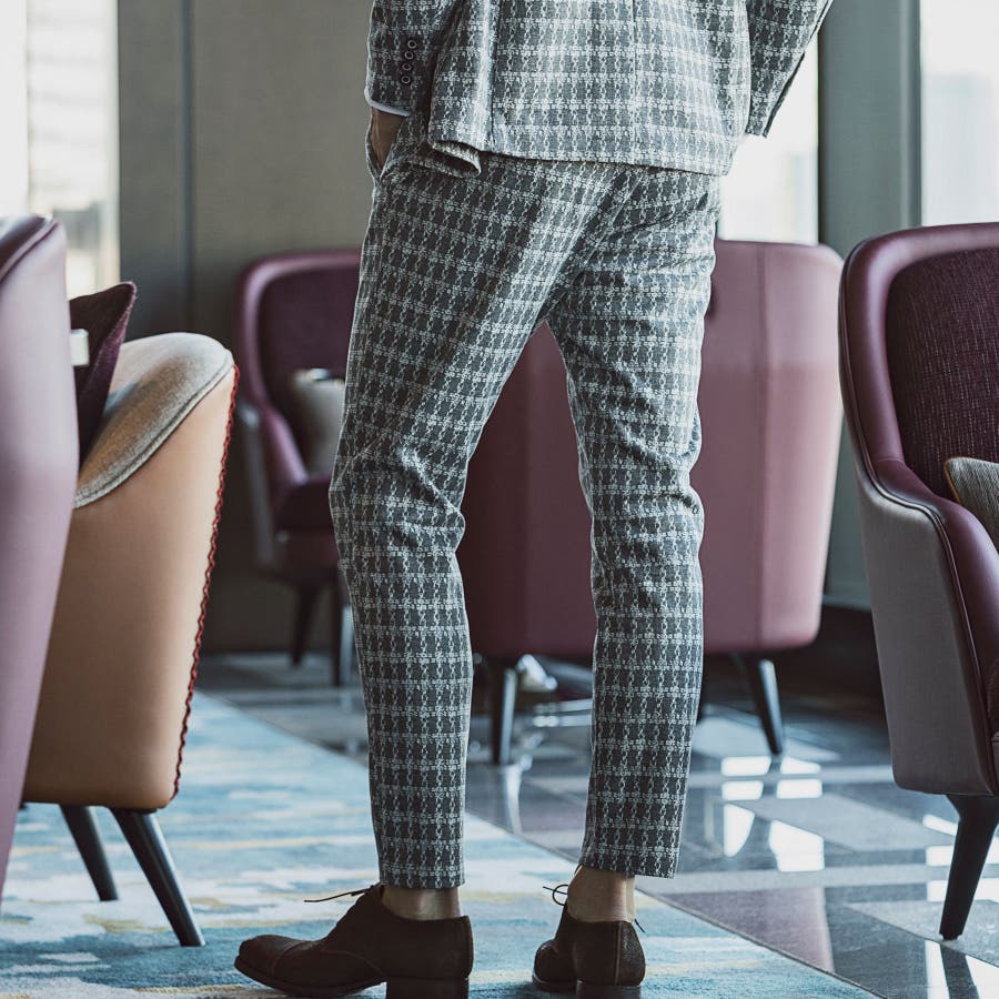 かっちりしたフォーマルなデザインに見せつつウエストはドローコードで調節可能。また、リラックスラインならではのストレッチの利いたジャガード素材で着心地は抜群。ふくらはぎは少しだけ膨らませつつシルエットを細く見せるオリジナルパターンワーク。
