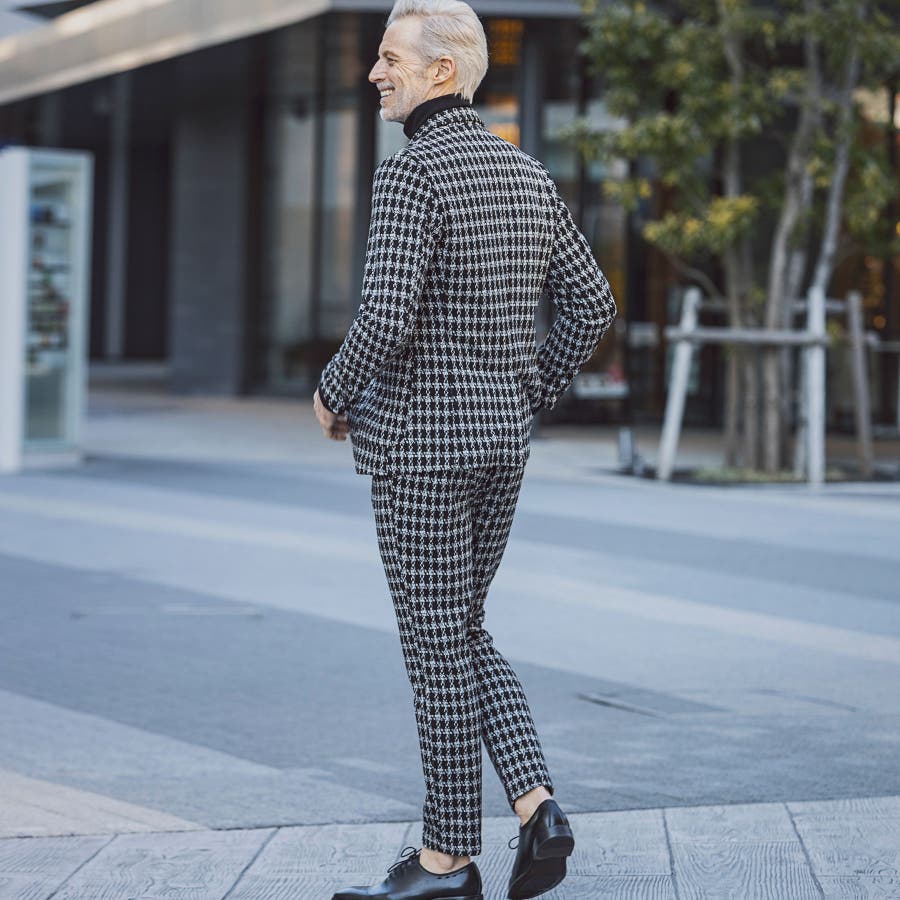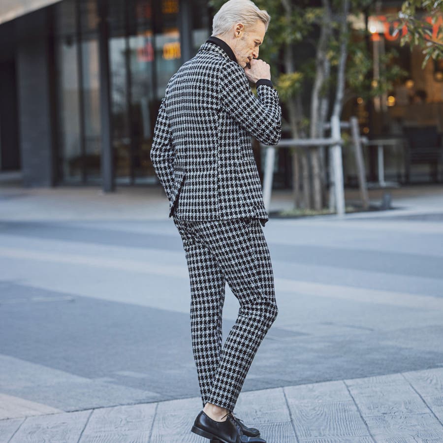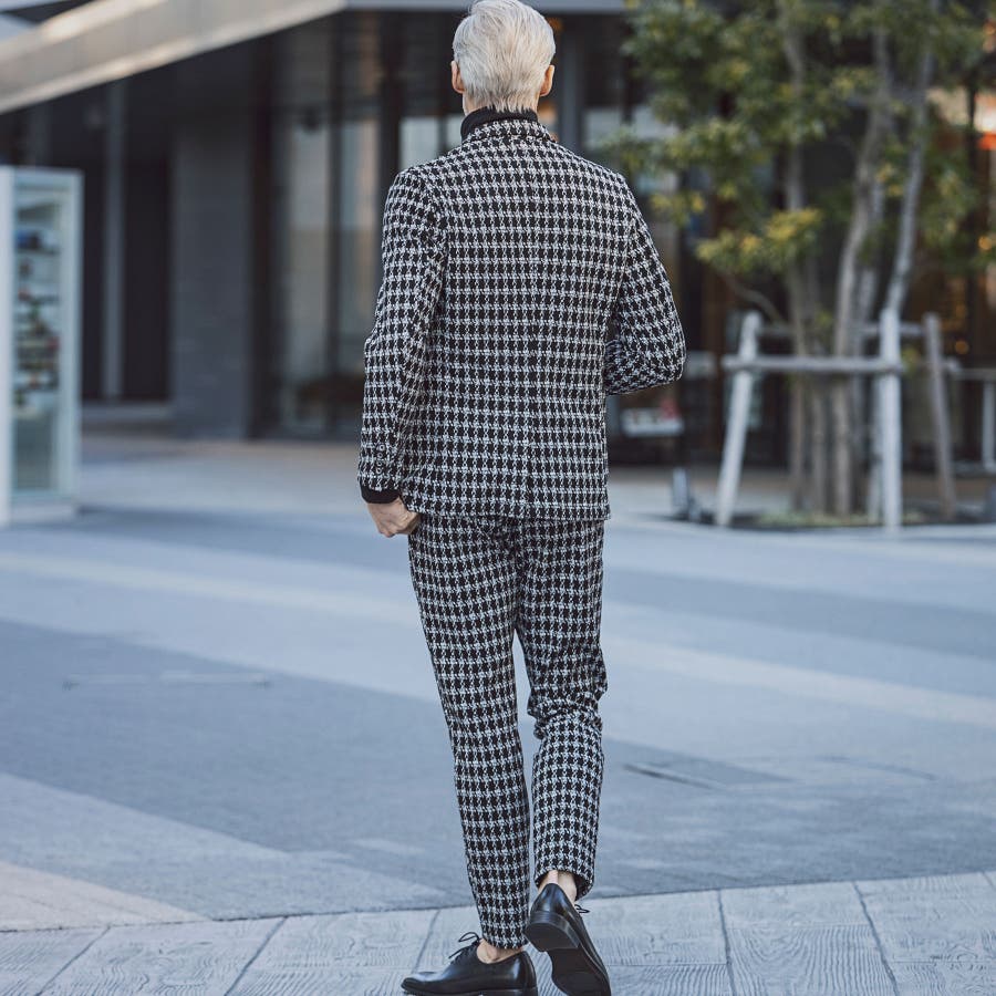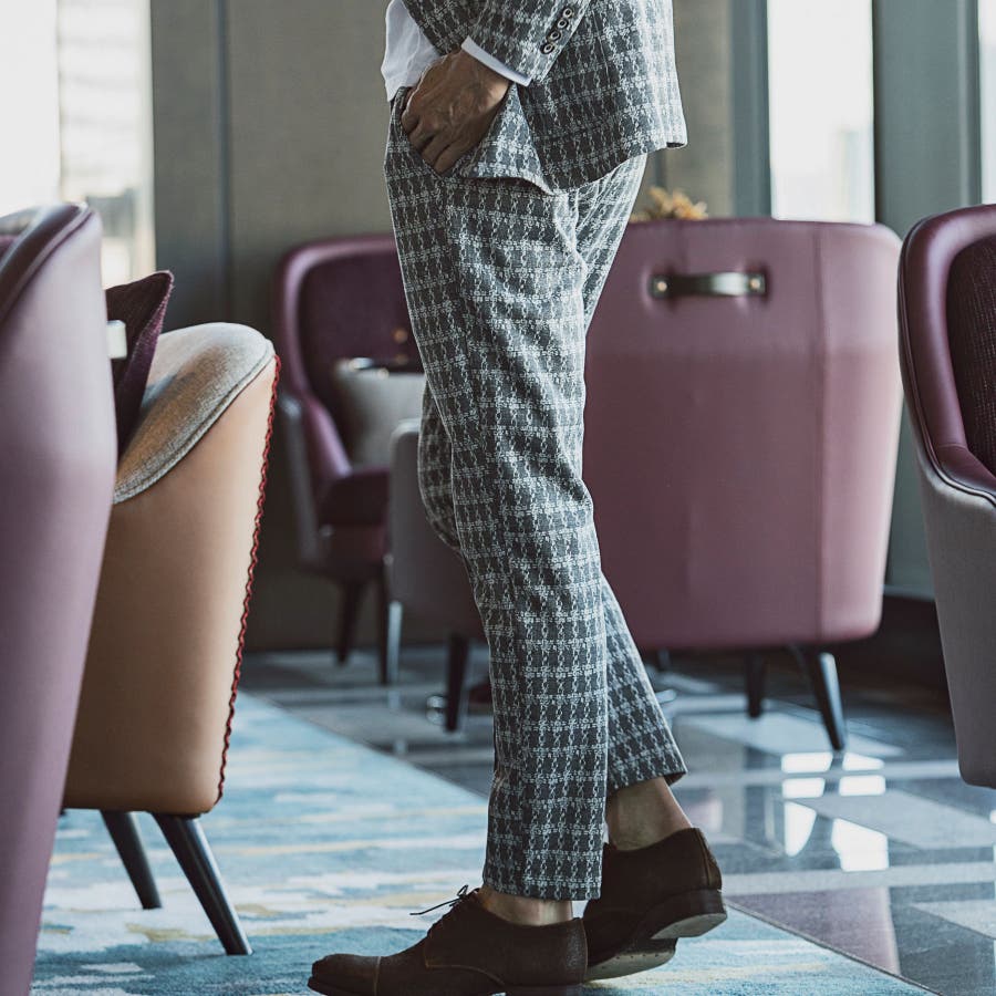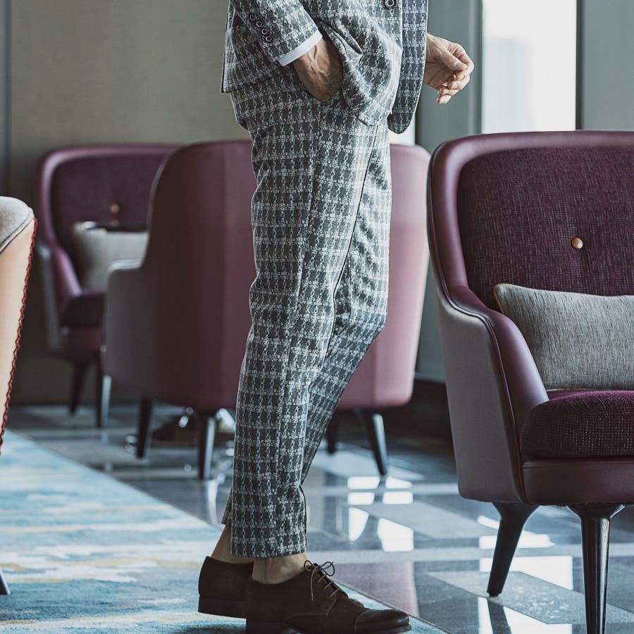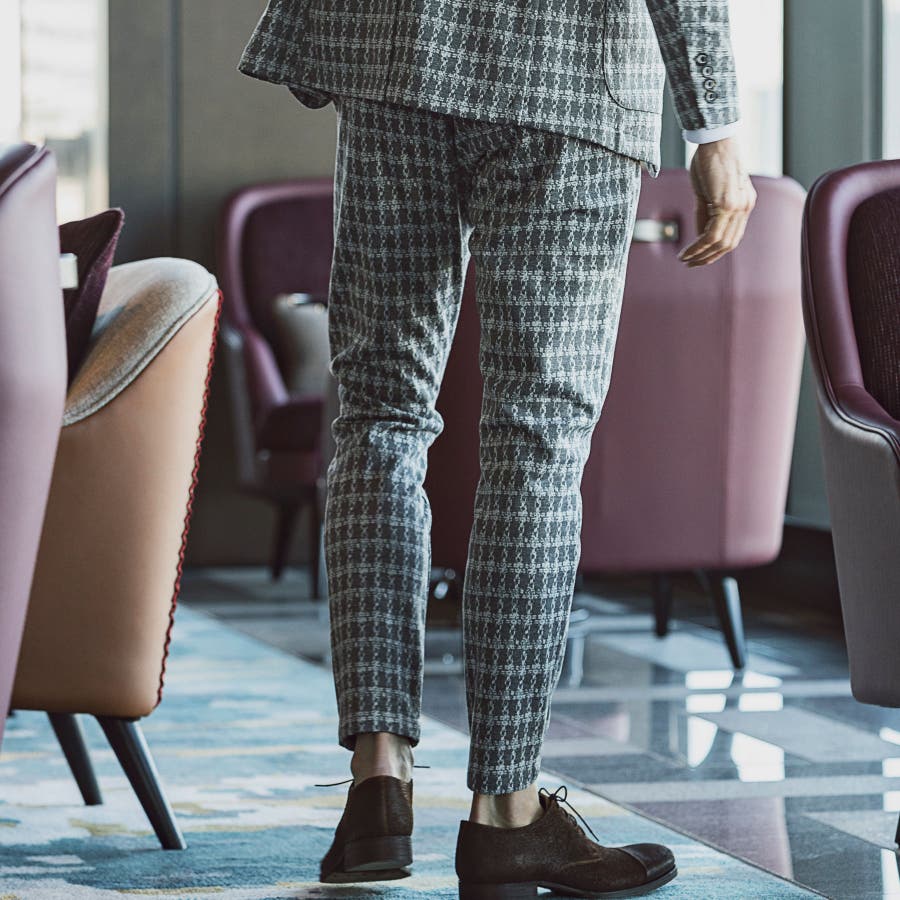 かっちりしたフォーマルなデザインに見せつつウエストはドローコードで調節可能。また、リラックスラインならではのストレッチの利いたジャガード素材で着心地は抜群。ふくらはぎは少しだけ膨らませつつシルエットを細く見せるオリジナルパターンワーク。