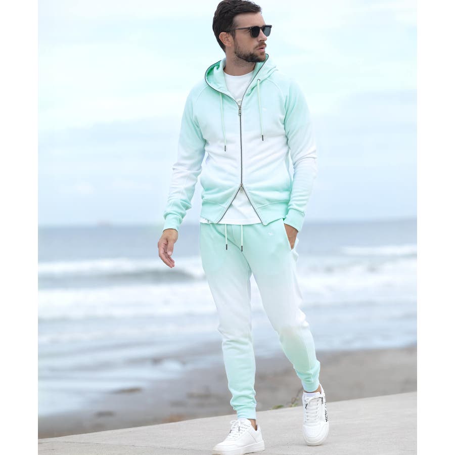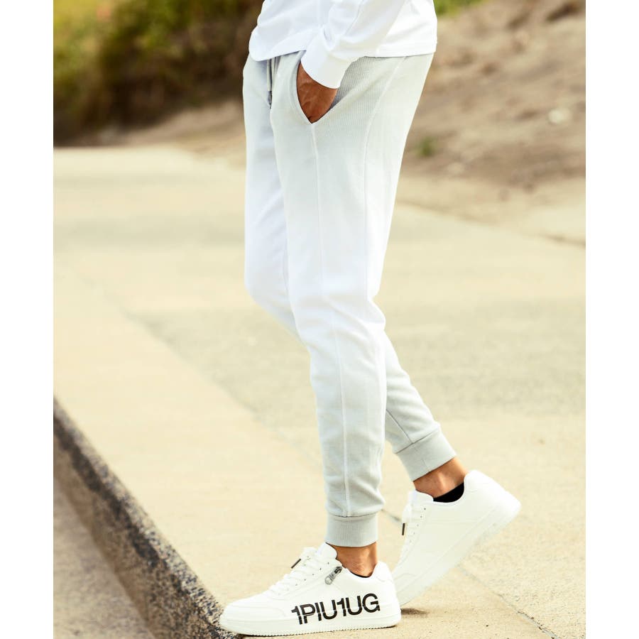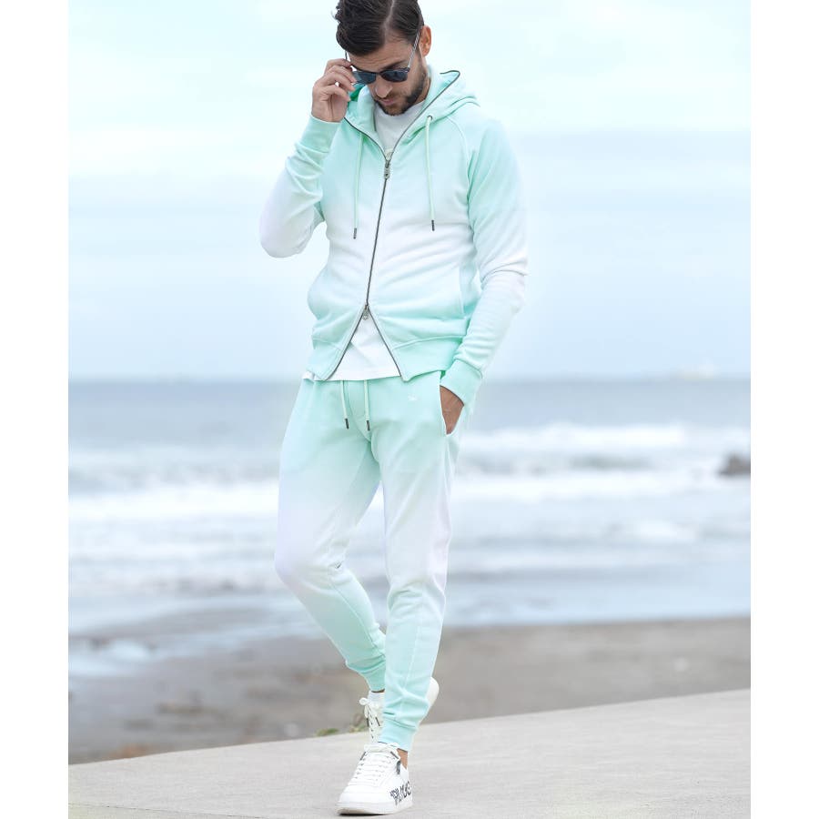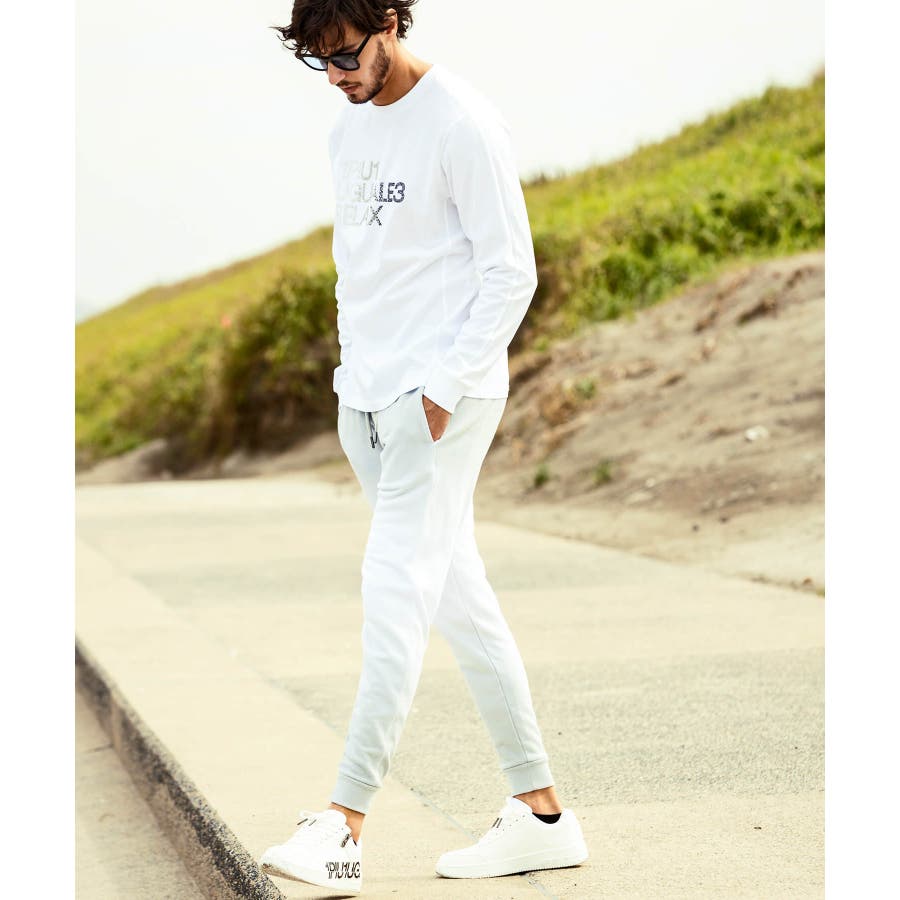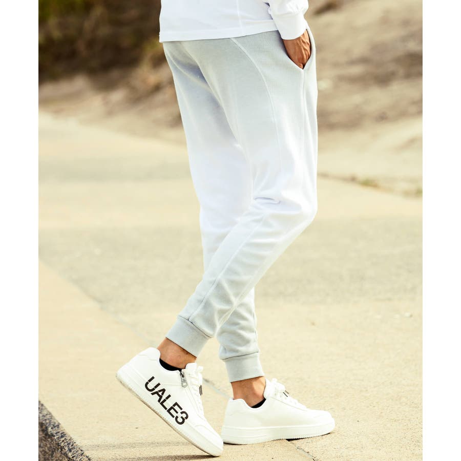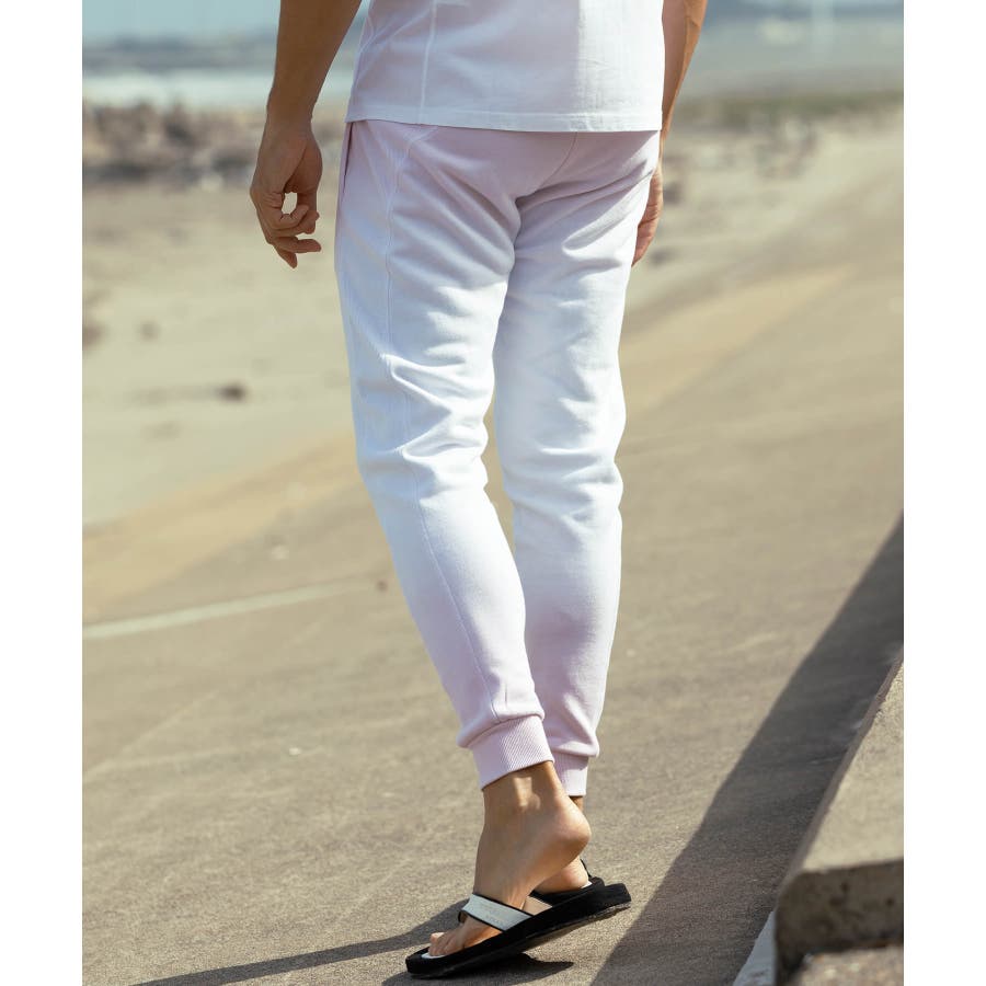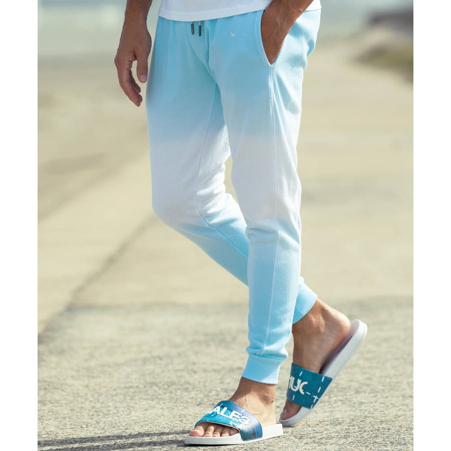 ペールカラーからホワイトへのグラデーションが華やかに彩るスウェットジョグパンツ。