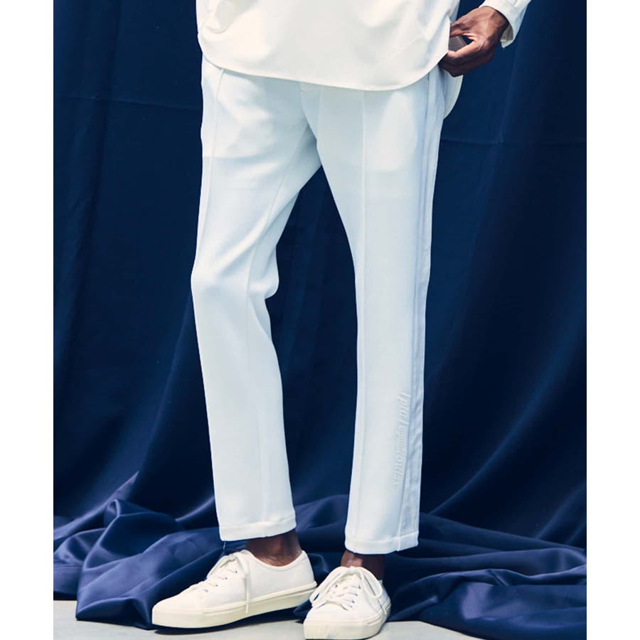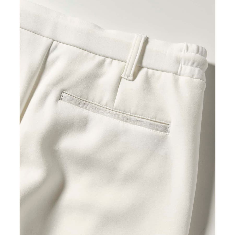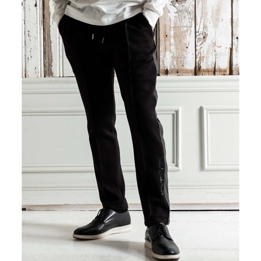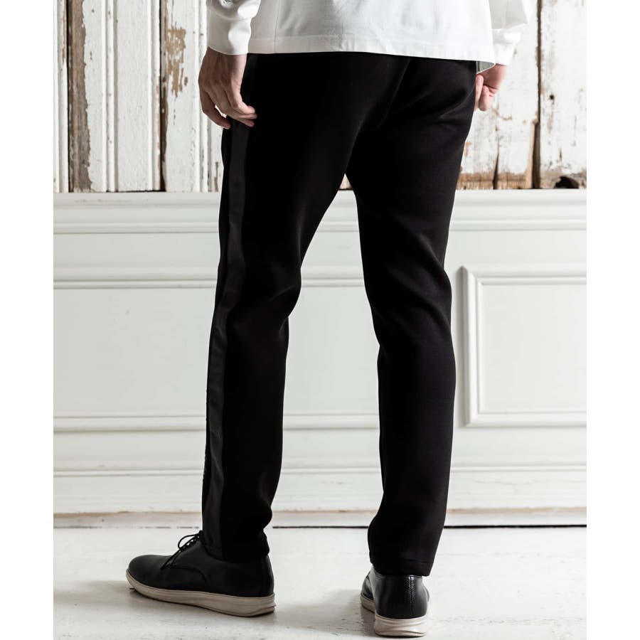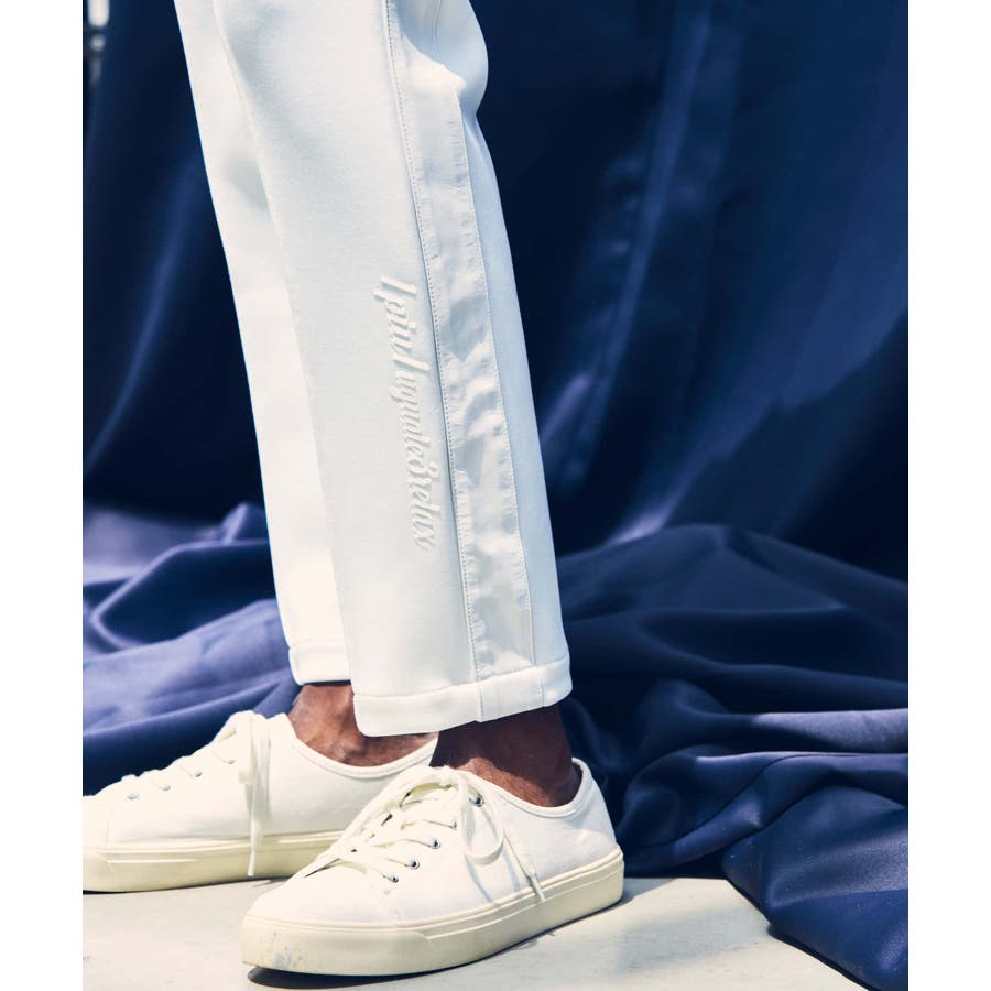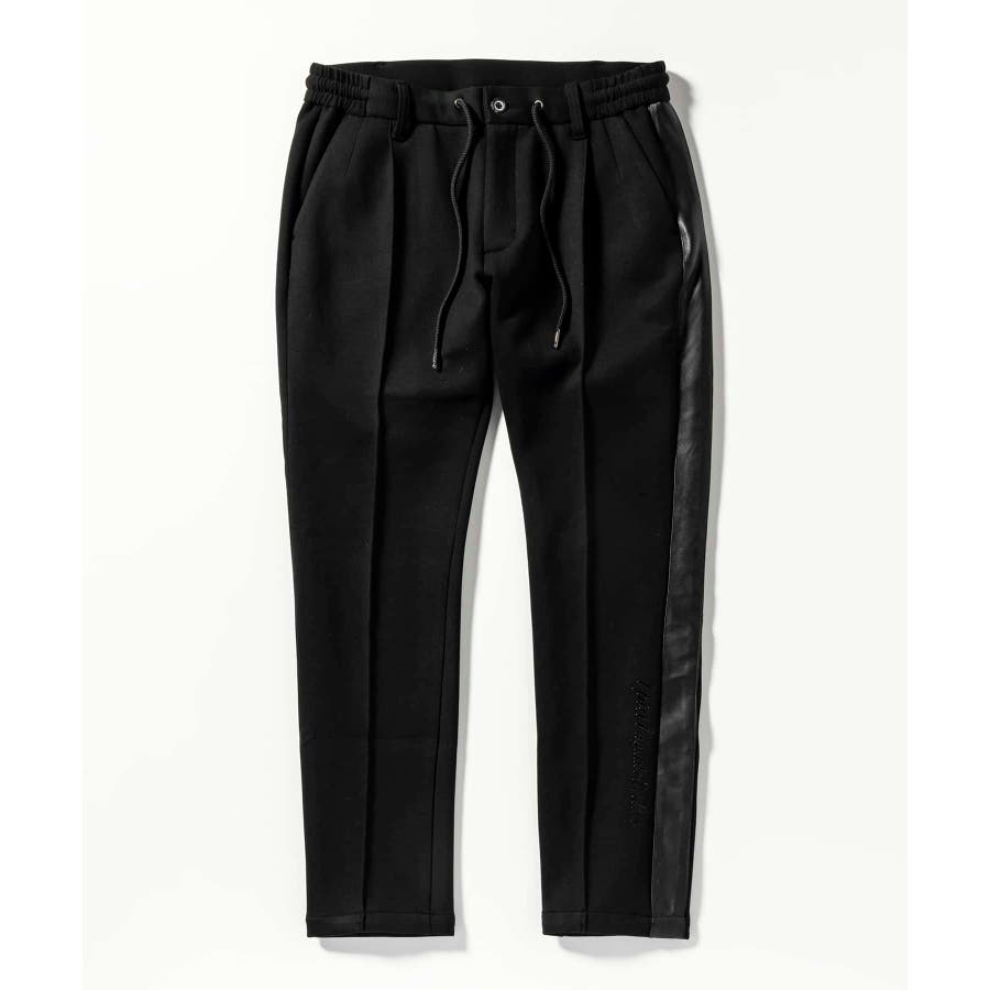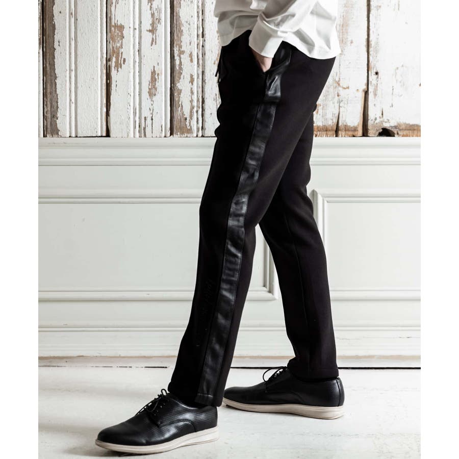 サイド部分にレザーをオンしたロングパンツ。