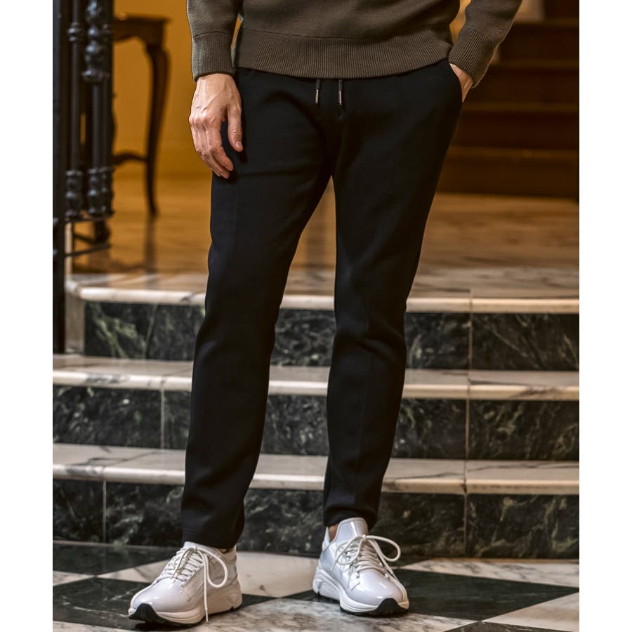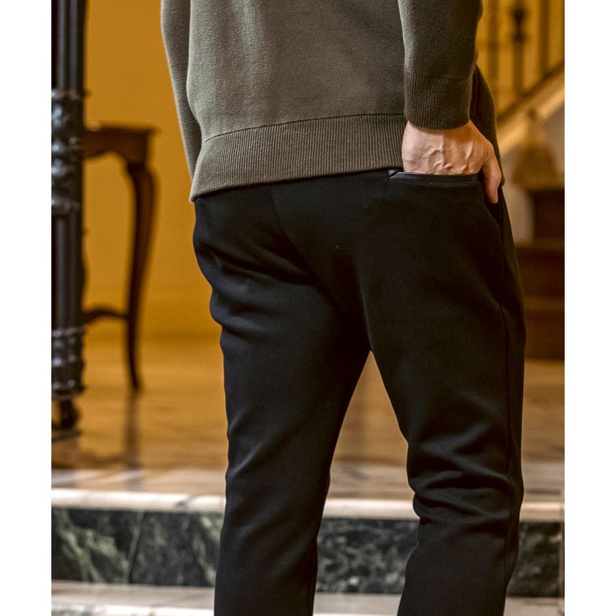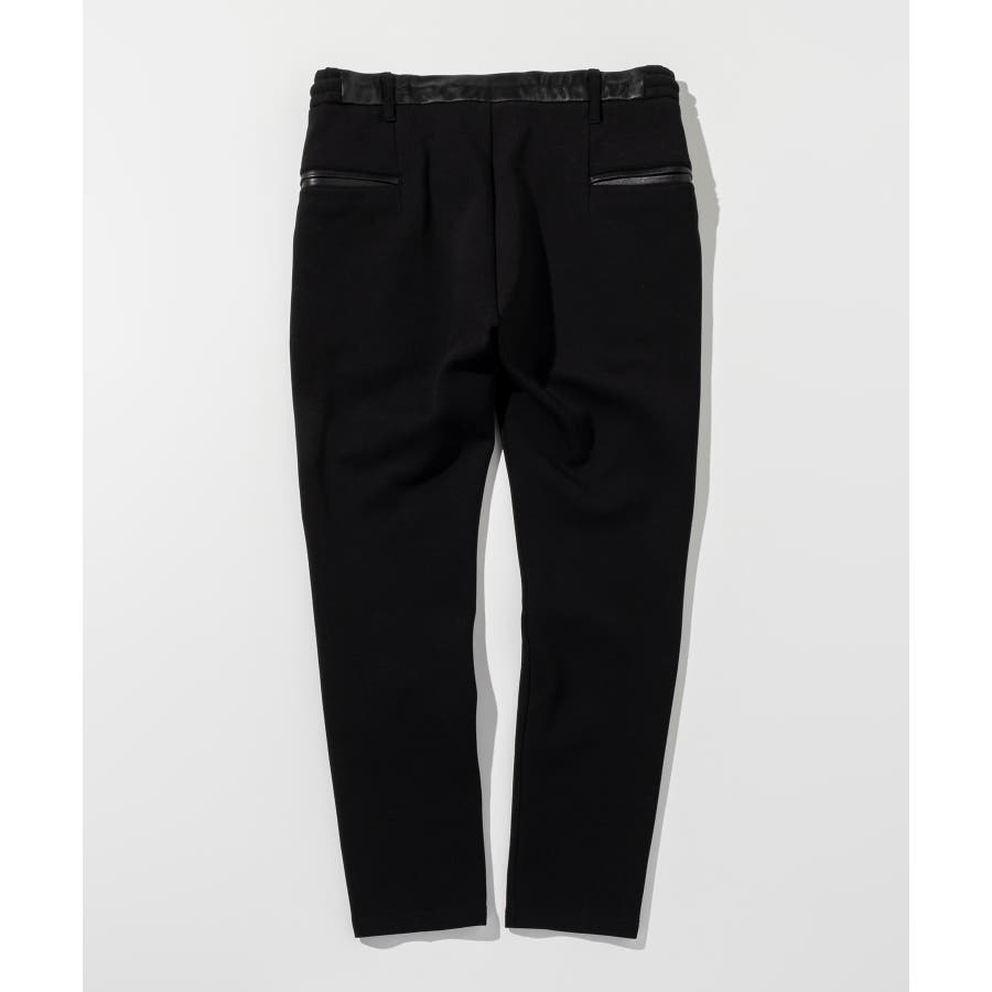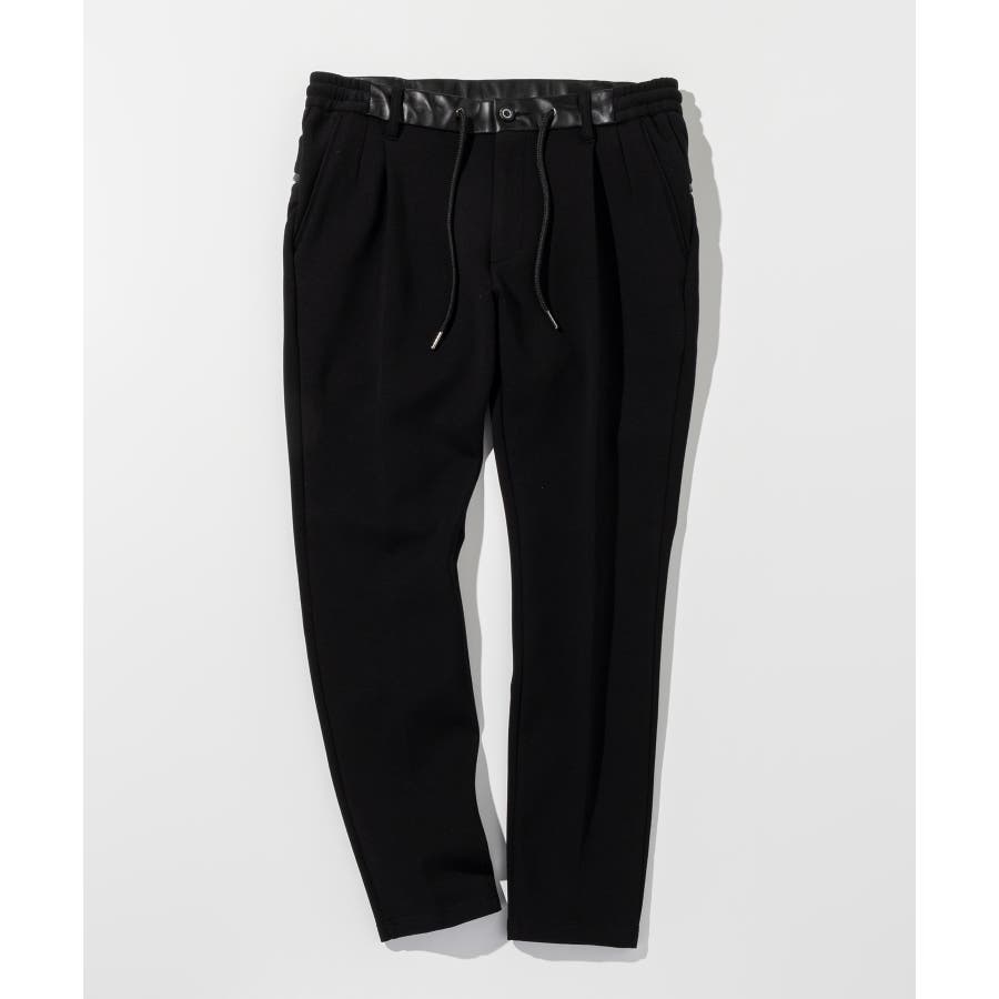 ウエストとバックポケットにレザーを差し込んだ異素材ロングパンツ。