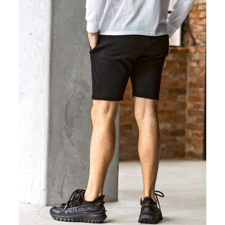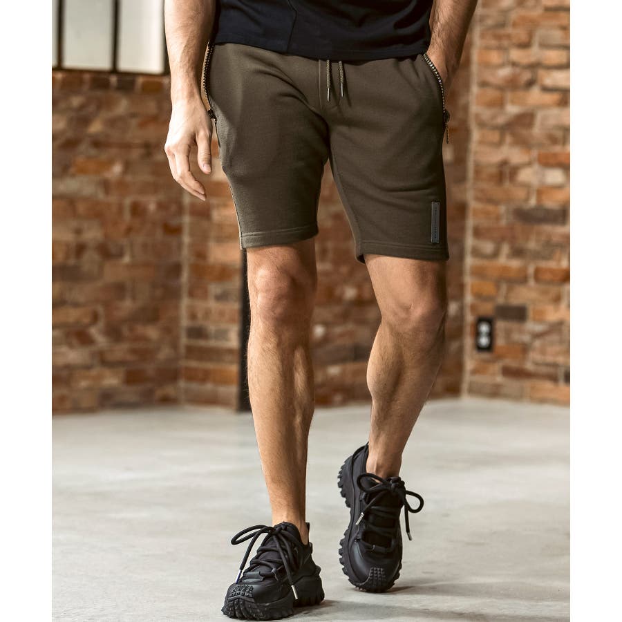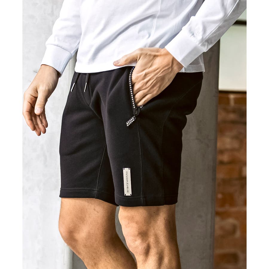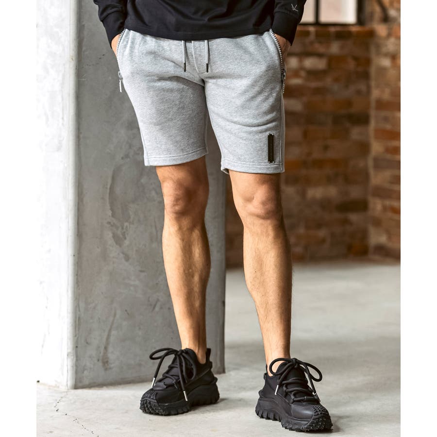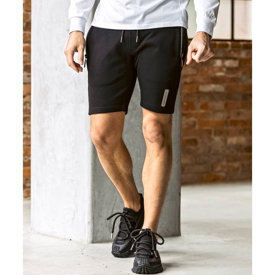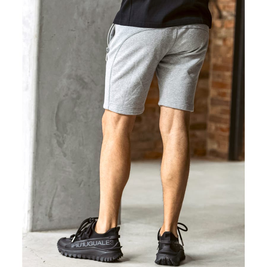 裾口にシルバープレートでブランドロゴを差し込んだハーフパンツ。