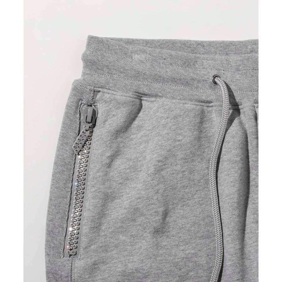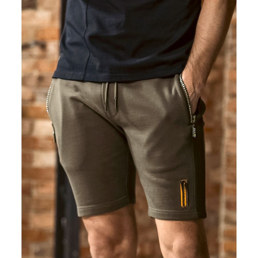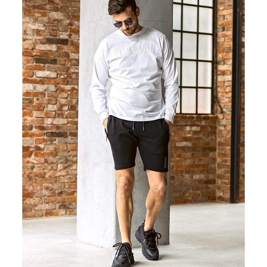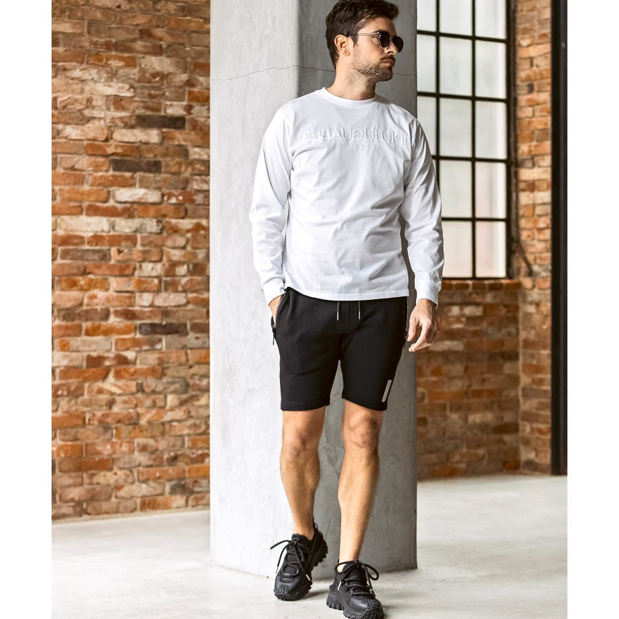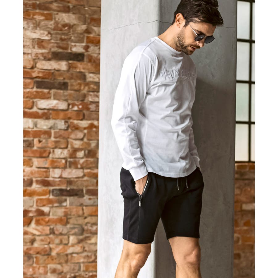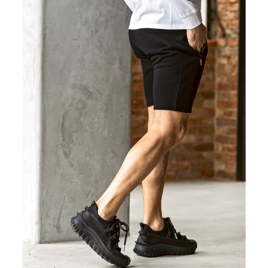 裾口にシルバープレートでブランドロゴを差し込んだハーフパンツ。