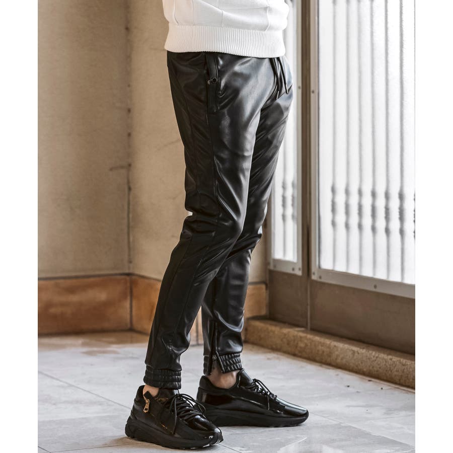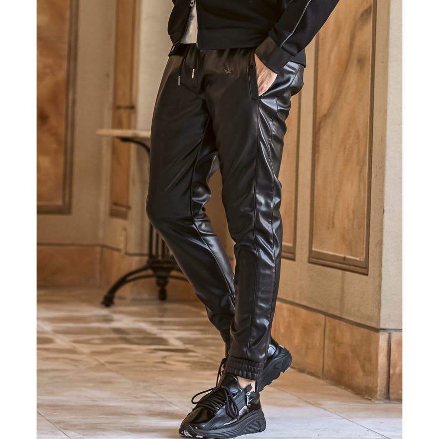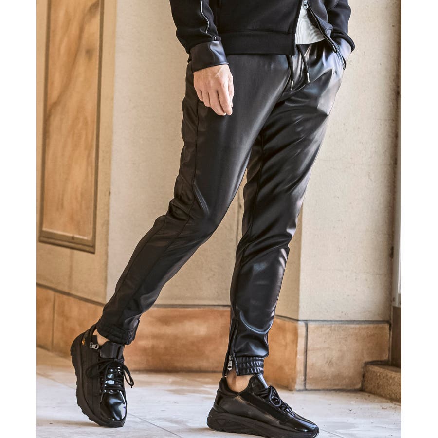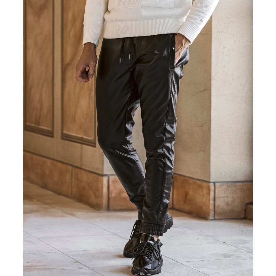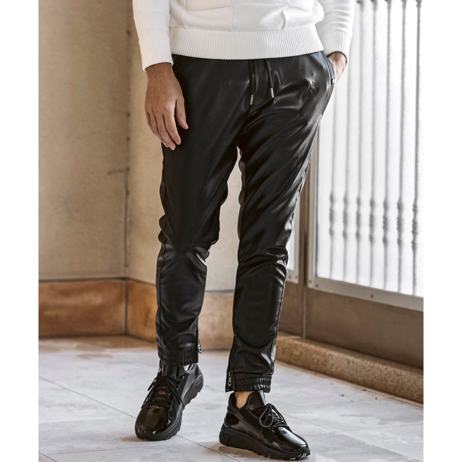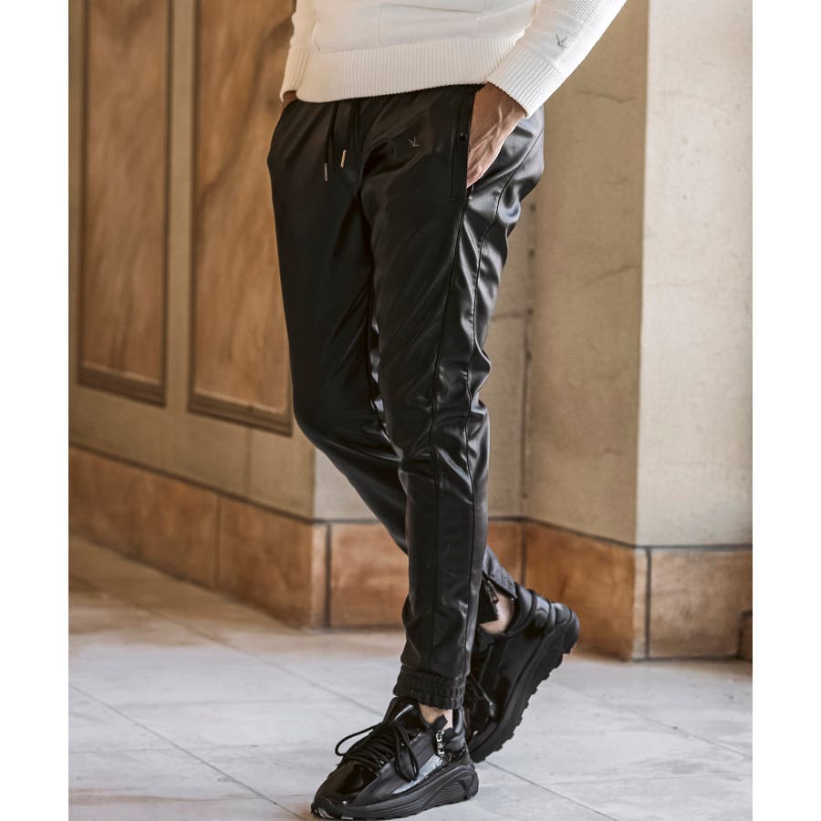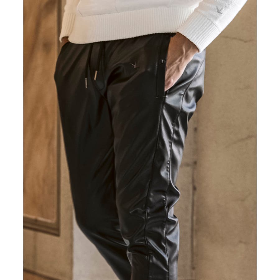 滑らかな艶感が上品なフェイクレザーを採用したロングパンツ。