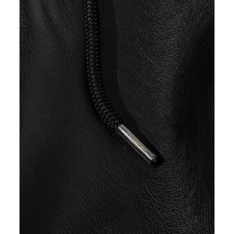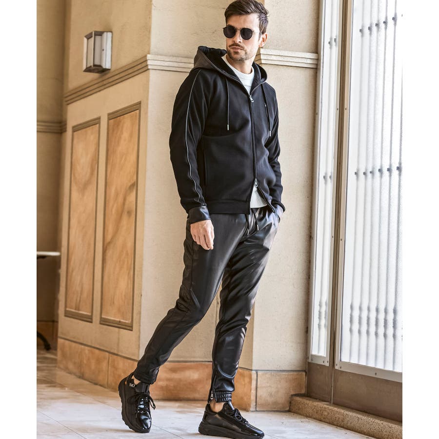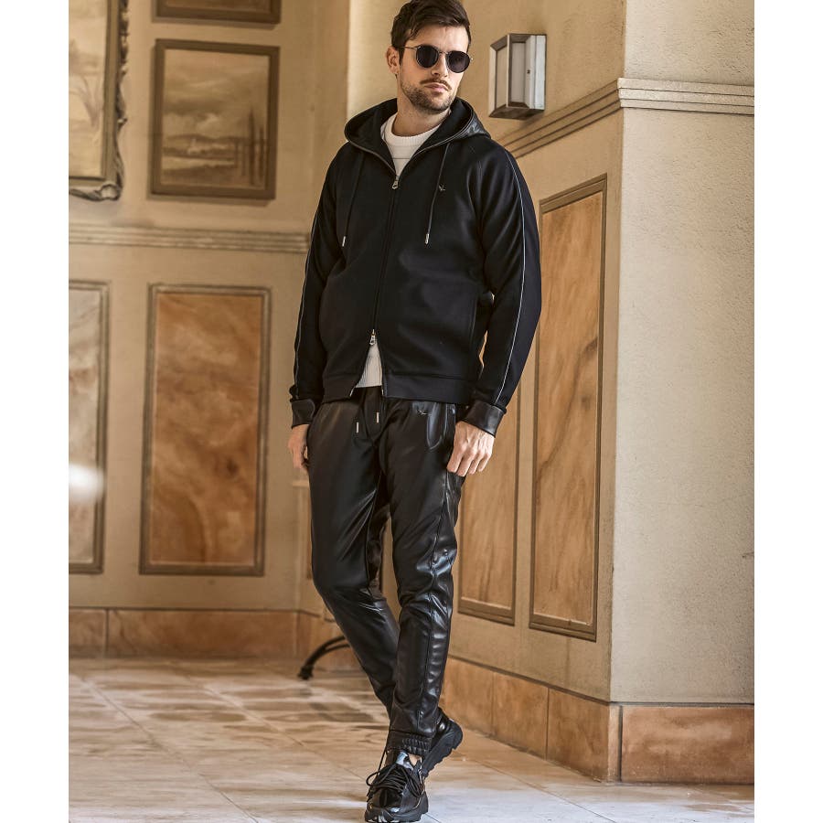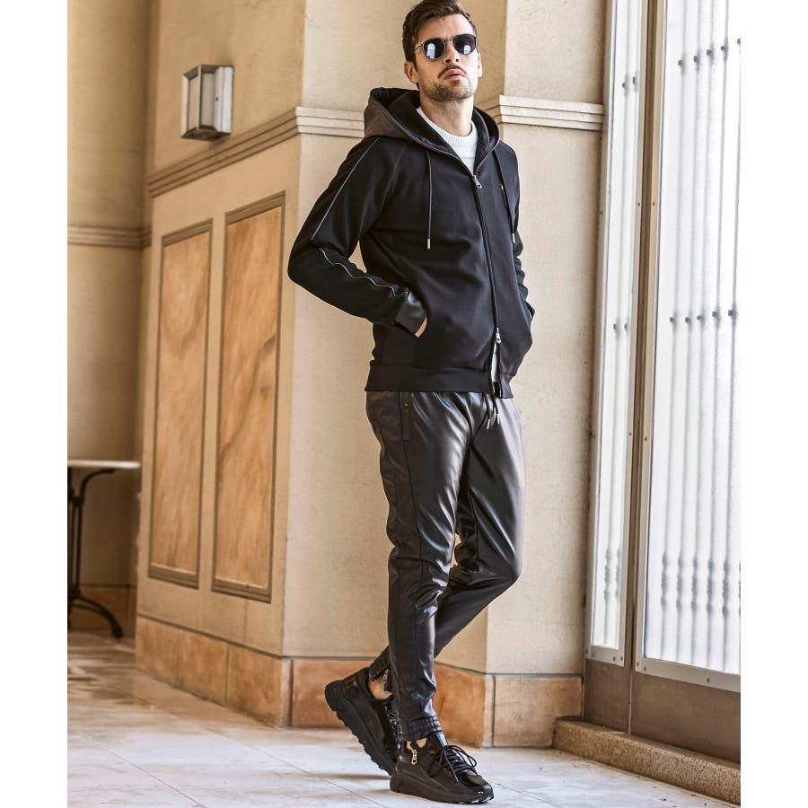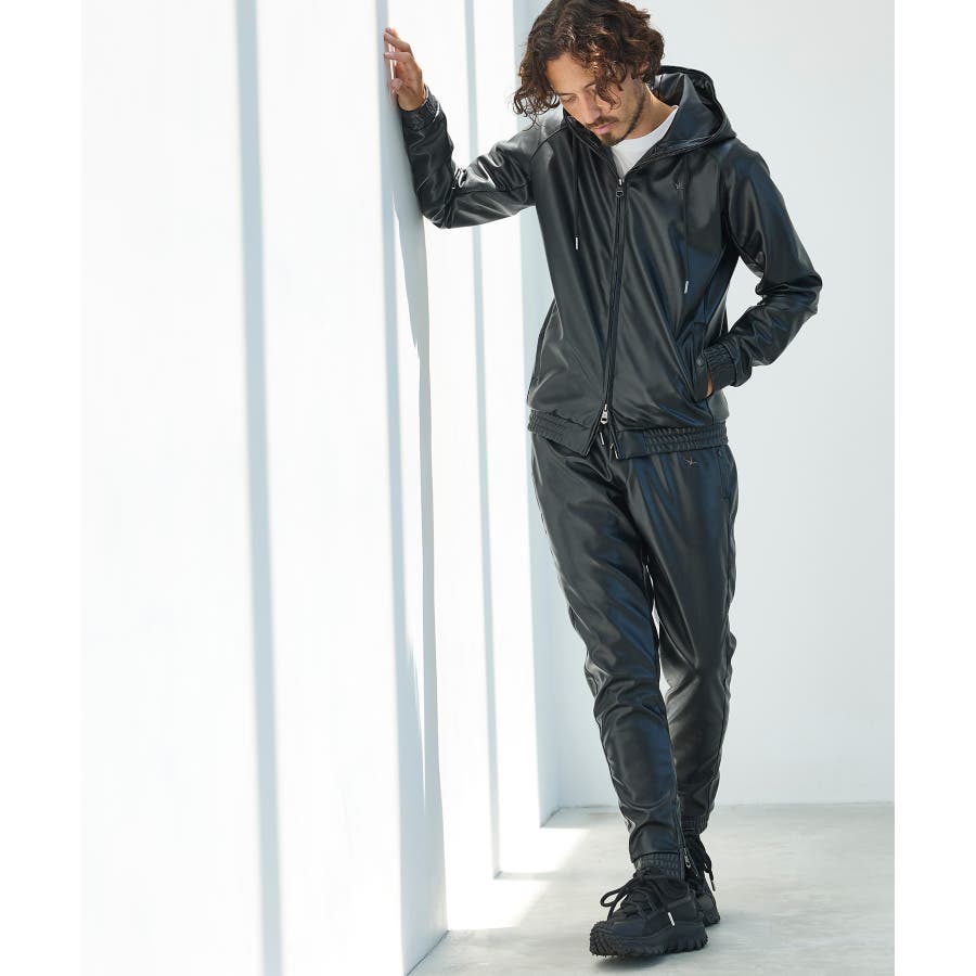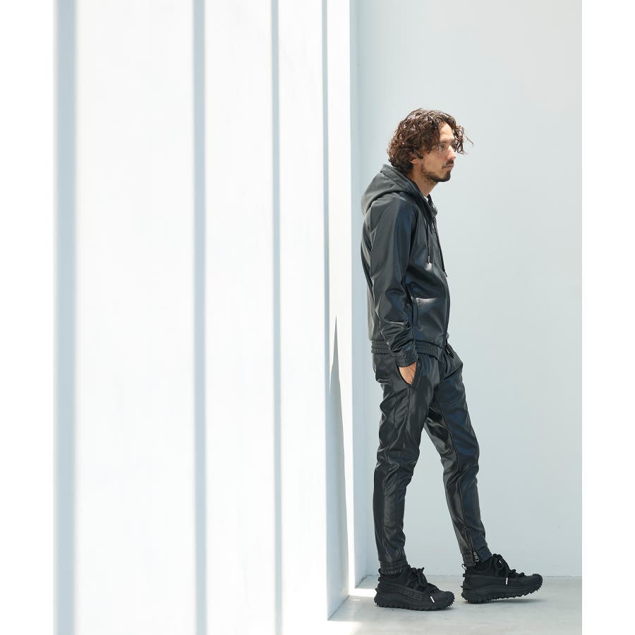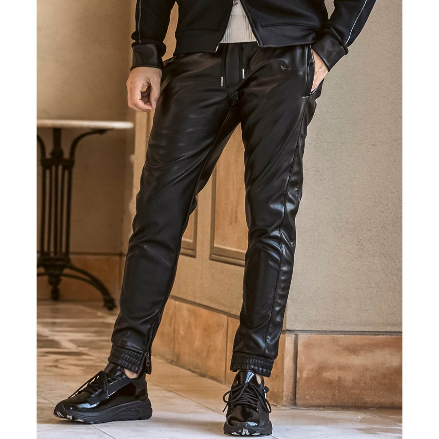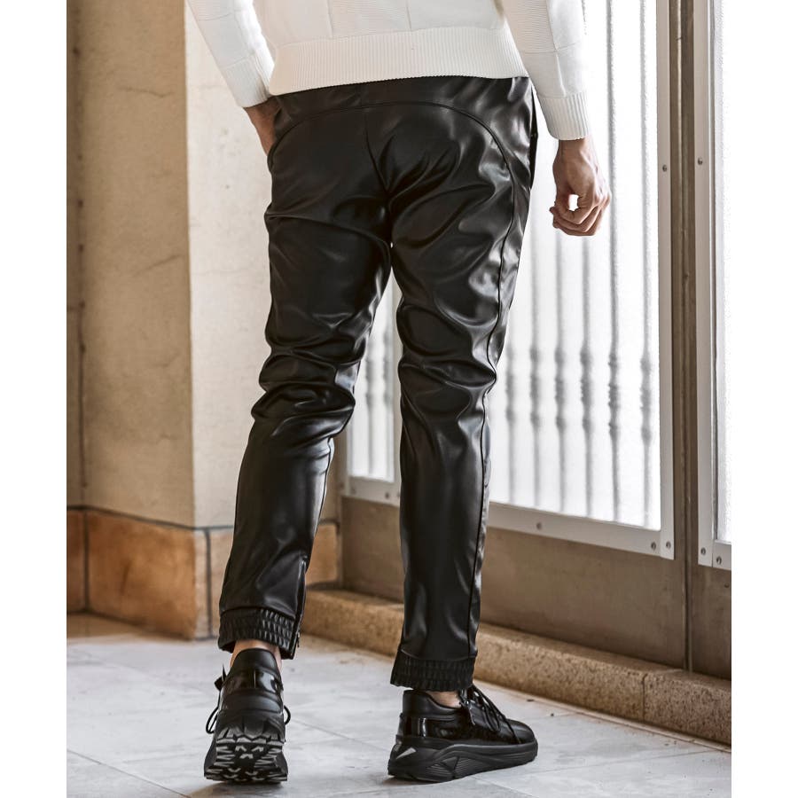 滑らかな艶感が上品なフェイクレザーを採用したロングパンツ。