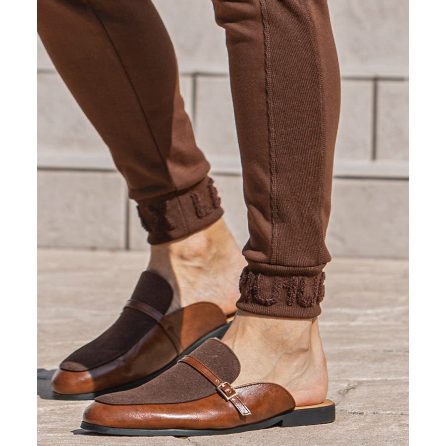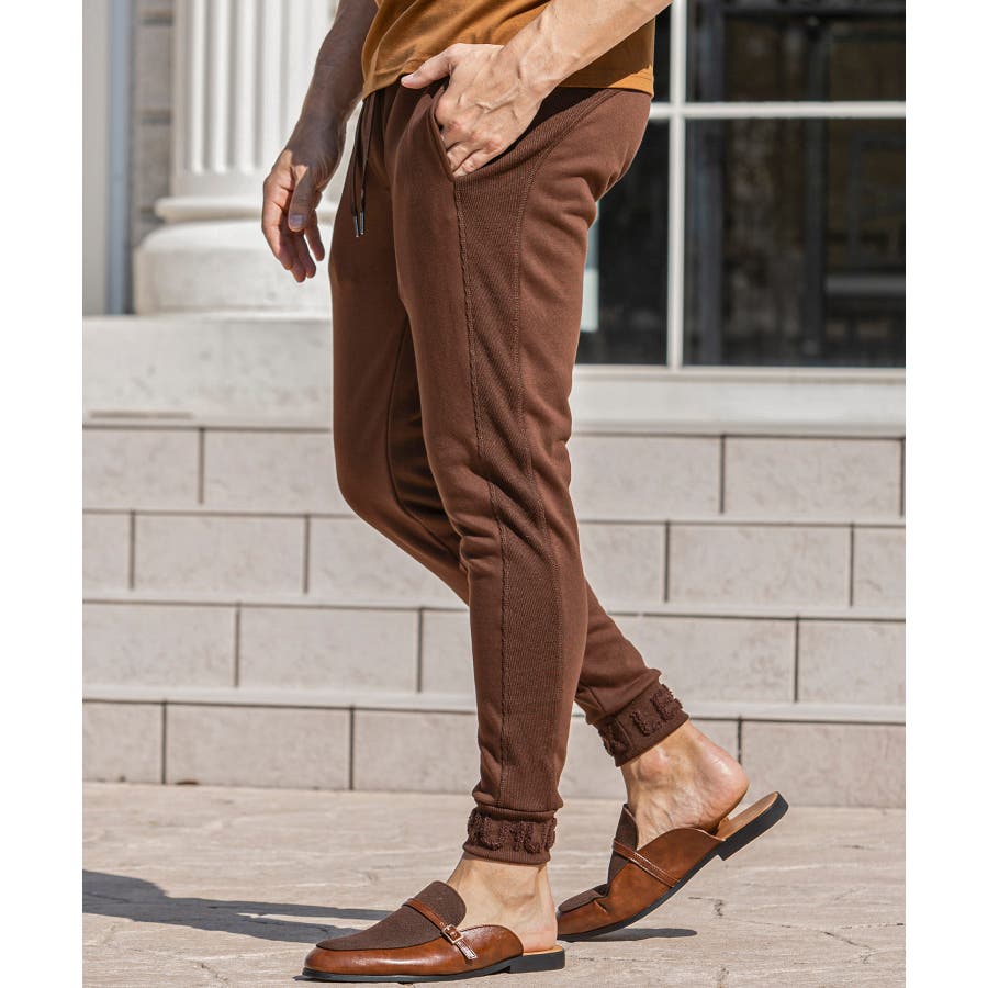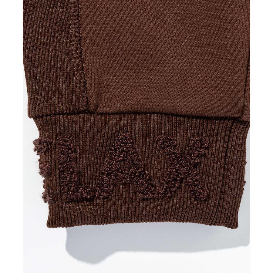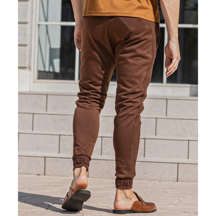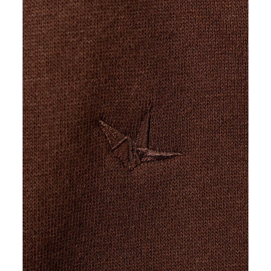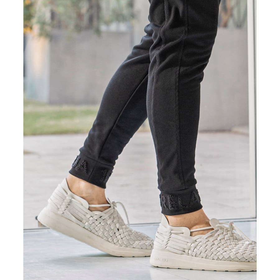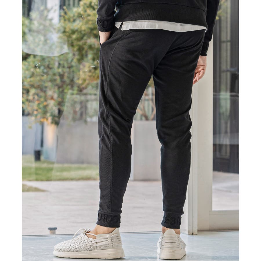 裾口にサガラ刺繍でロゴを配置したロングパンツ。
