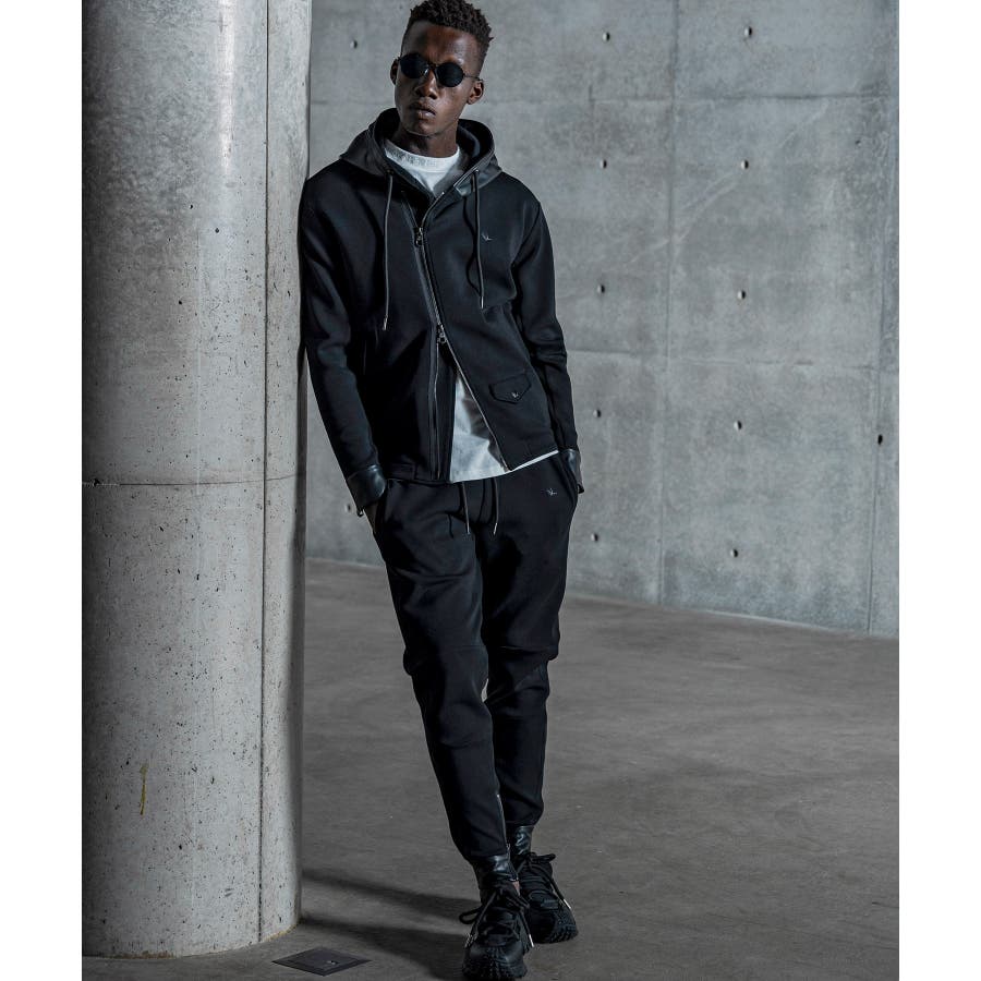 ミニマルなオールブラックの中に、素材のコントラストとシャープなラインが際立ちます。