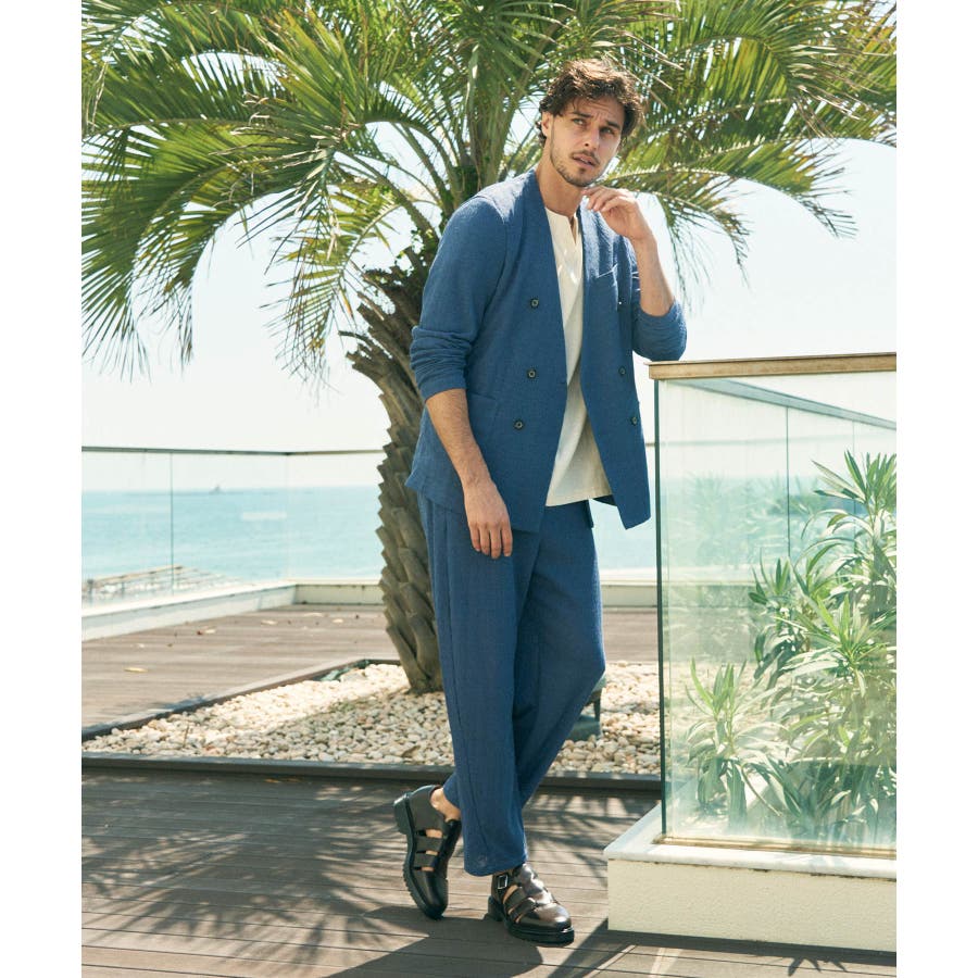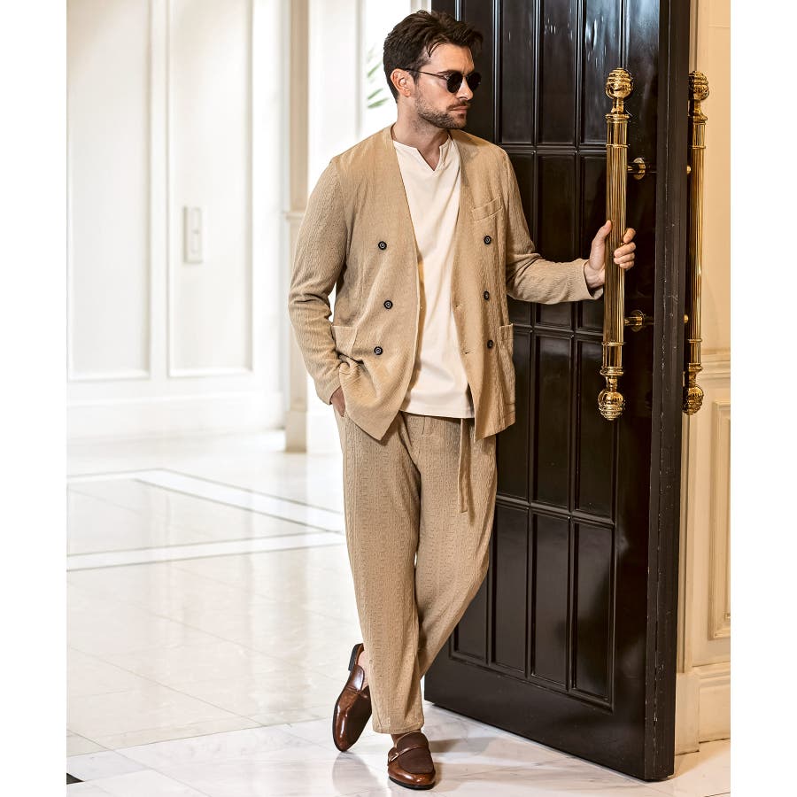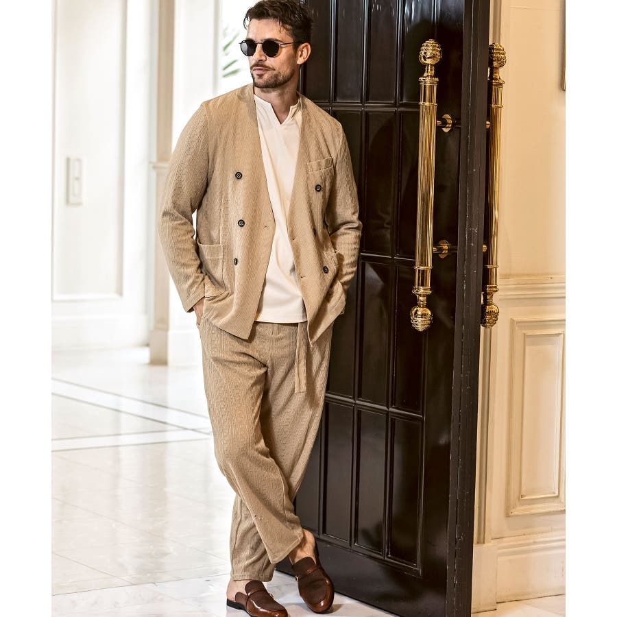 同生地のダブルジャケットやシングルジャケットと合わせれば、上質なセットアップスタイルに。