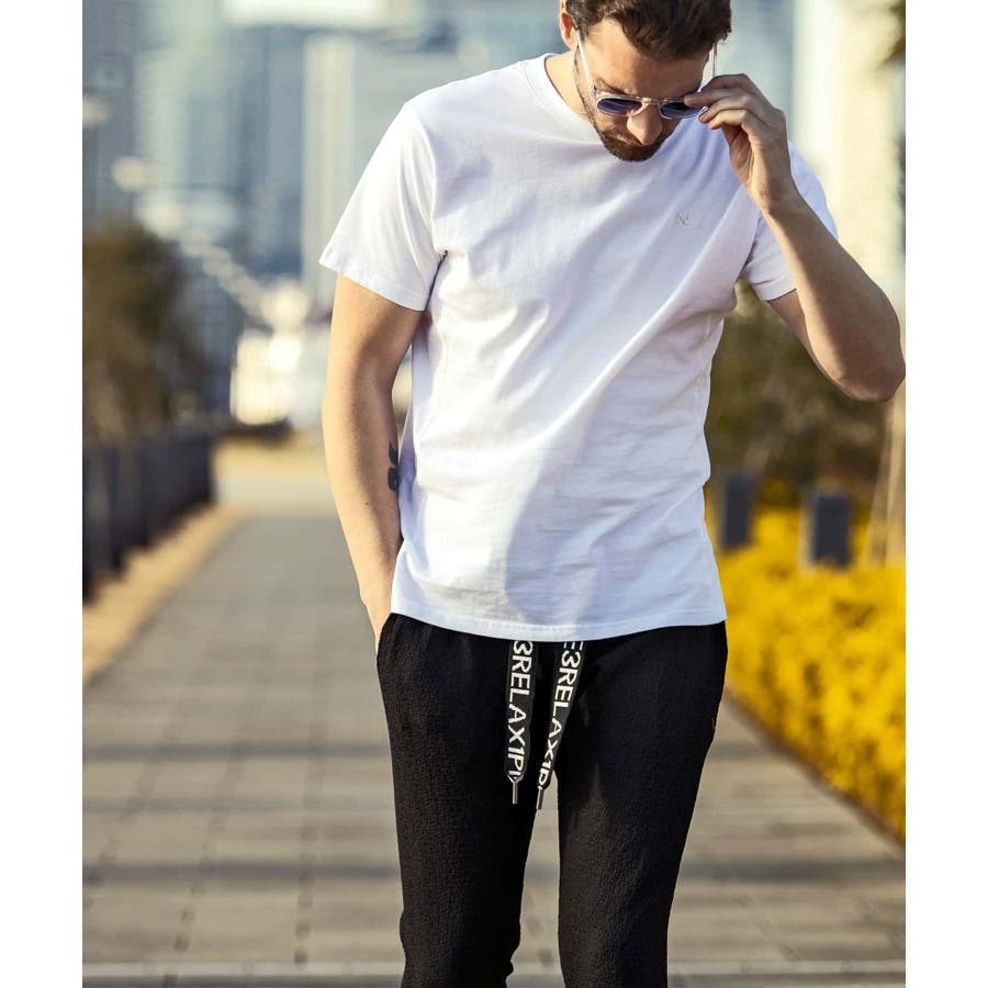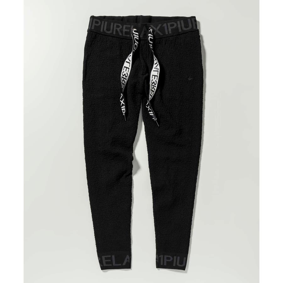 独特の表面感のあるストレッチニットで仕立てたロングパンツ。