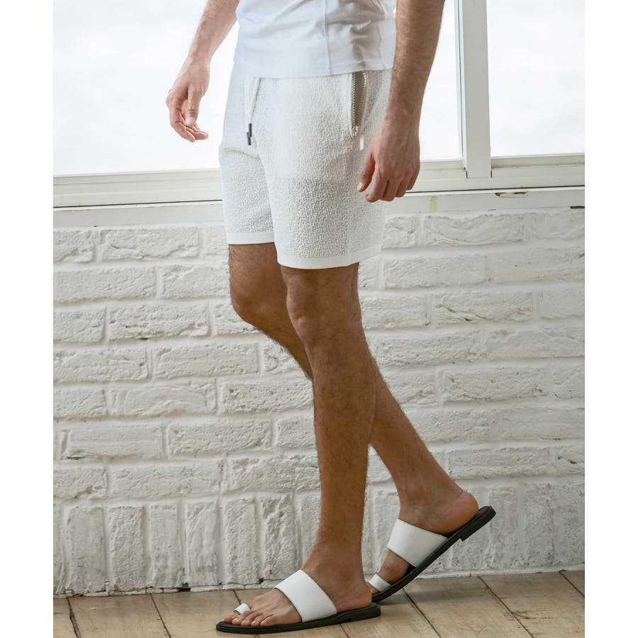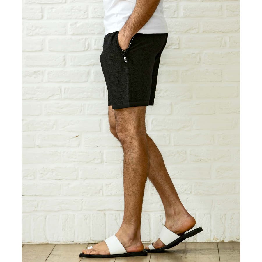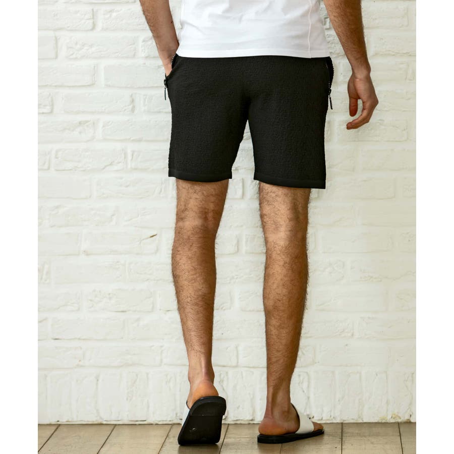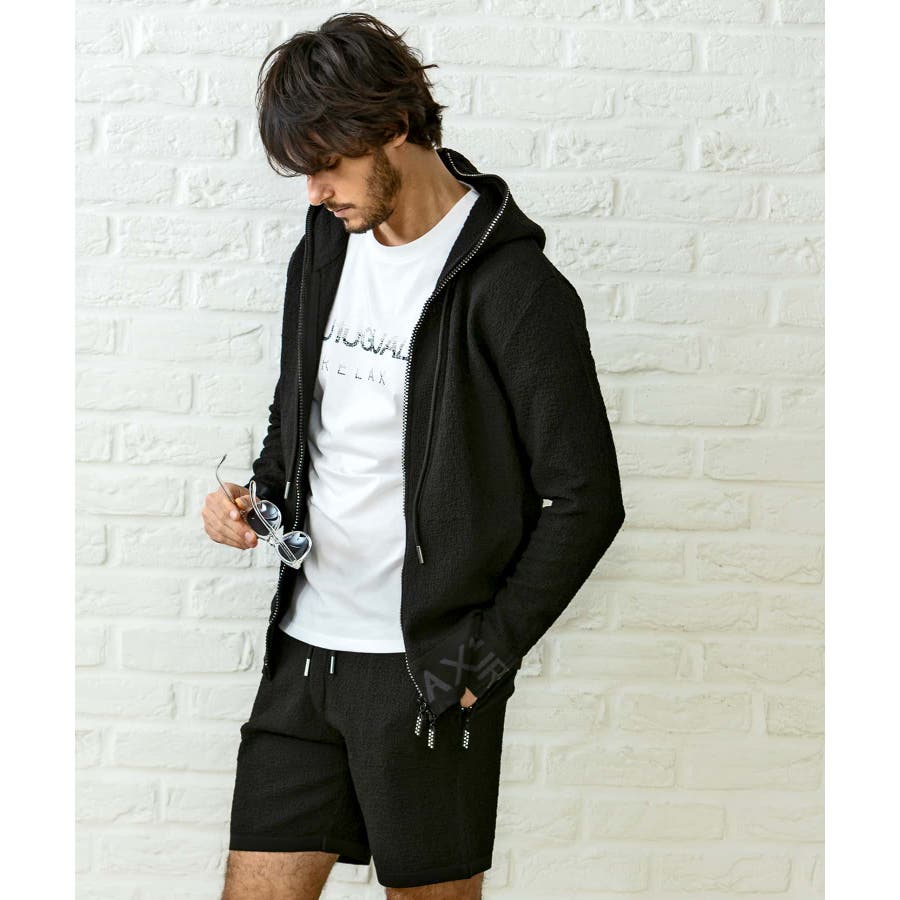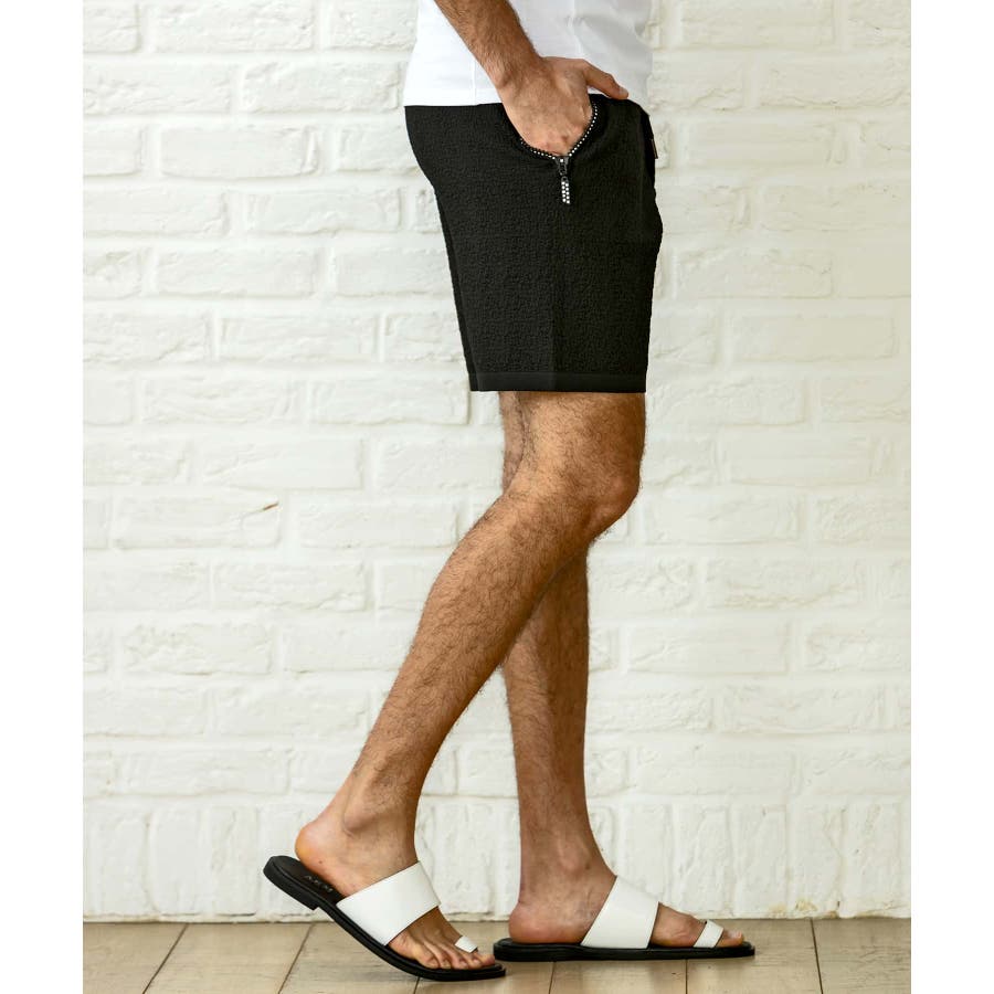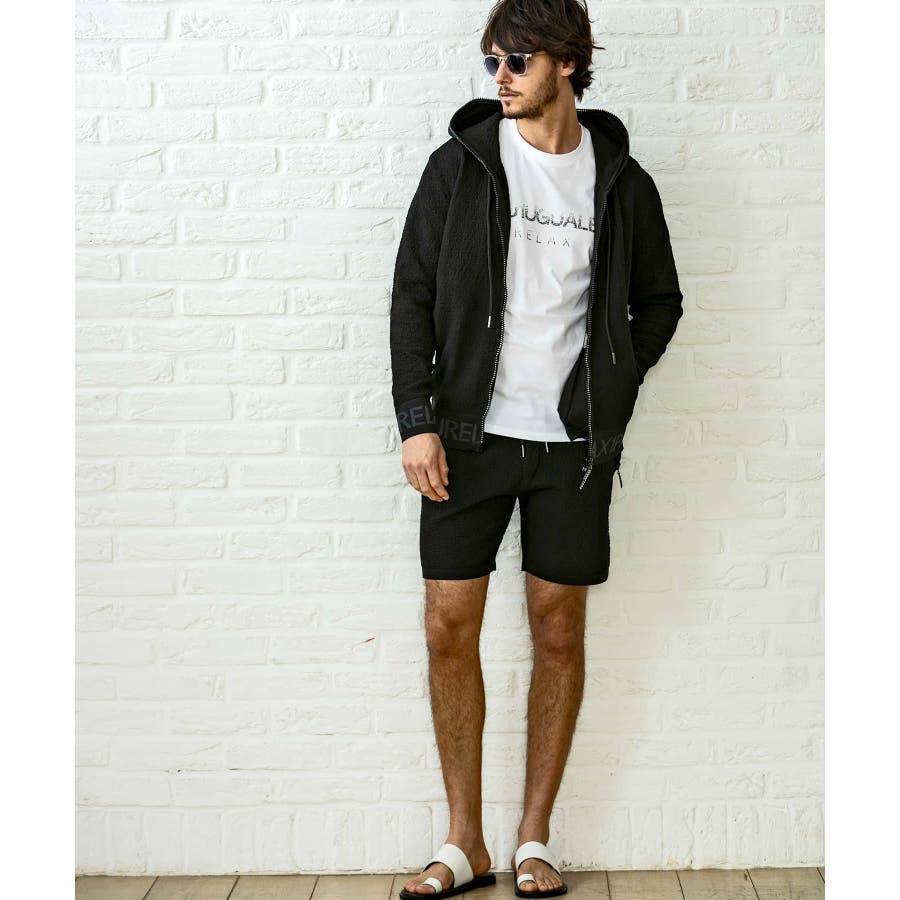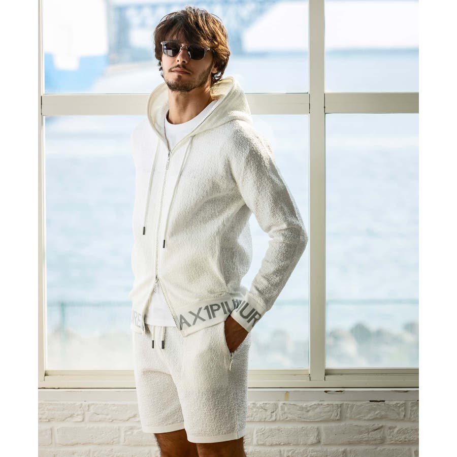 独特の表面感のあるストレッチニットで仕立てたハーフパンツ。