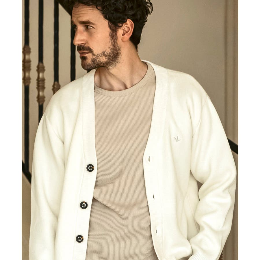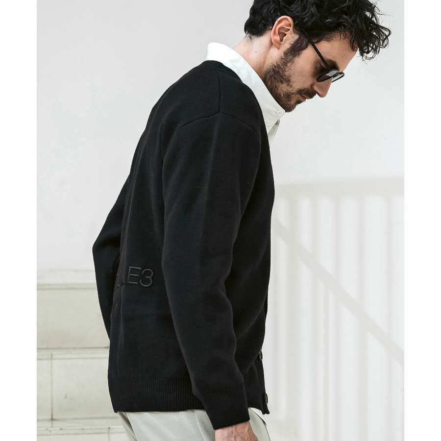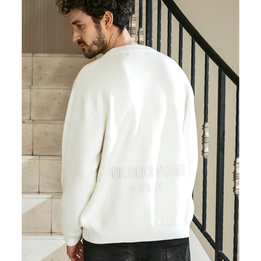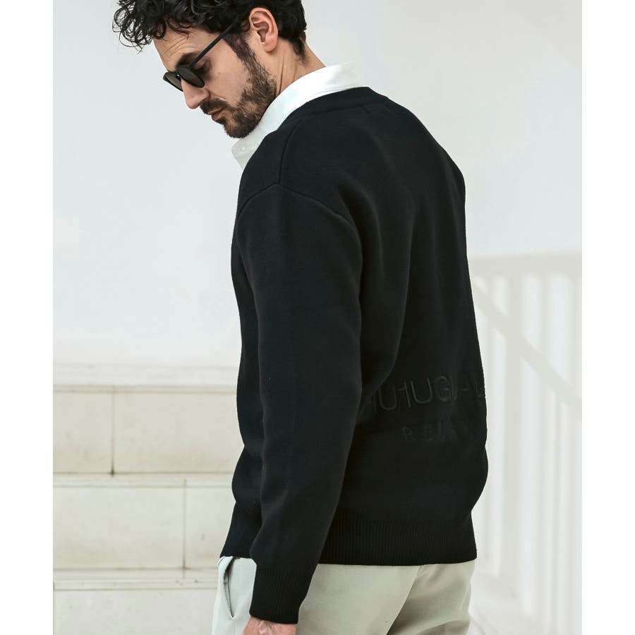 背面にブランドロゴを刺繍で配置したミドルカーデ。