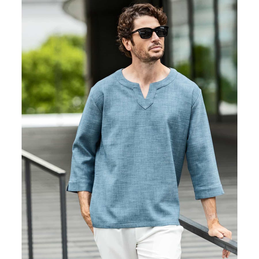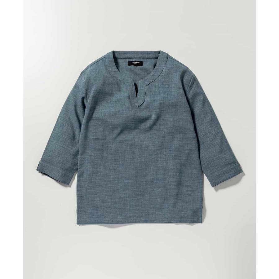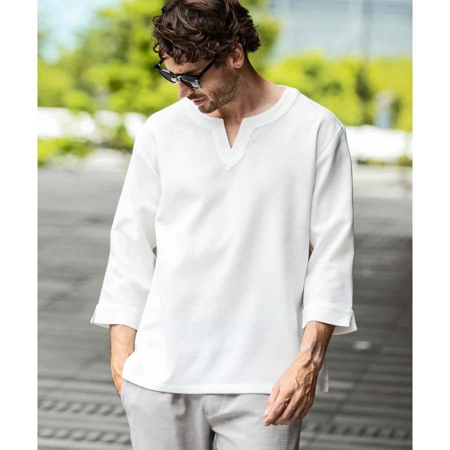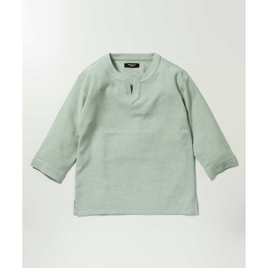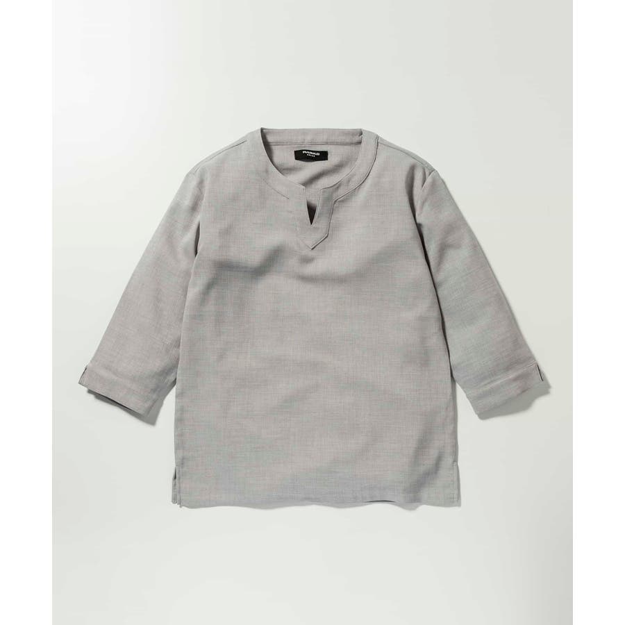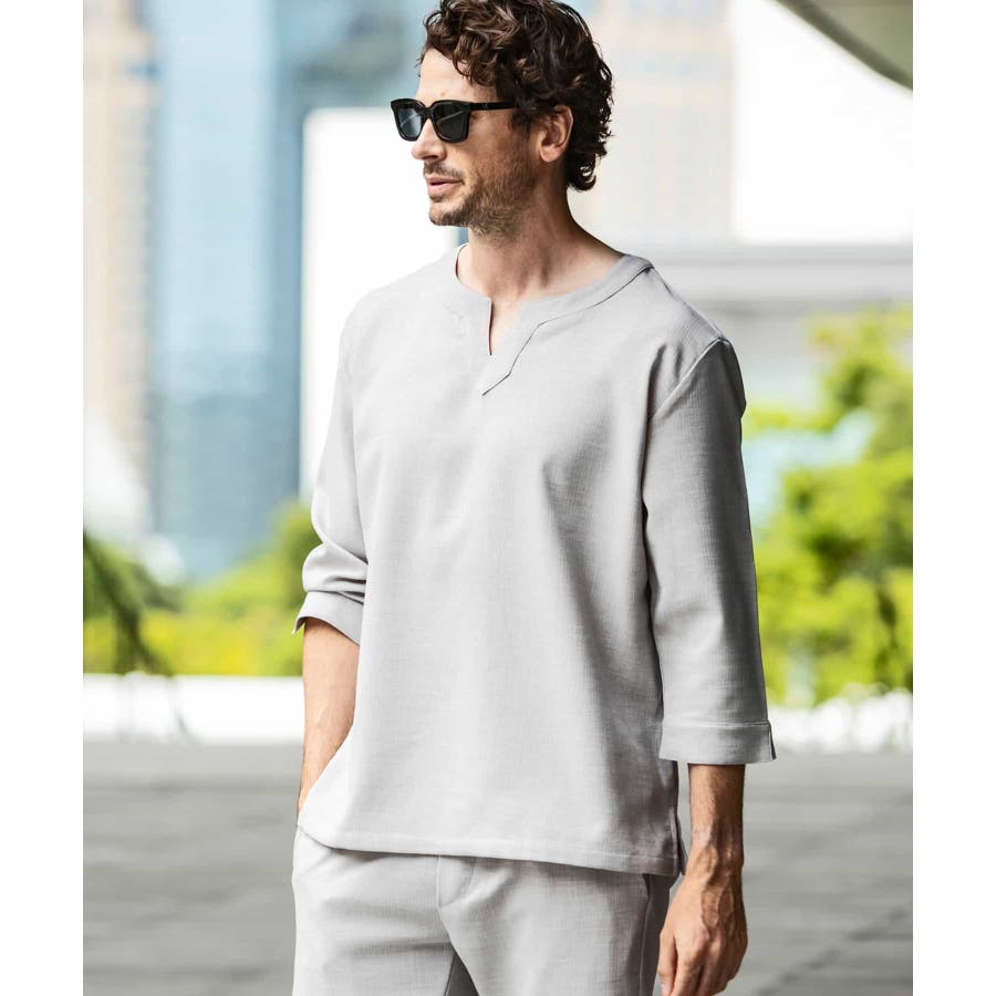 広めに取った身幅や七分袖によりリラックスムード漂うキーネックシャツ。