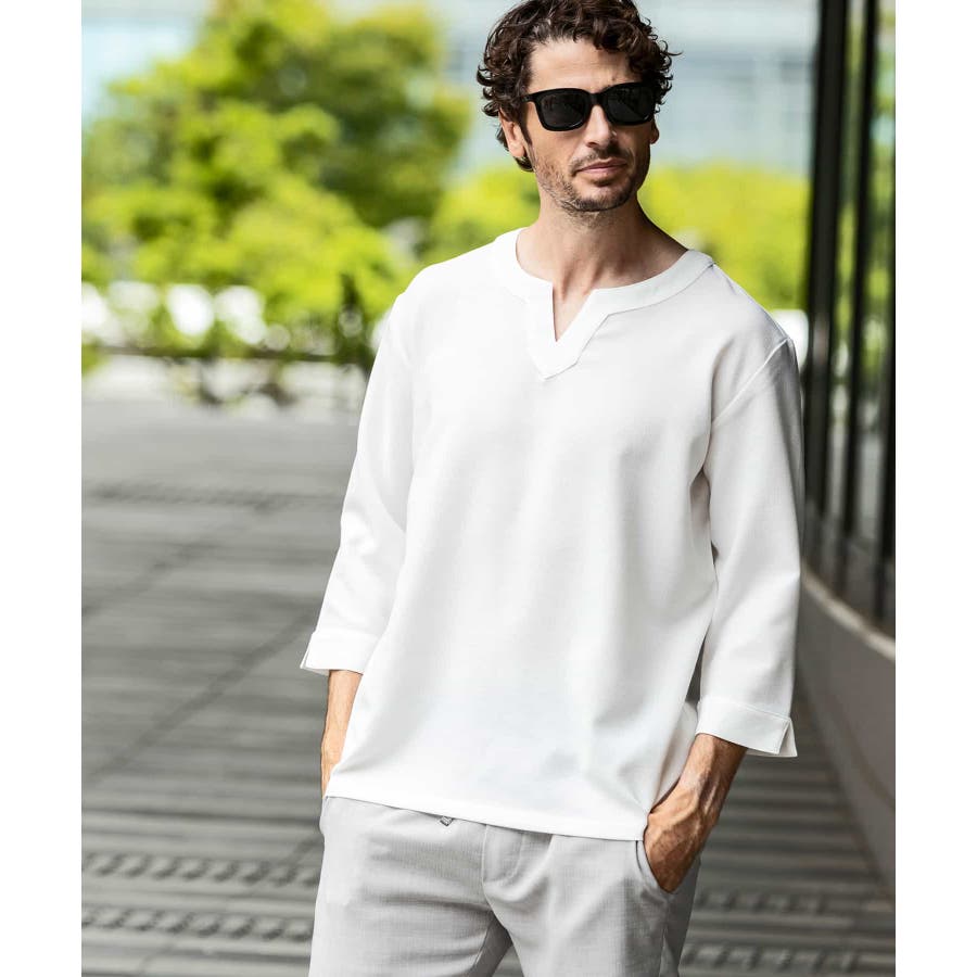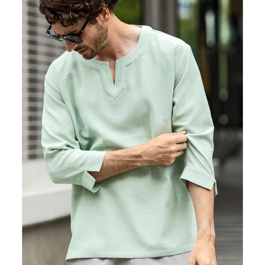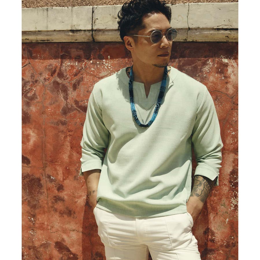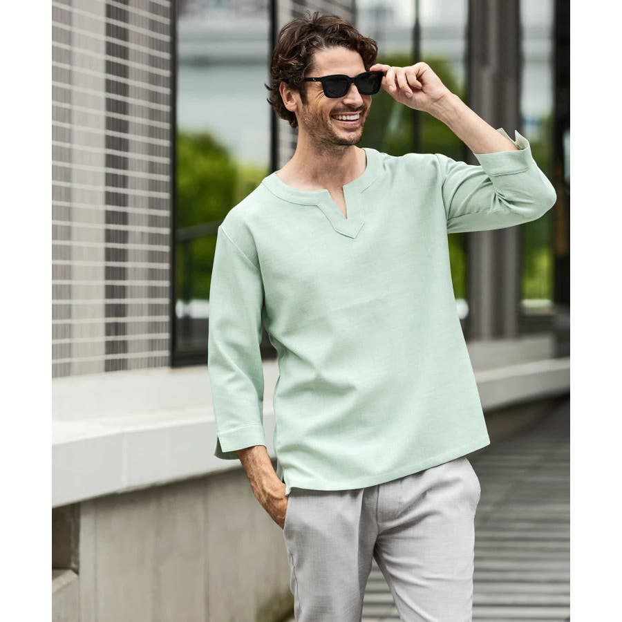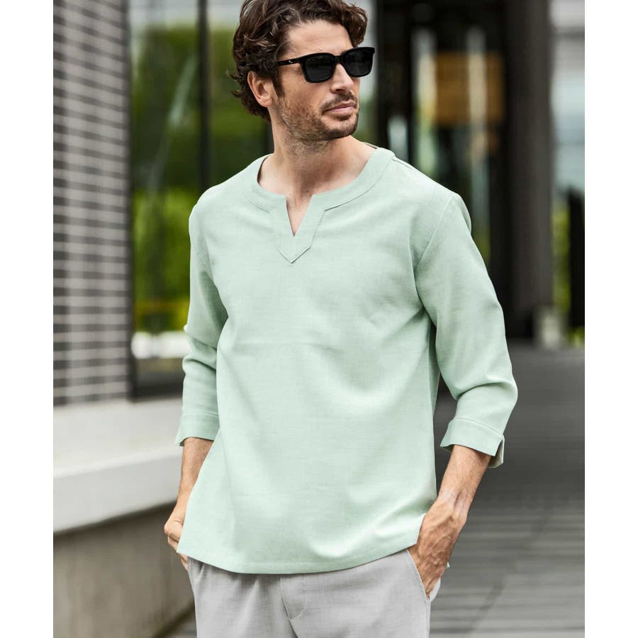 広めに取った身幅や七分袖によりリラックスムード漂うキーネックシャツ。