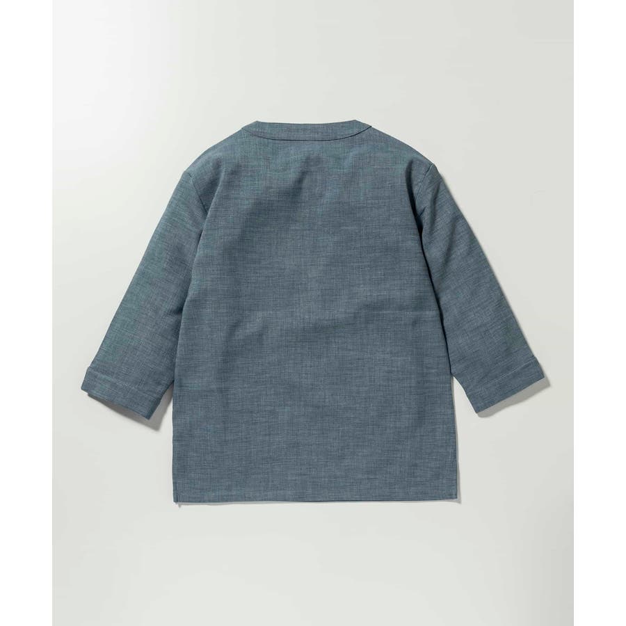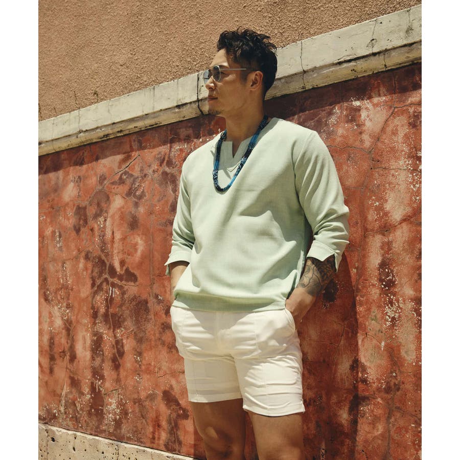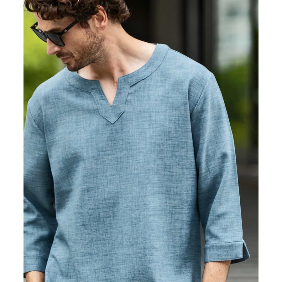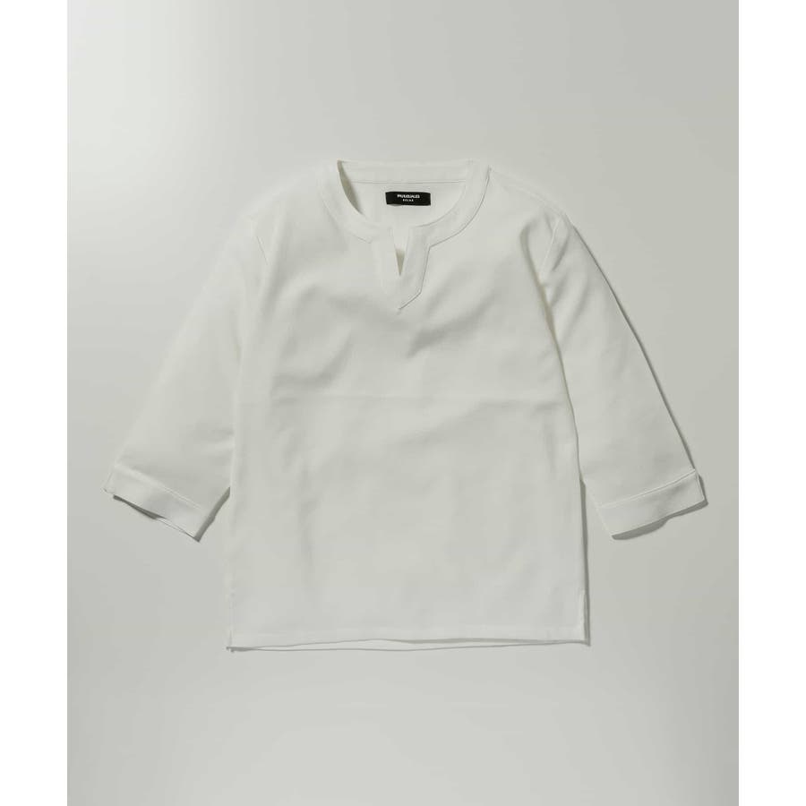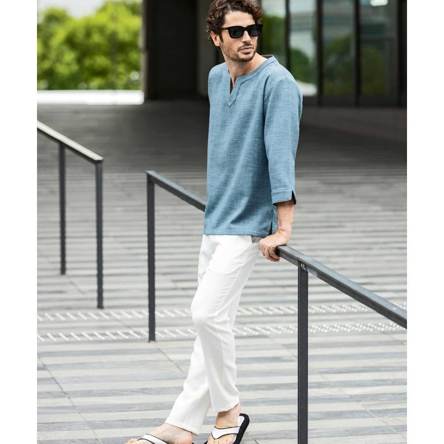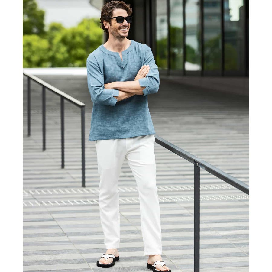 広めに取った身幅や七分袖によりリラックスムード漂うキーネックシャツ。