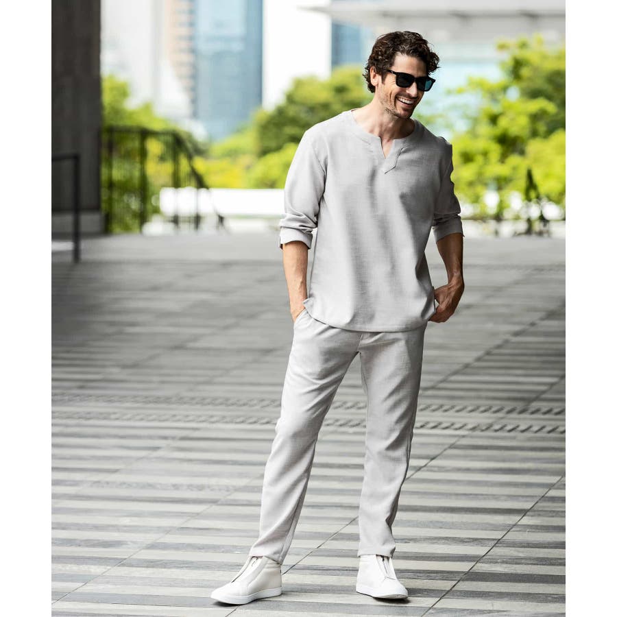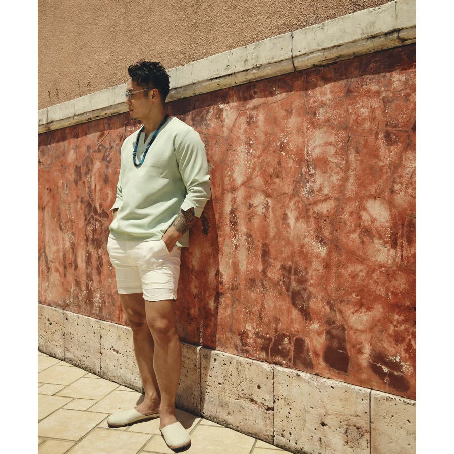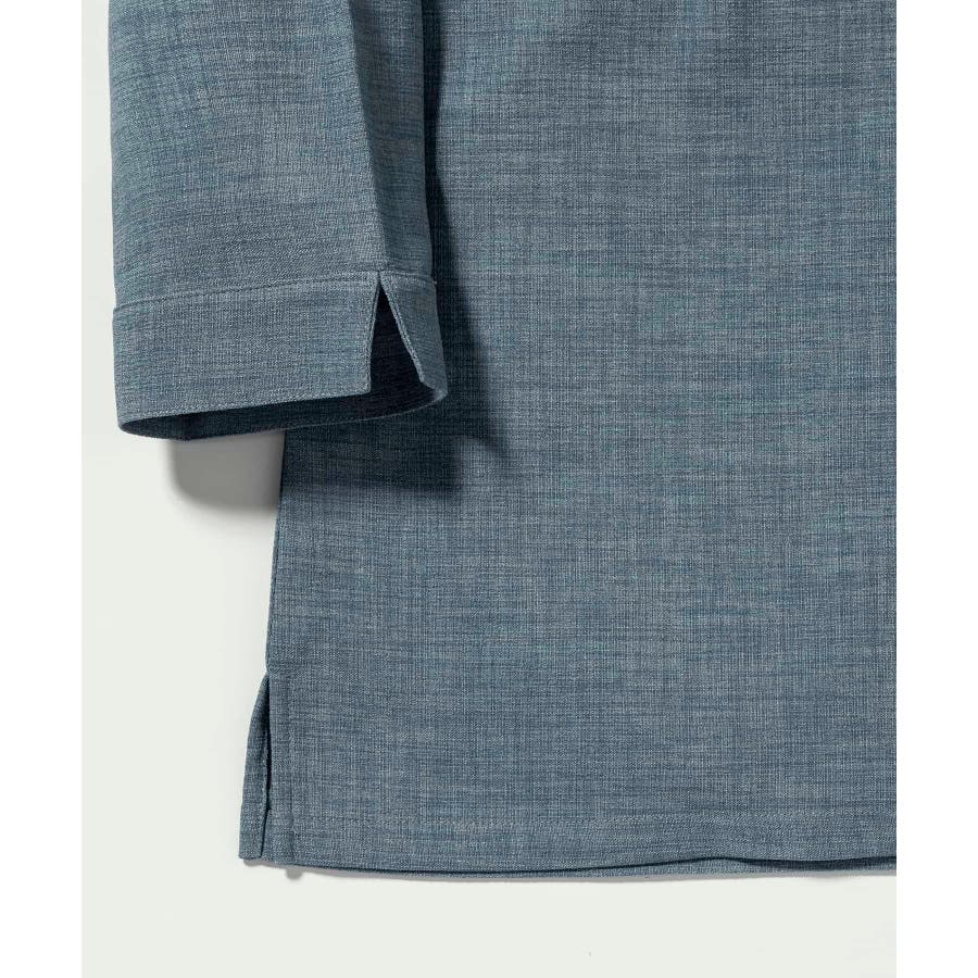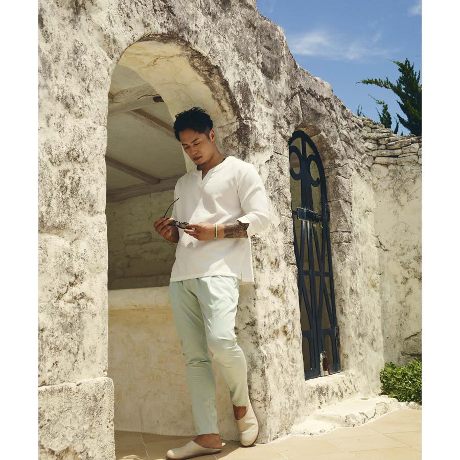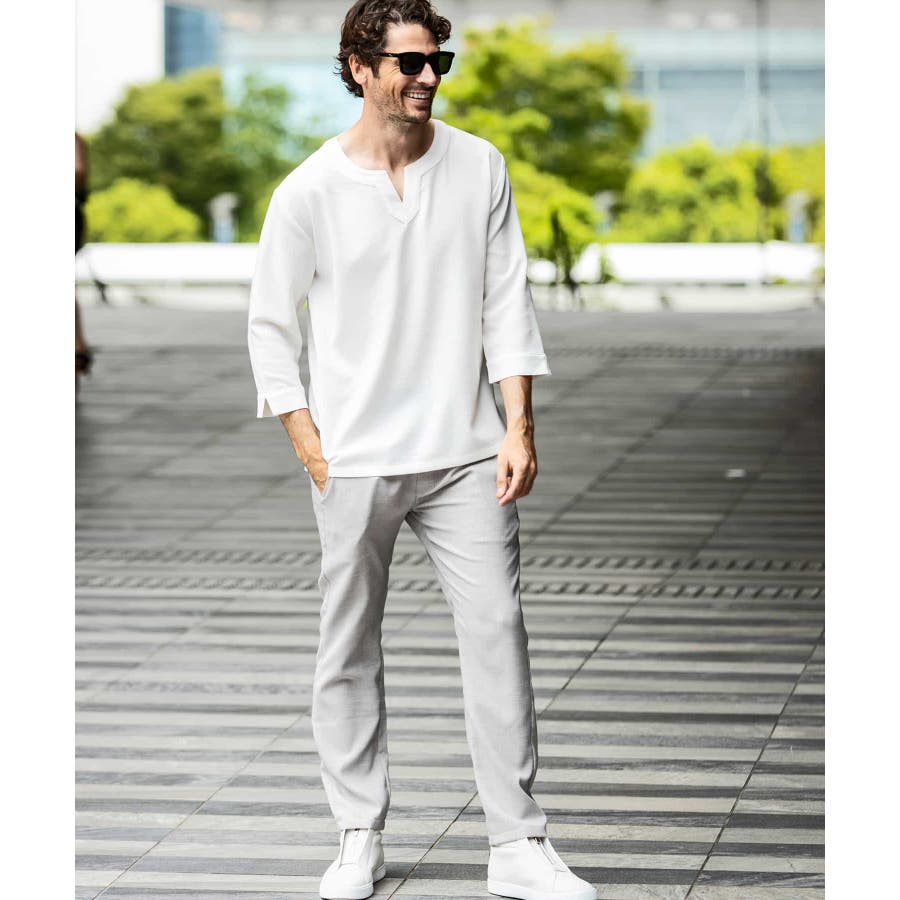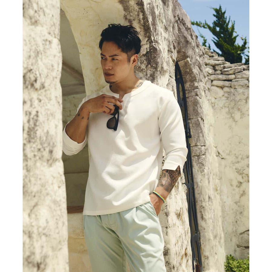 広めに取った身幅や七分袖によりリラックスムード漂うキーネックシャツ。