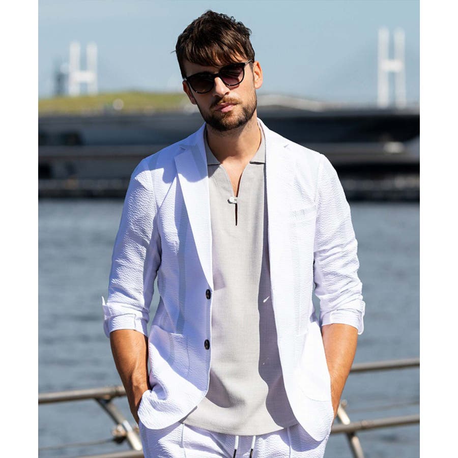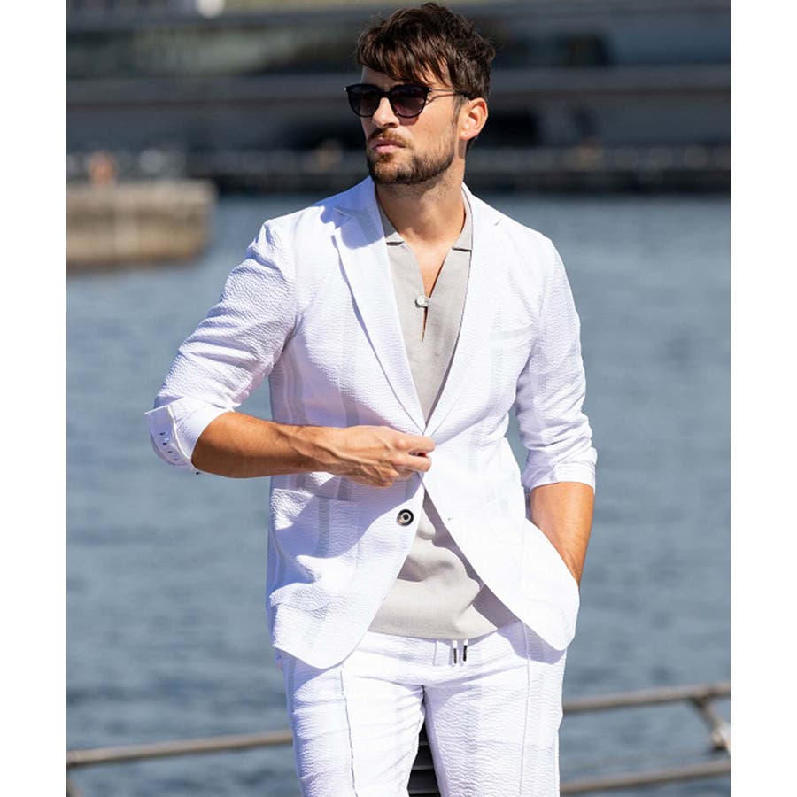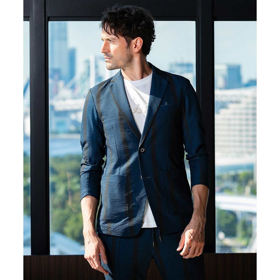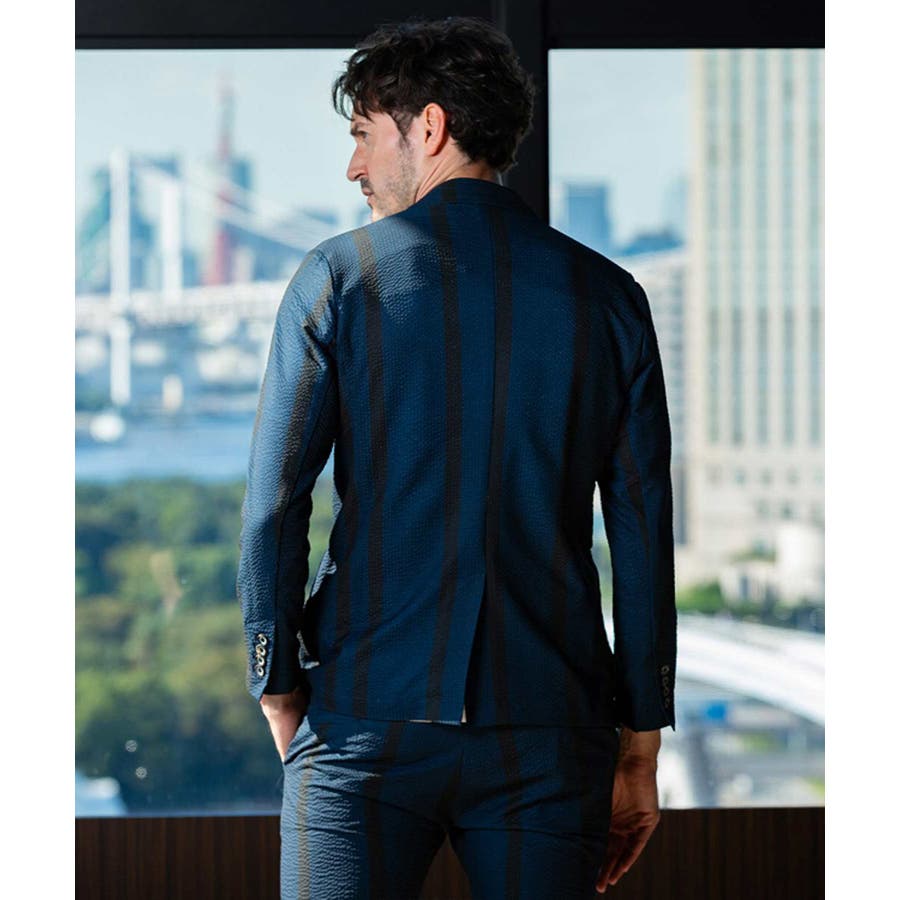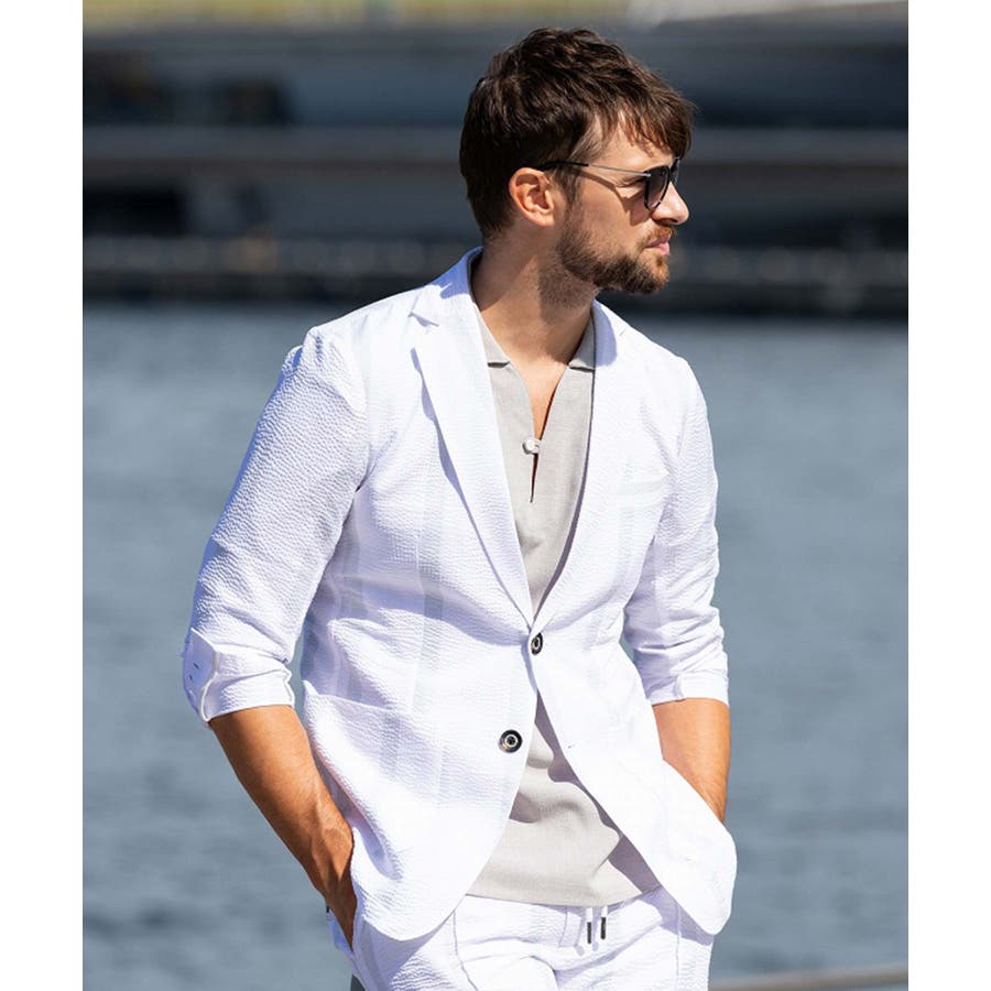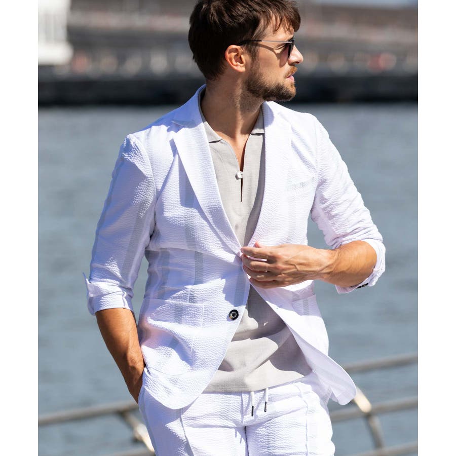 ストレッチ性のあるシアサッカー生地で仕立てたテーラードジャケット。