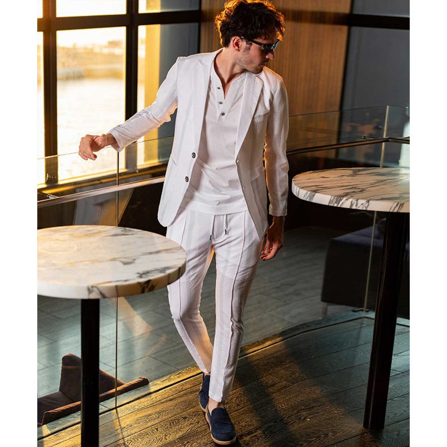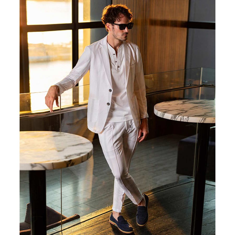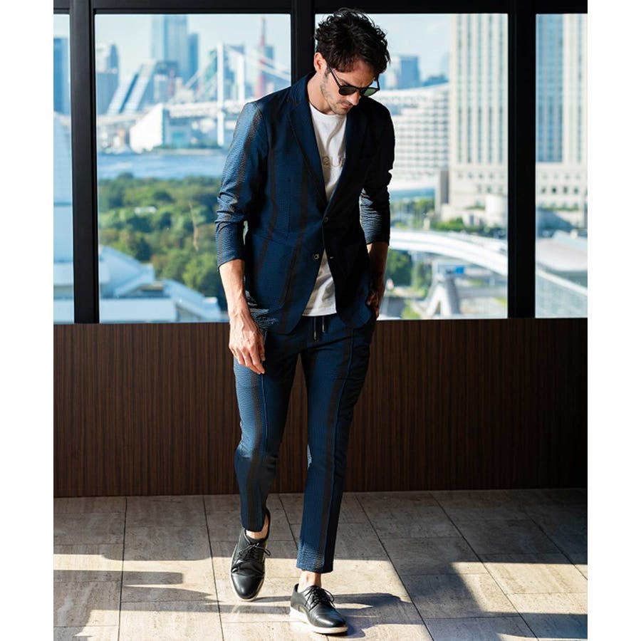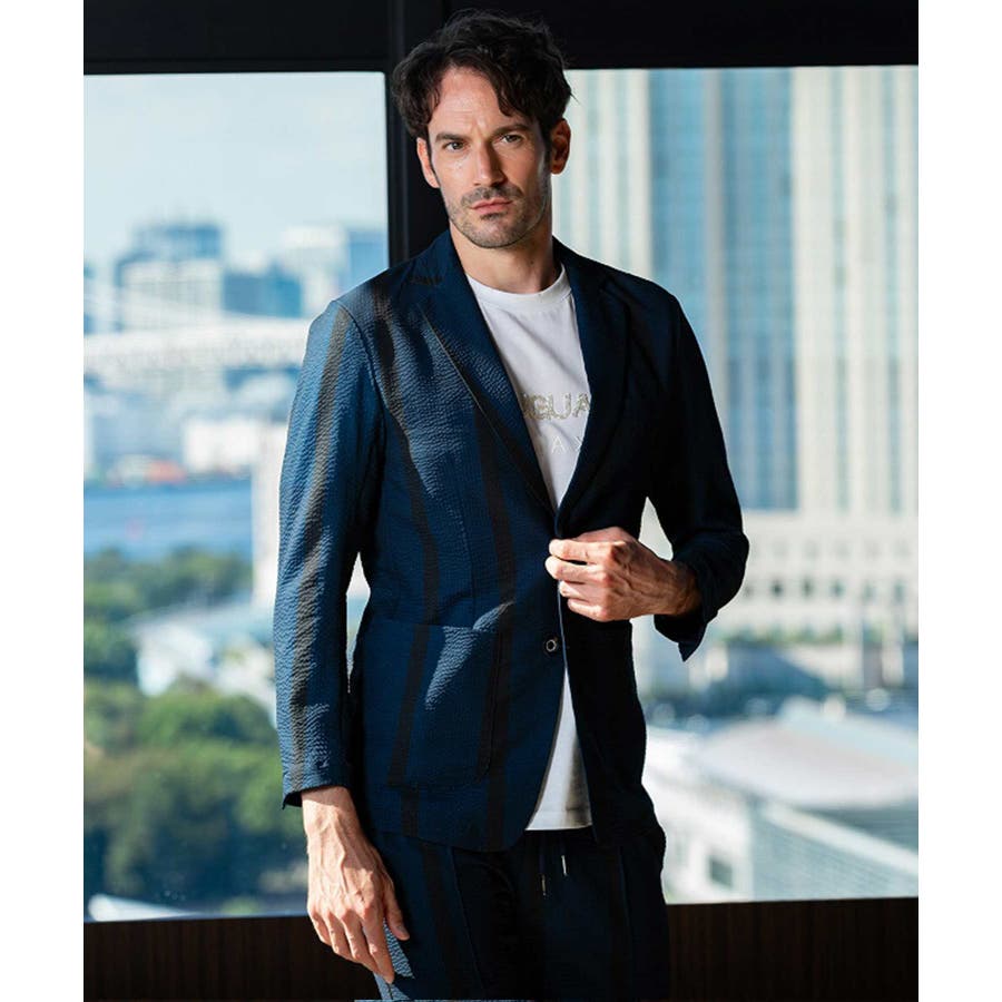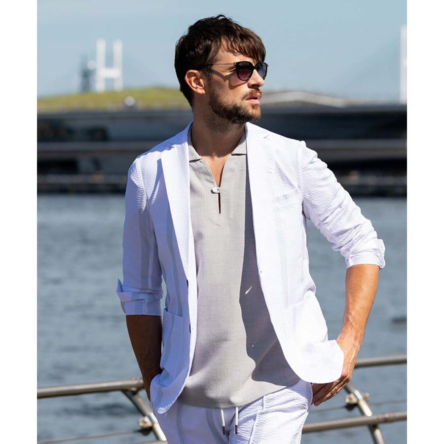 ストレッチ性のあるシアサッカー生地で仕立てたテーラードジャケット。
