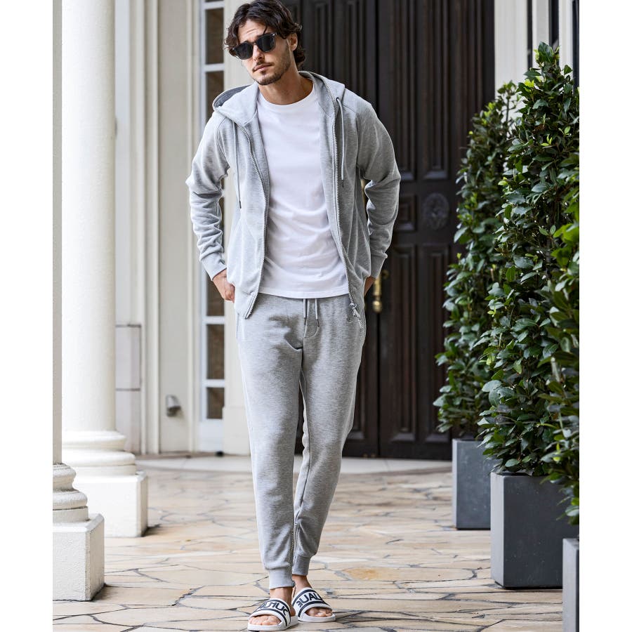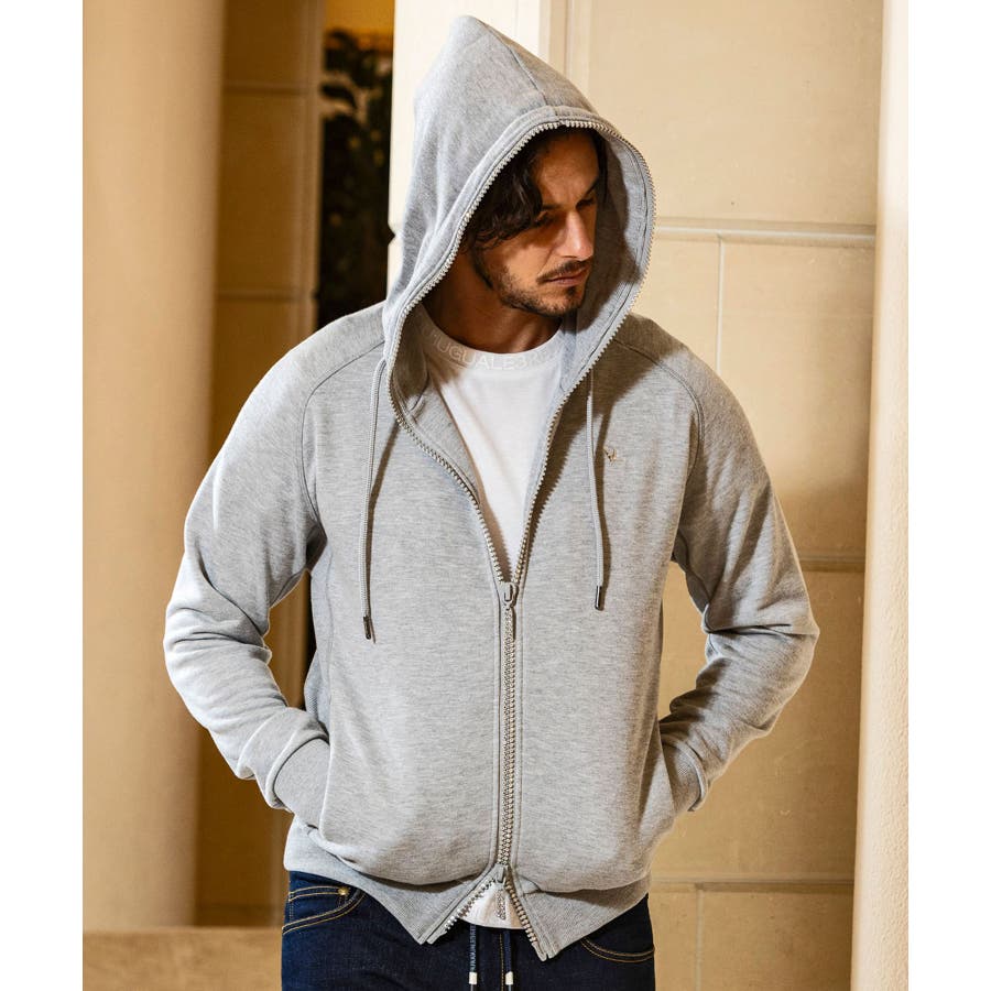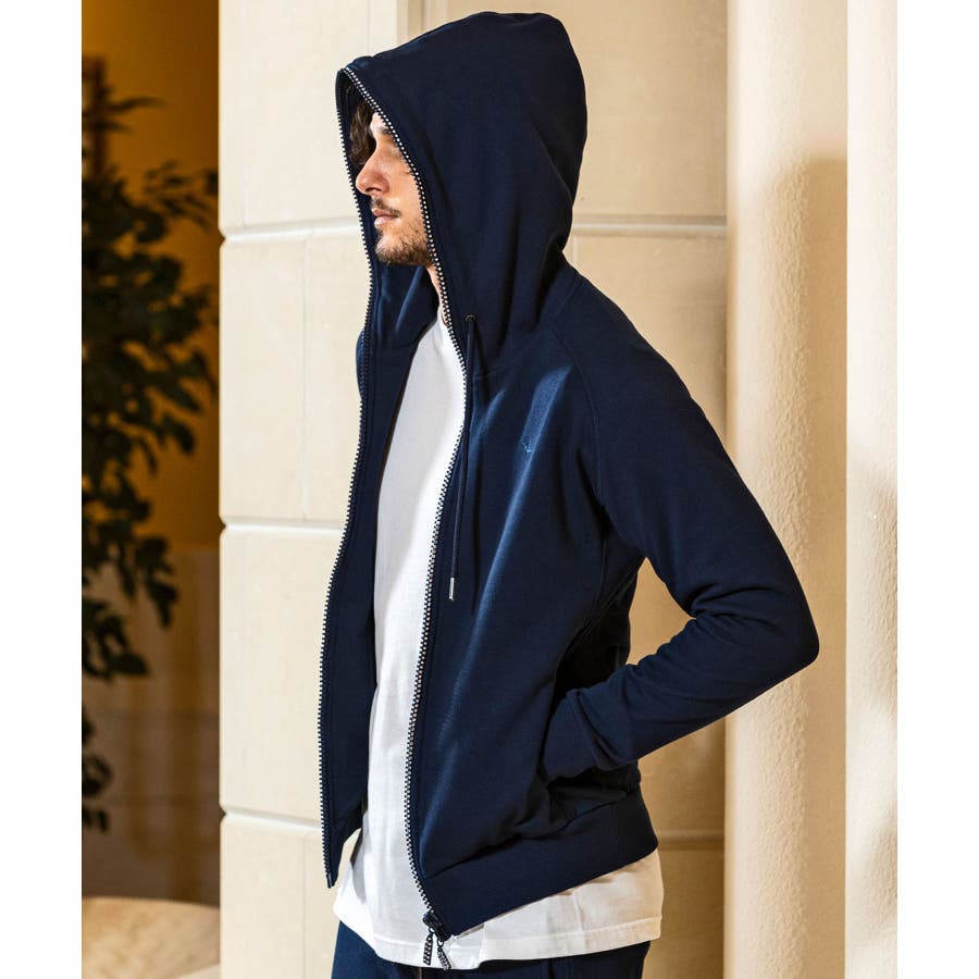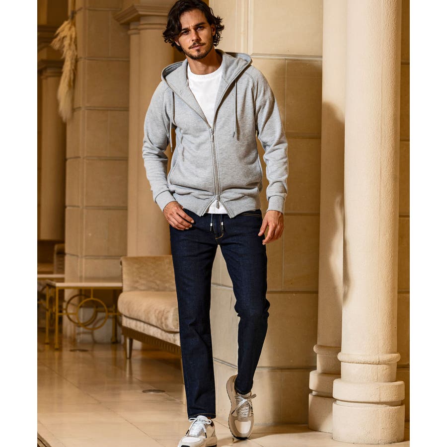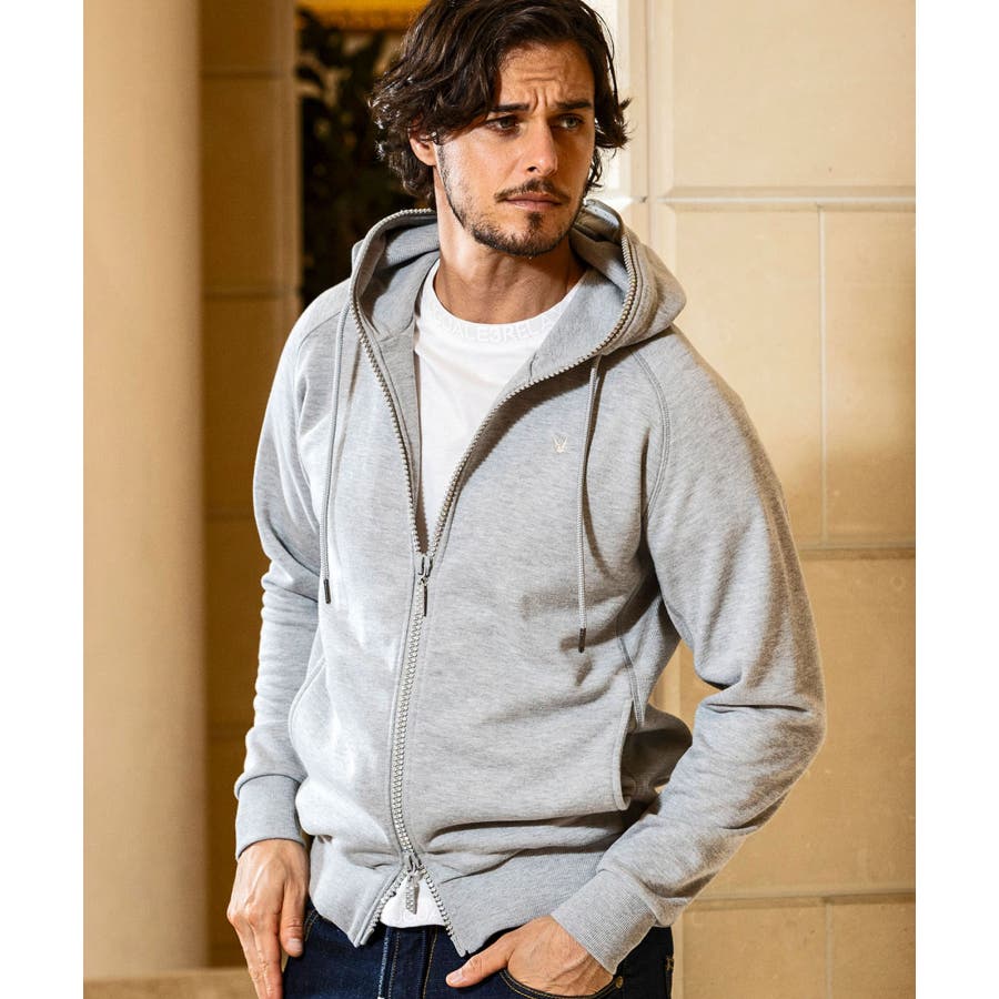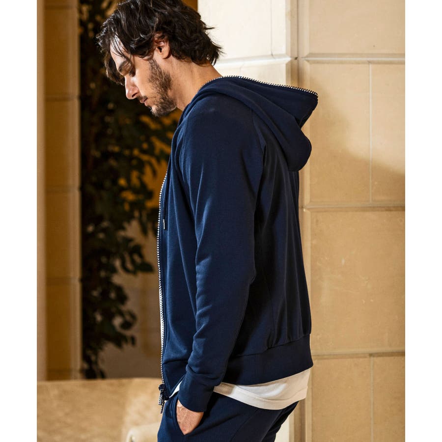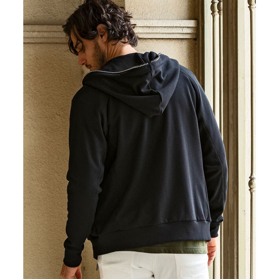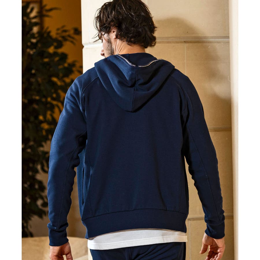 柔らかなスウェット素材で仕立てたジップアップパーカー。
