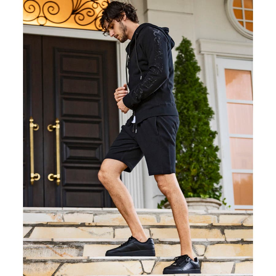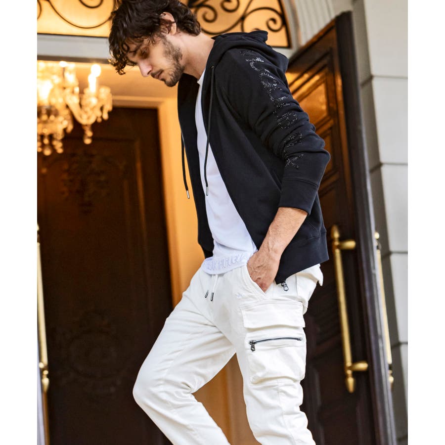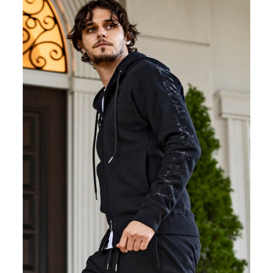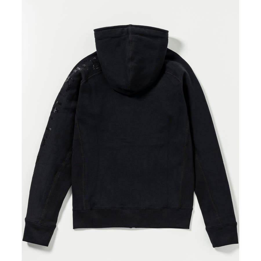 左袖に大胆かつ曲線的にラインストーンロゴを配置しており、上品なきらめきを纏っています。