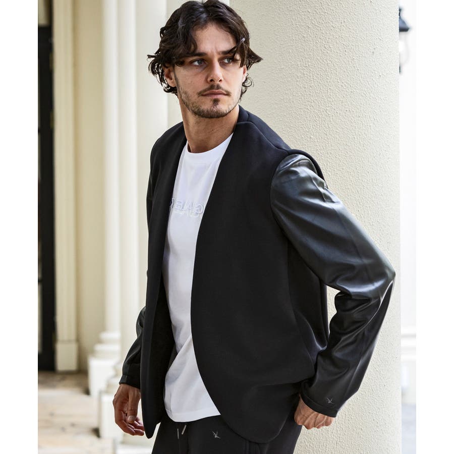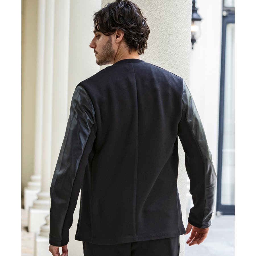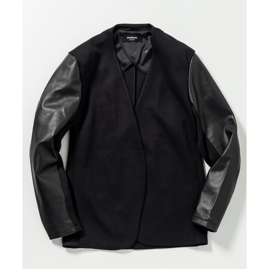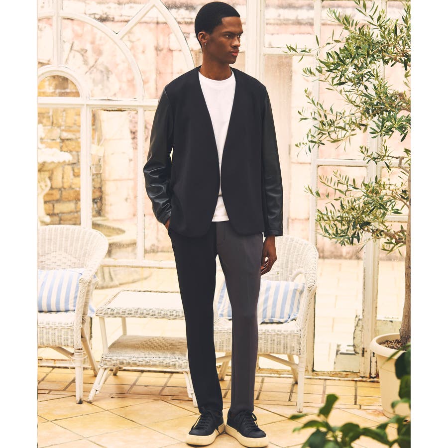 トレンドの襟無しジャケットはかっちりしすぎない大人の余裕を見せ、