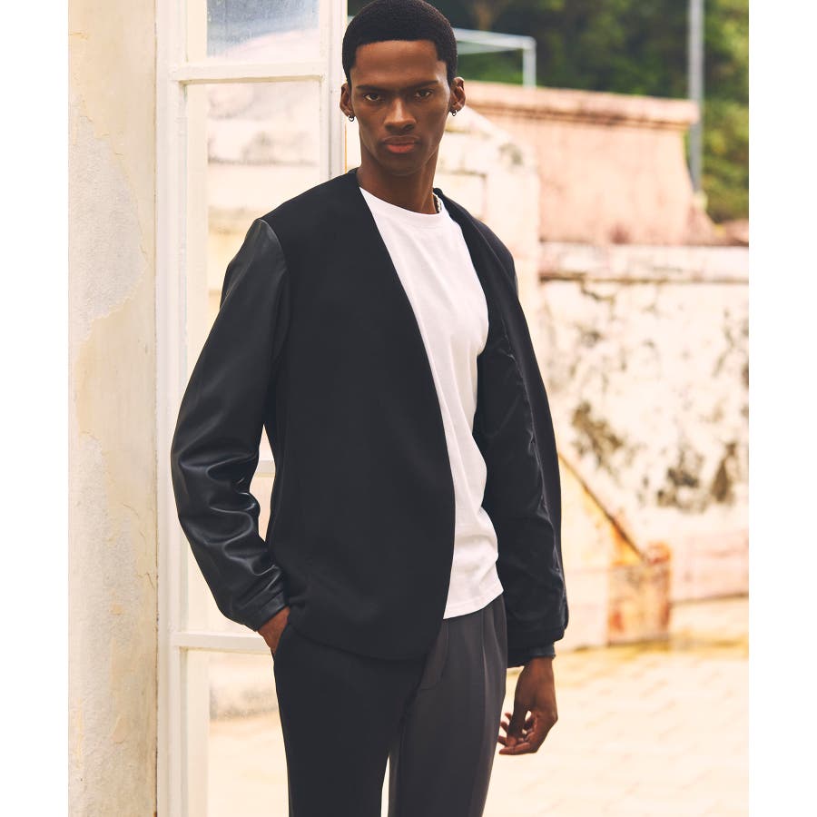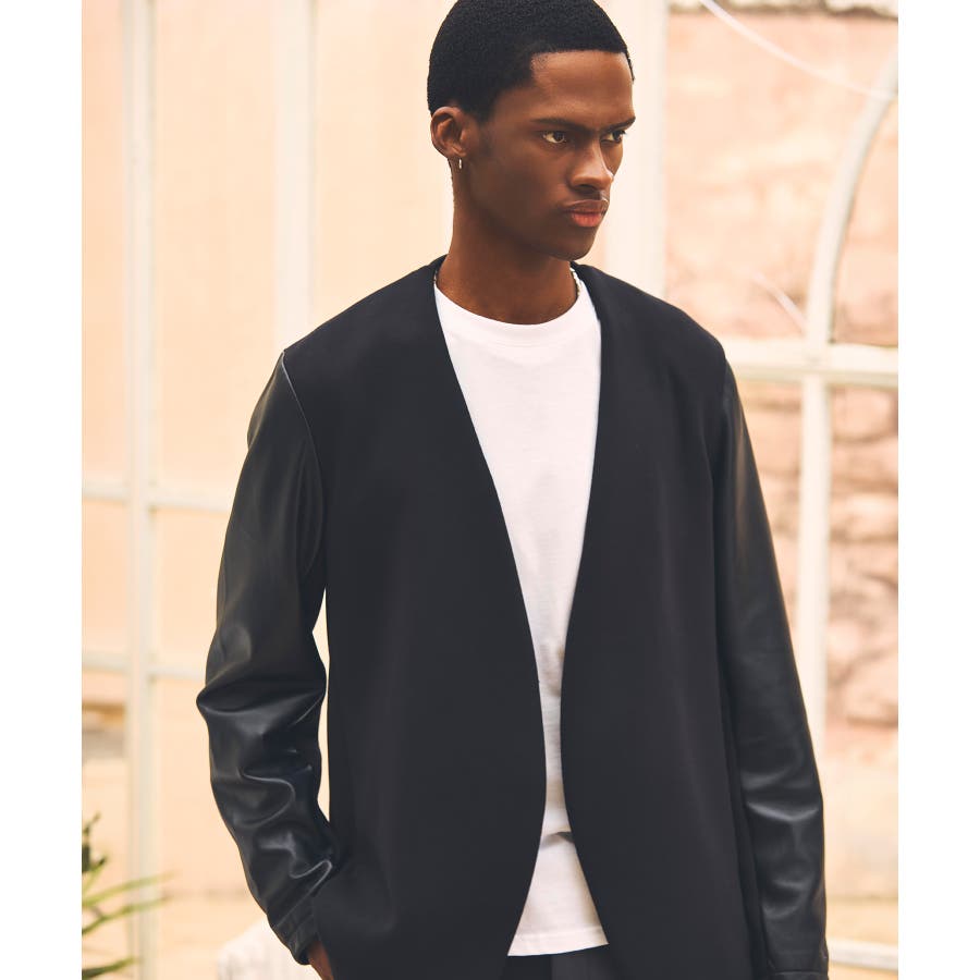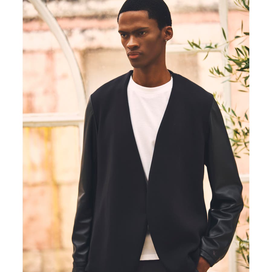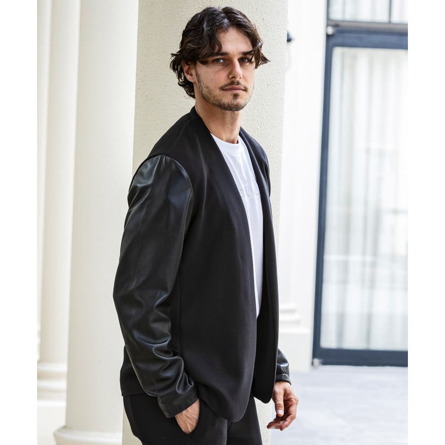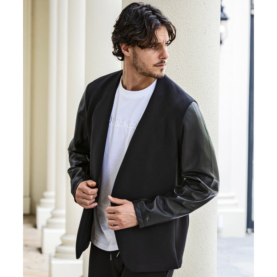 トレンドの襟無しジャケットはかっちりしすぎない大人の余裕を見せ、
