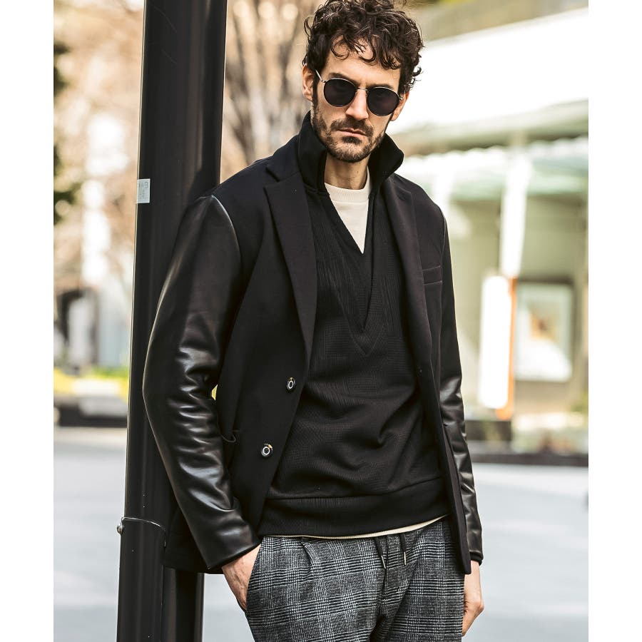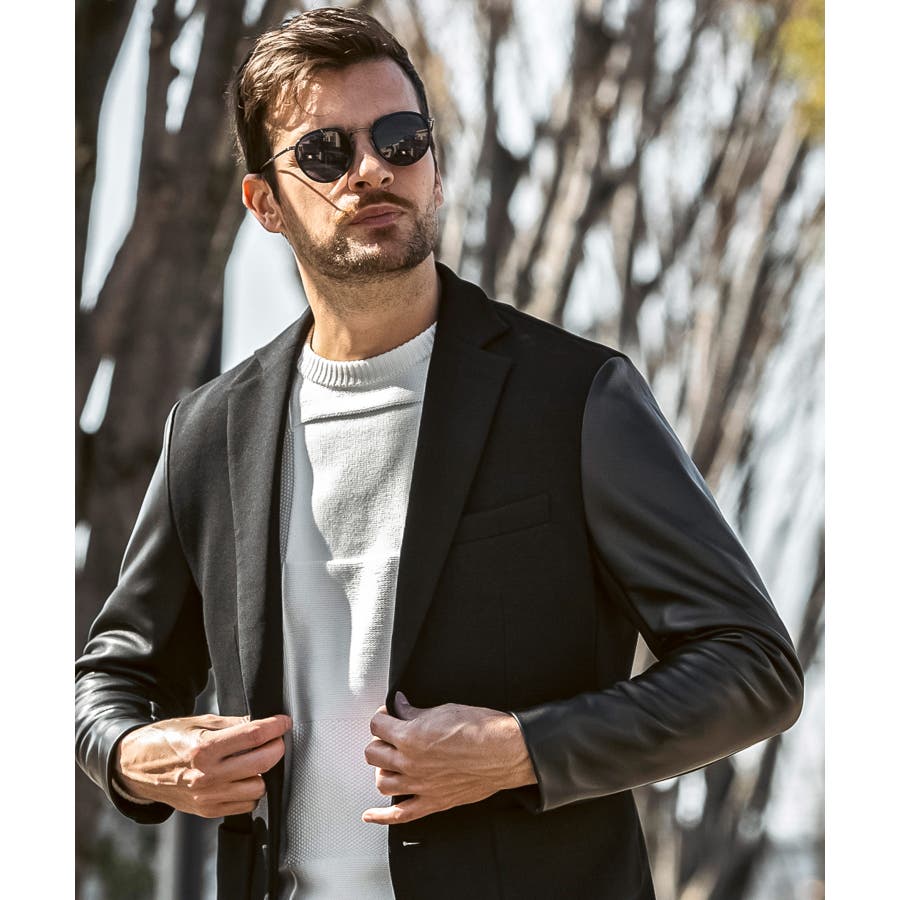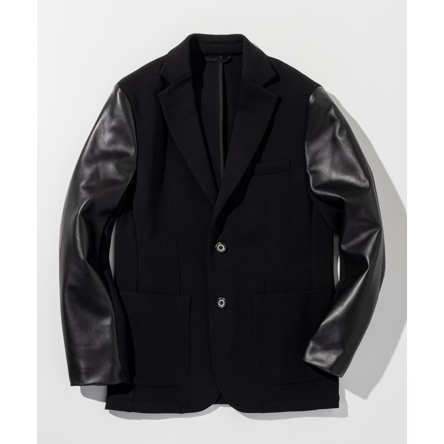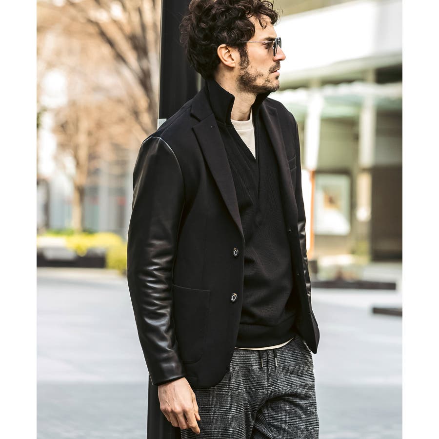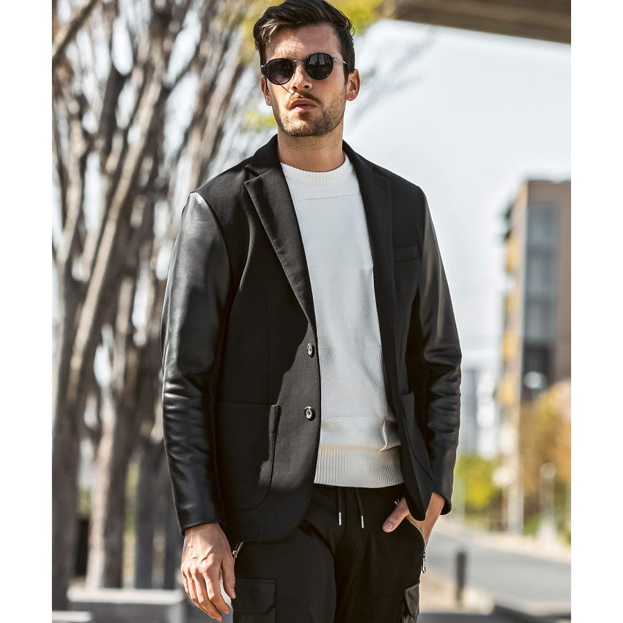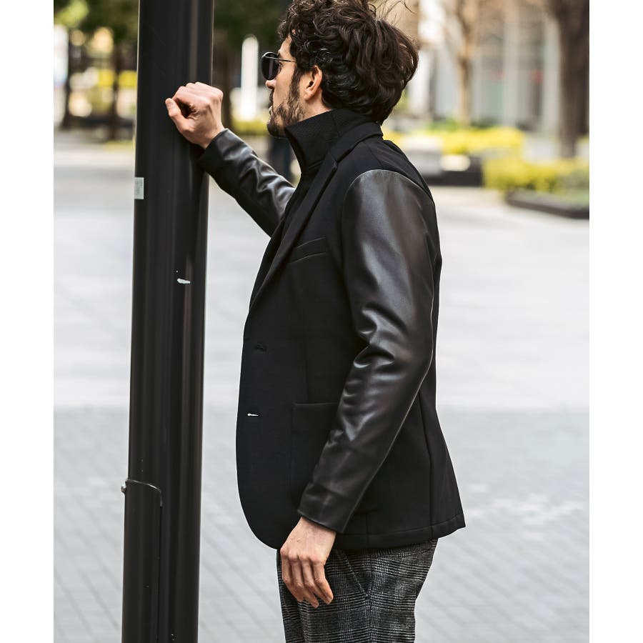 袖部分にレザーを差し込んだ異素材コンビジャケット。