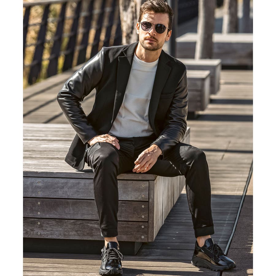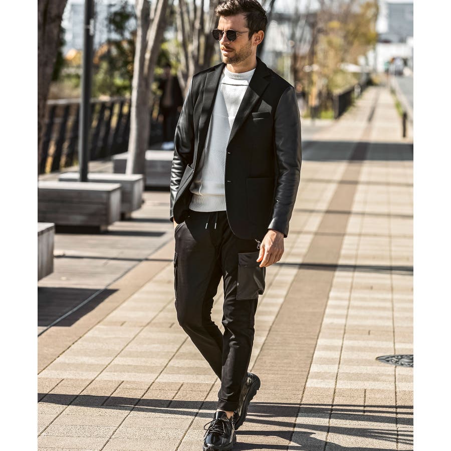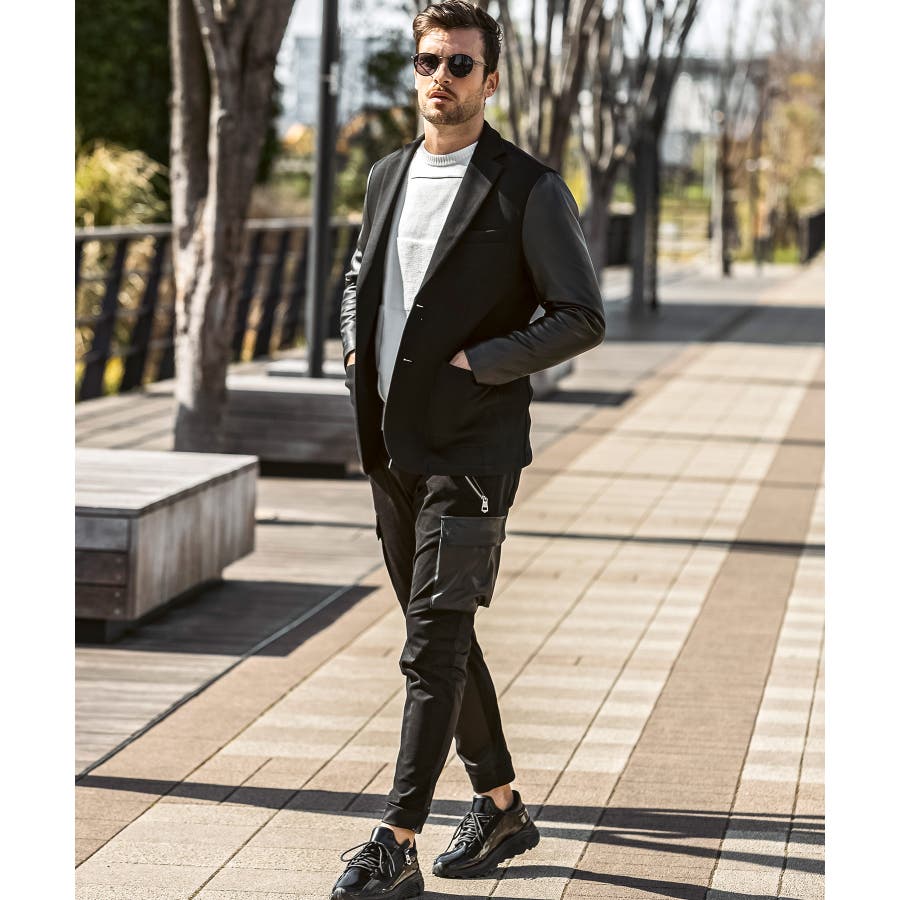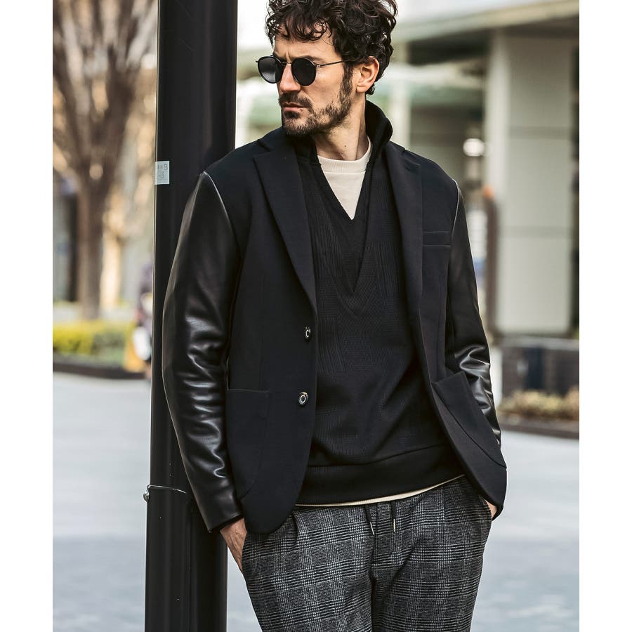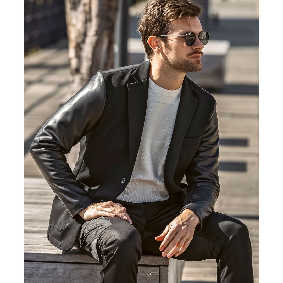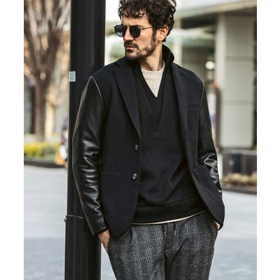 袖部分にレザーを差し込んだ異素材コンビジャケット。