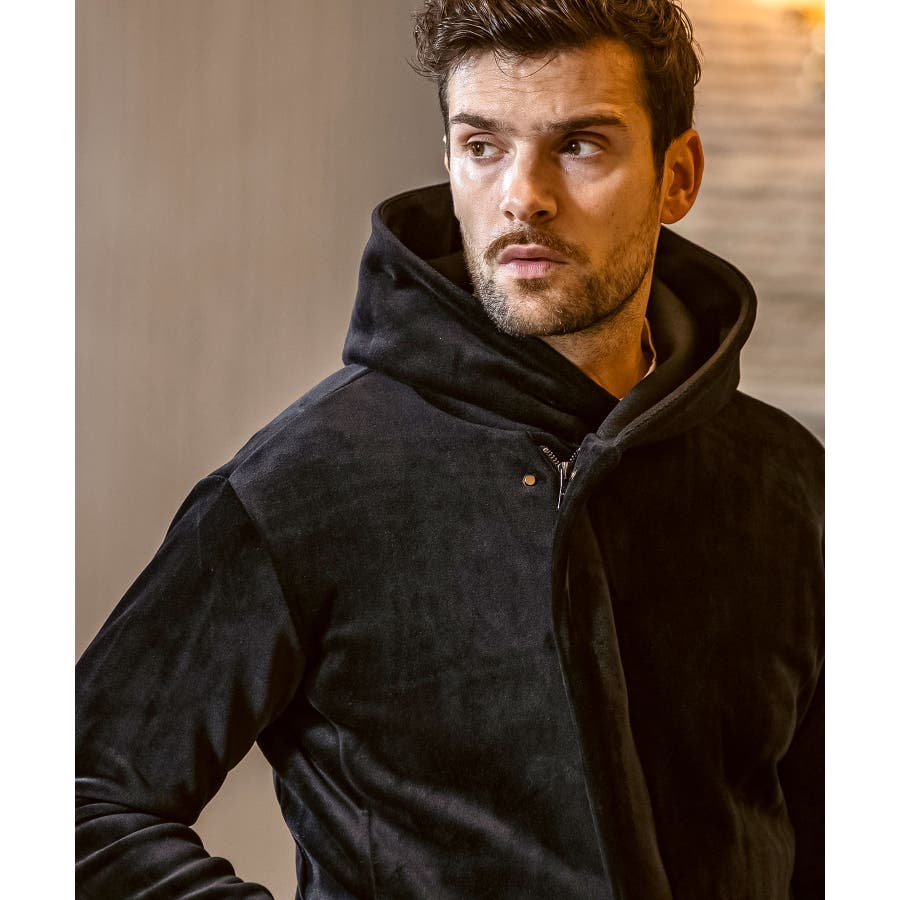 ラップコートを想起させる優雅なフロントの合わせが際立つジップフーディー。