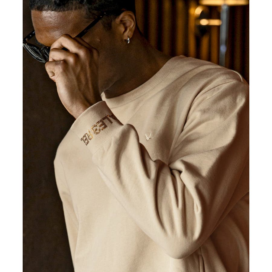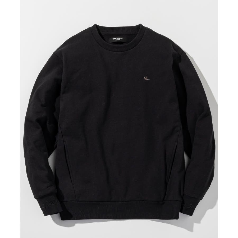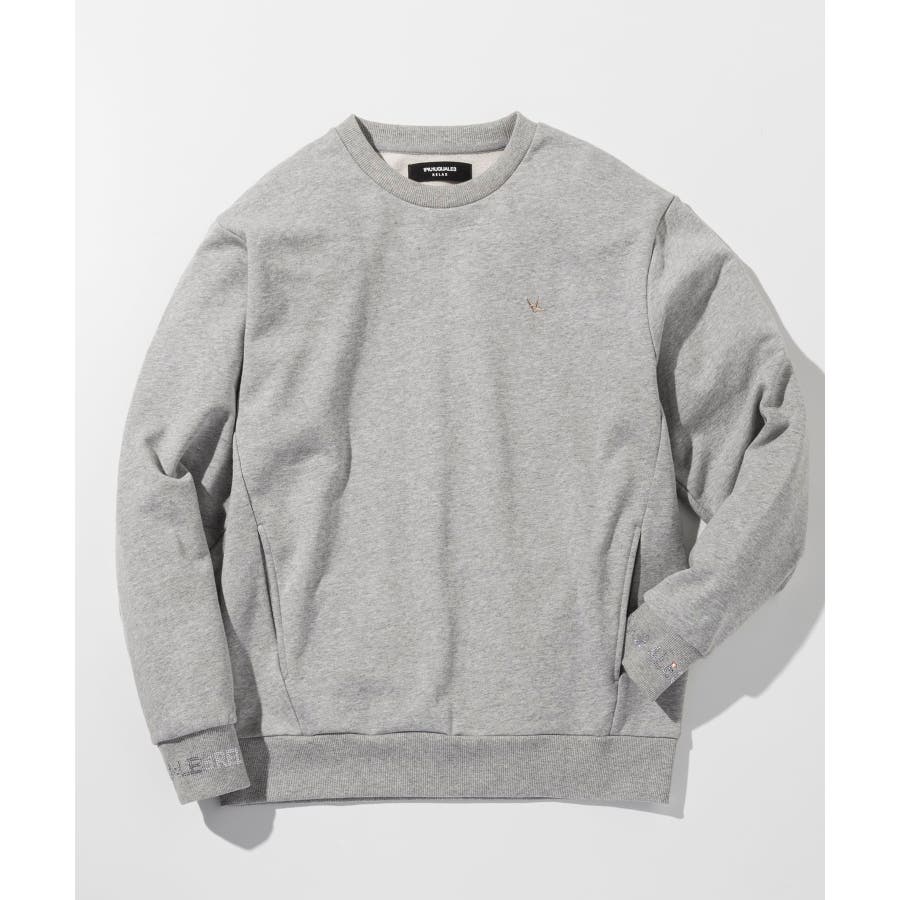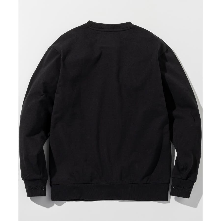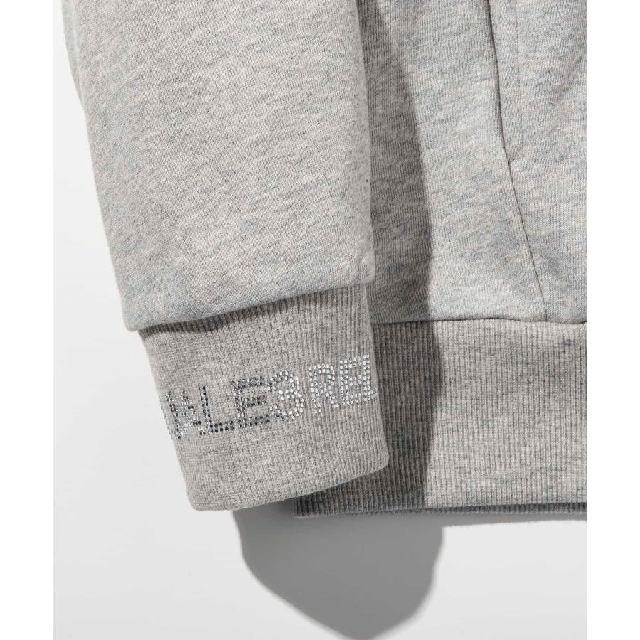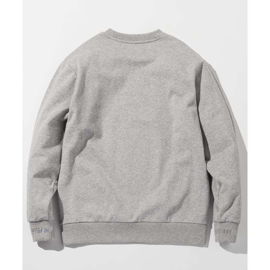 袖口にブランドロゴをラインストーンでデザインしたクルーネックトレーナー。