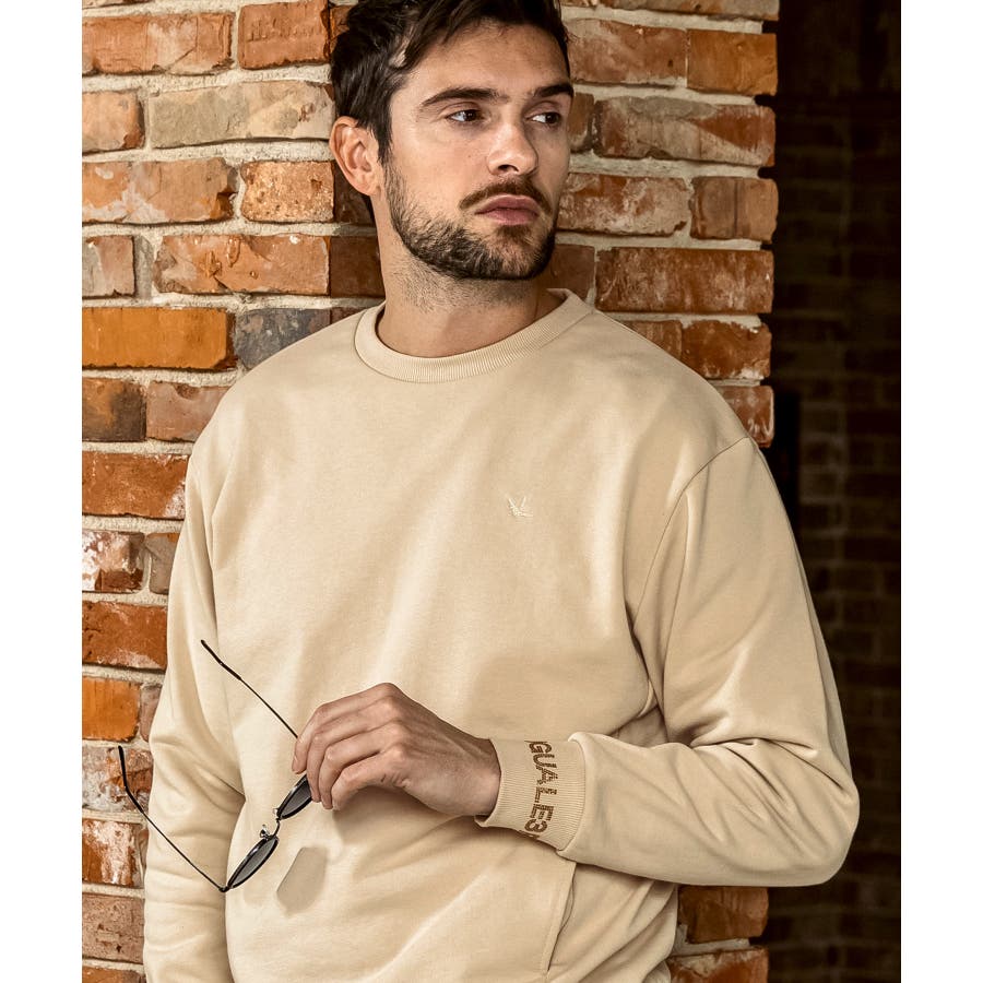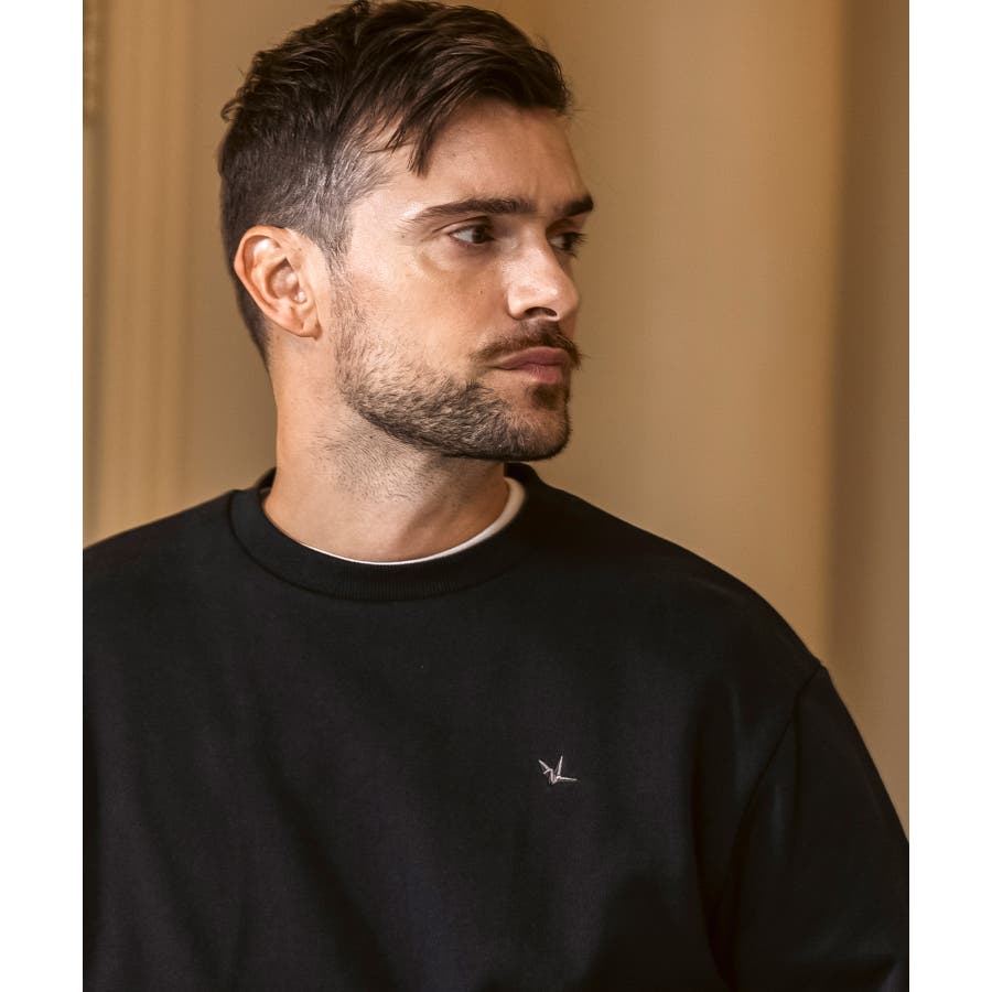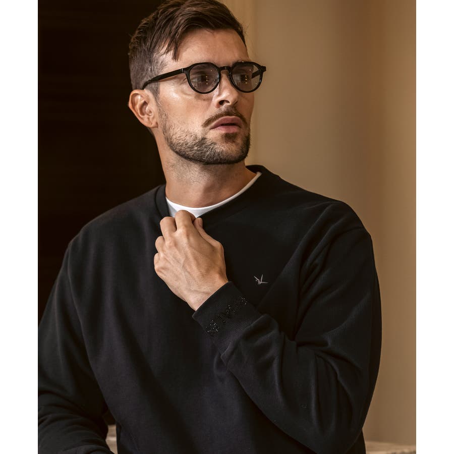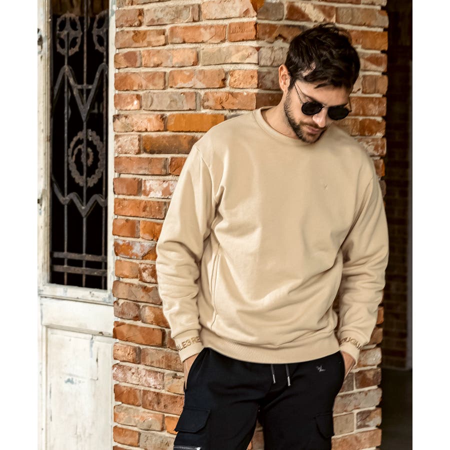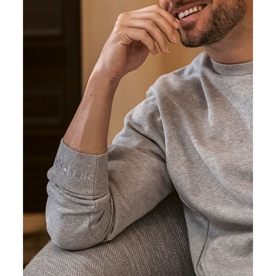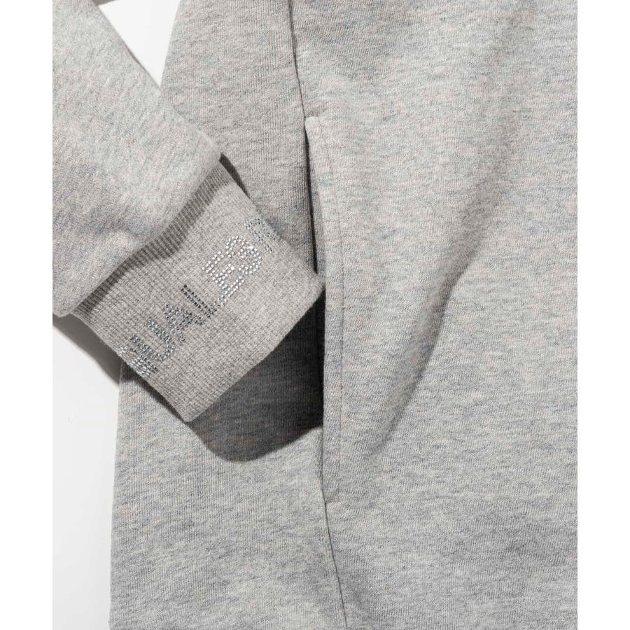 袖口にブランドロゴをラインストーンでデザインしたクルーネックトレーナー。