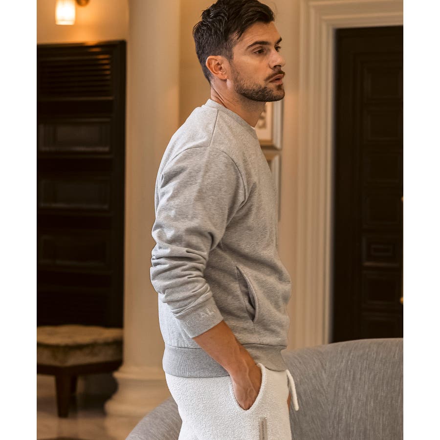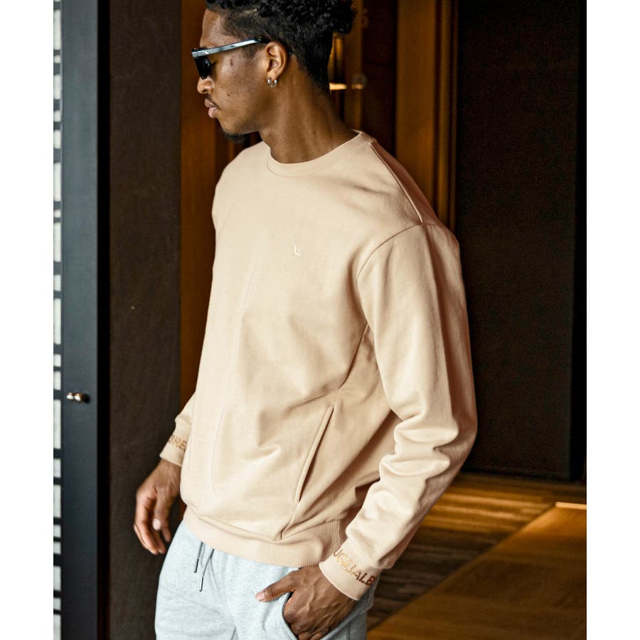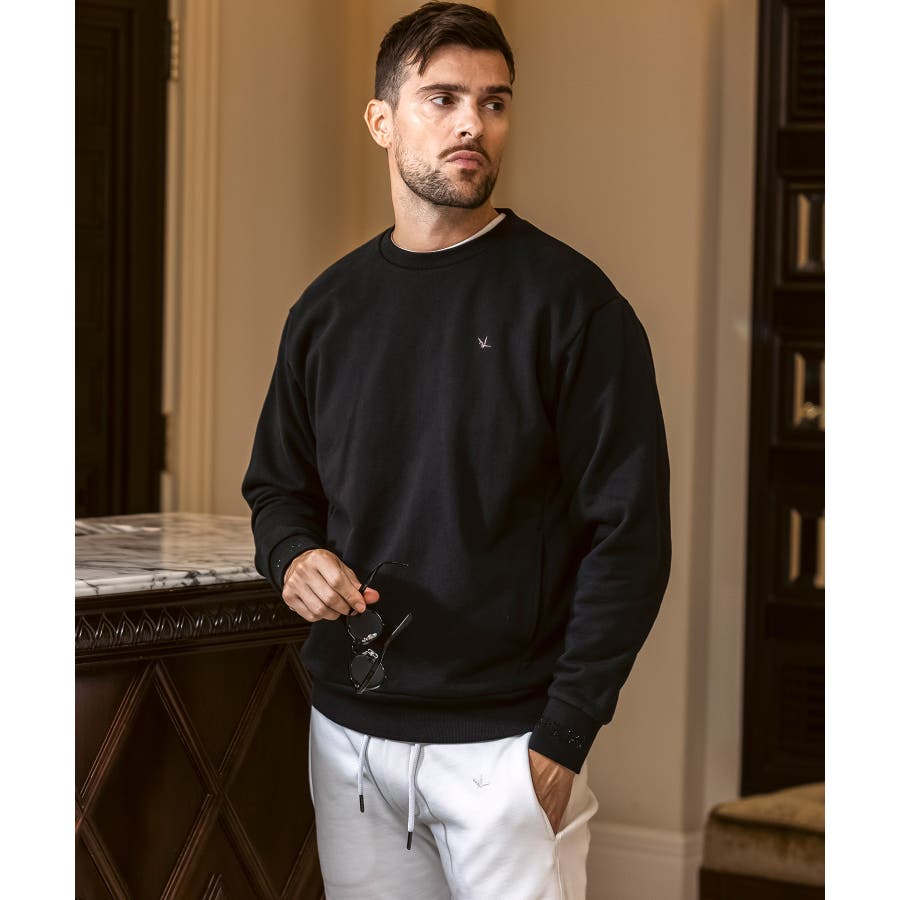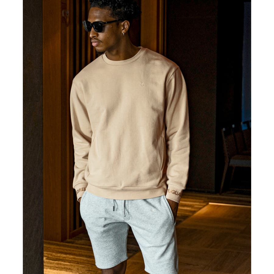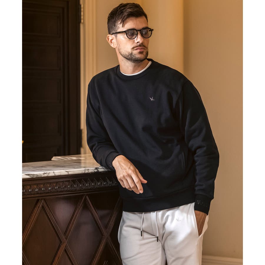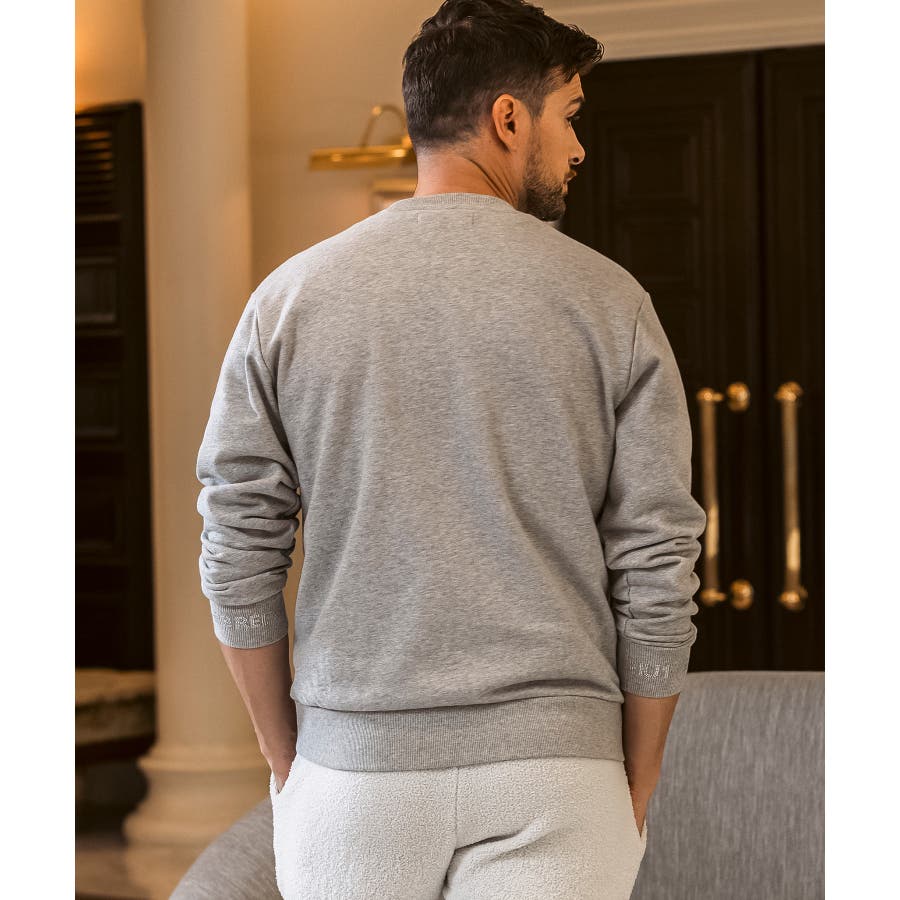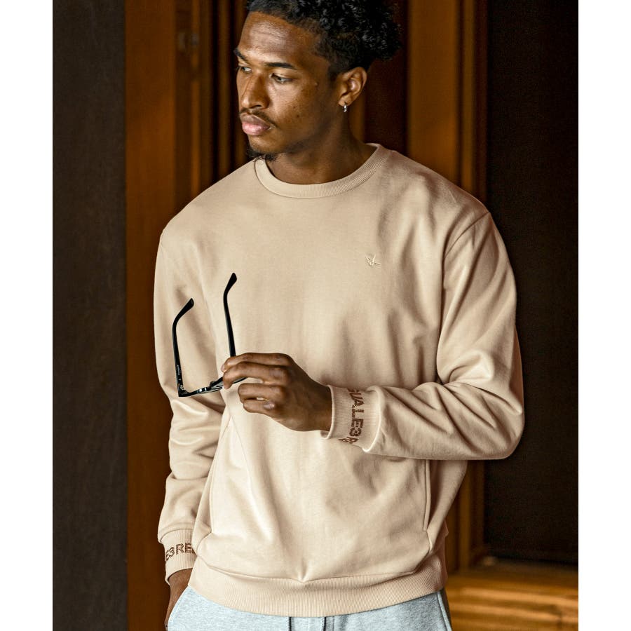 袖口にブランドロゴをラインストーンでデザインしたクルーネックトレーナー。