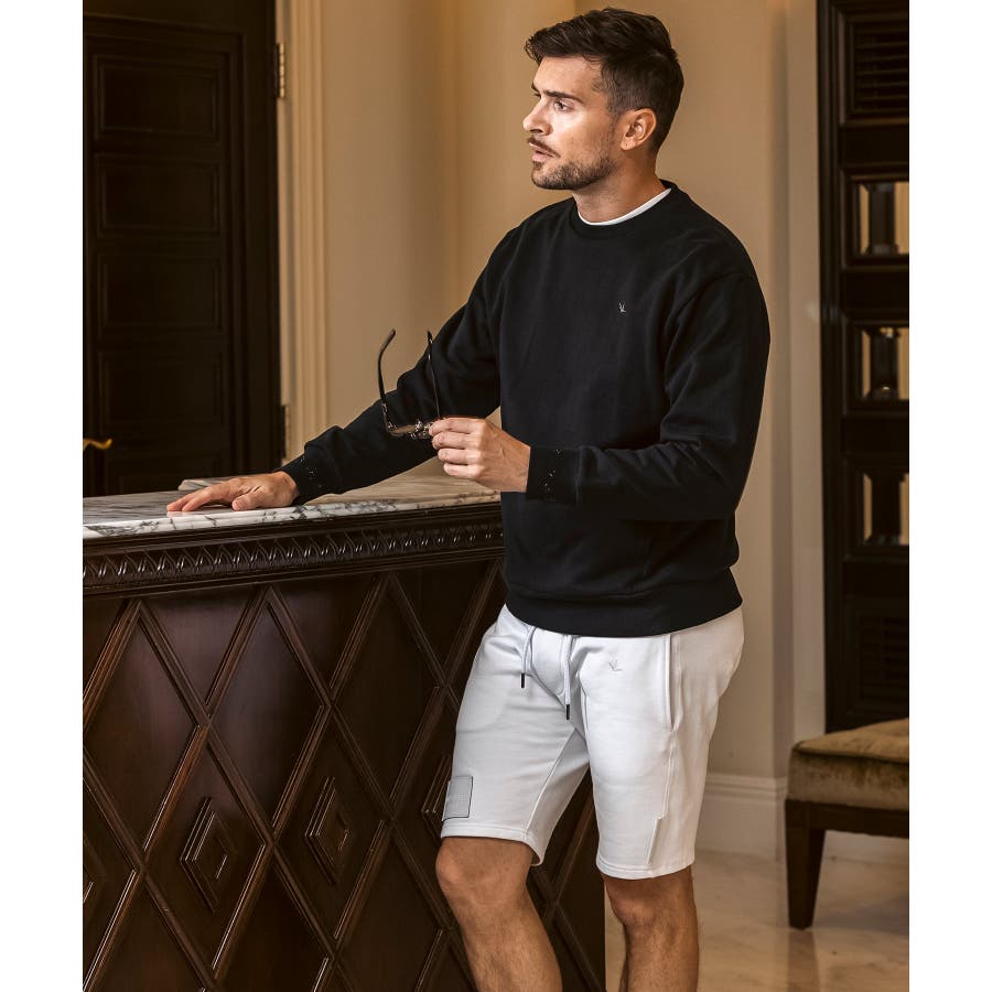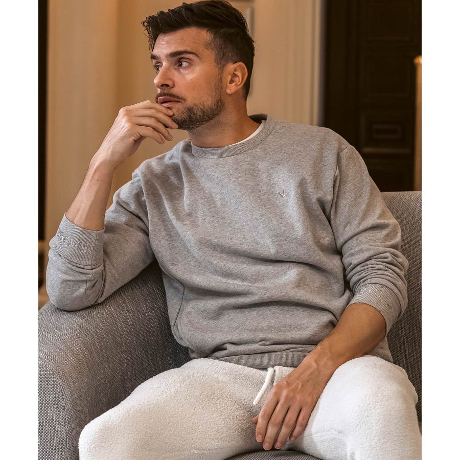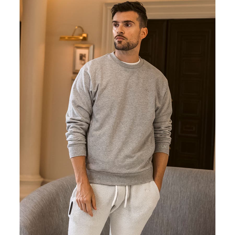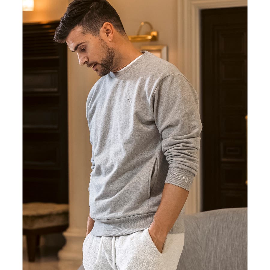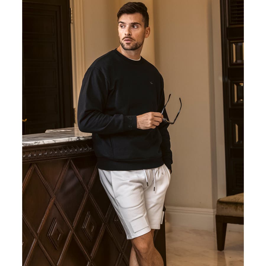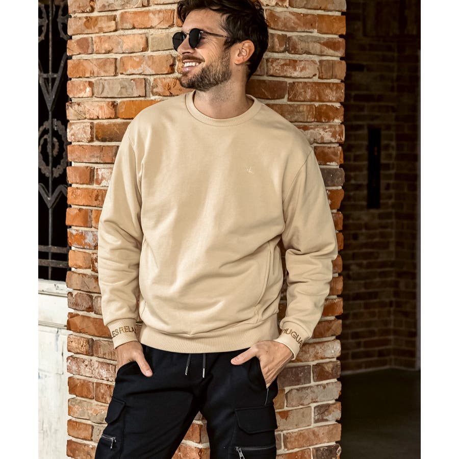 袖口にブランドロゴをラインストーンでデザインしたクルーネックトレーナー。