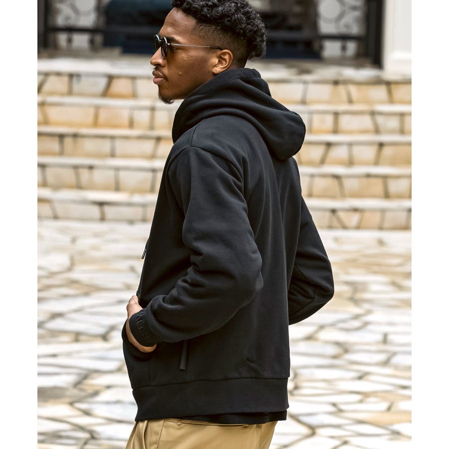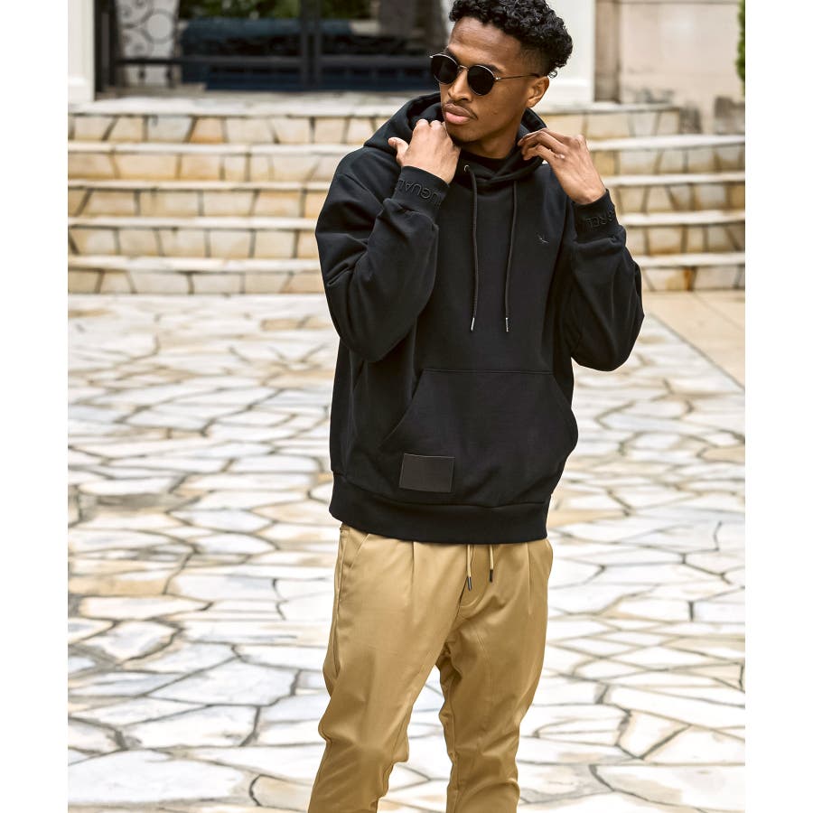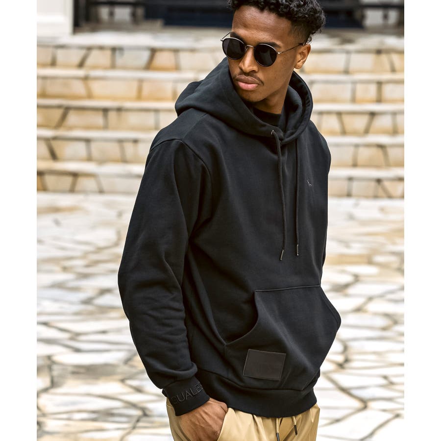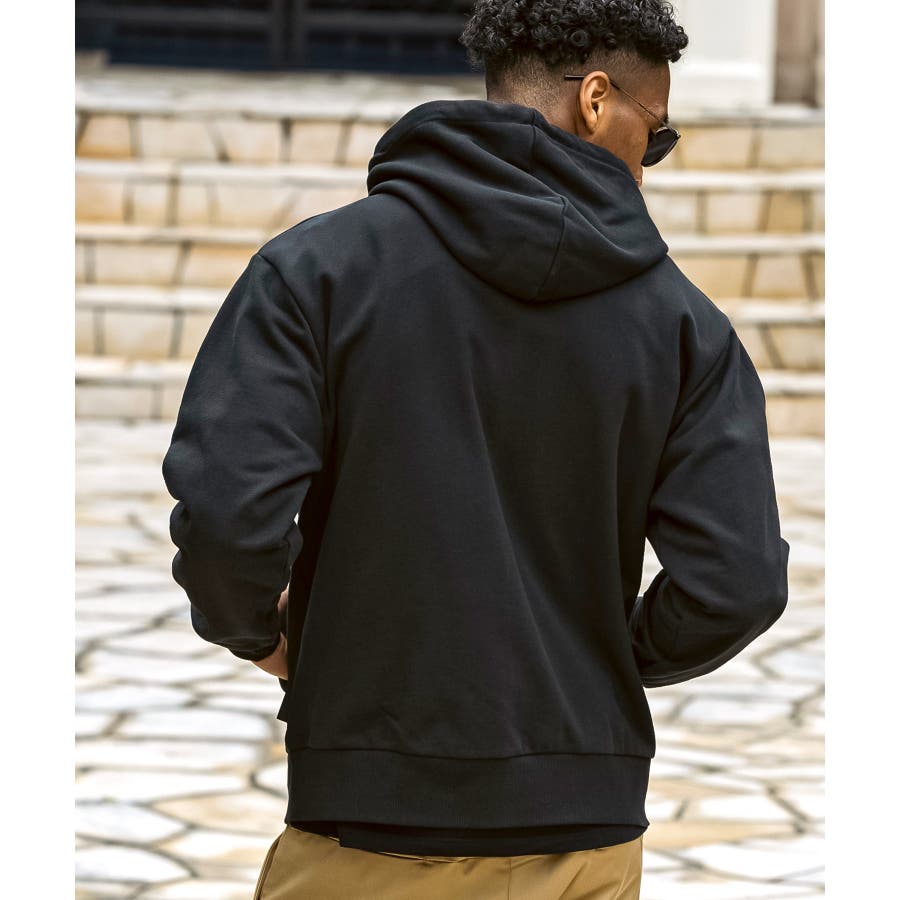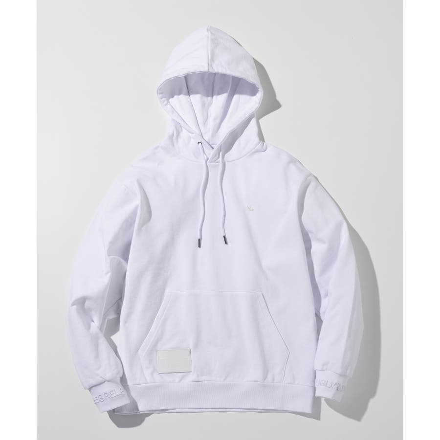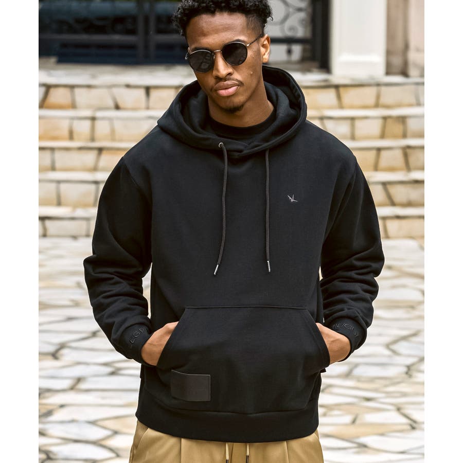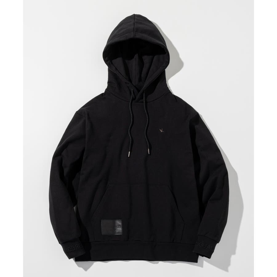 フェイクレザーに箔押しでブランドロゴを刻んだオリジナルのパッチがアクセントのプルフーディー。